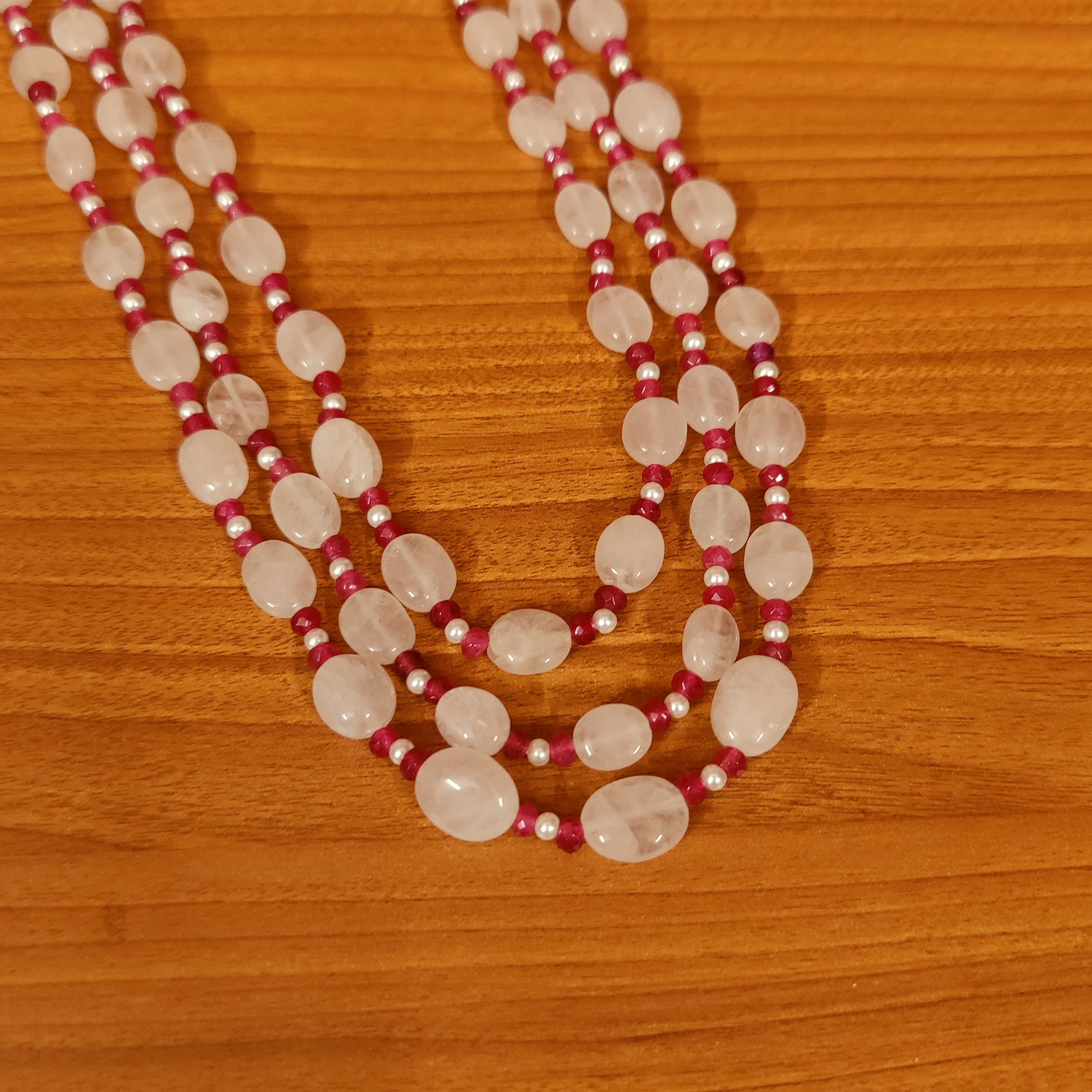 REAL ROSE QUARTZ GEM STONE 3 LAYERED NECKLACE SET