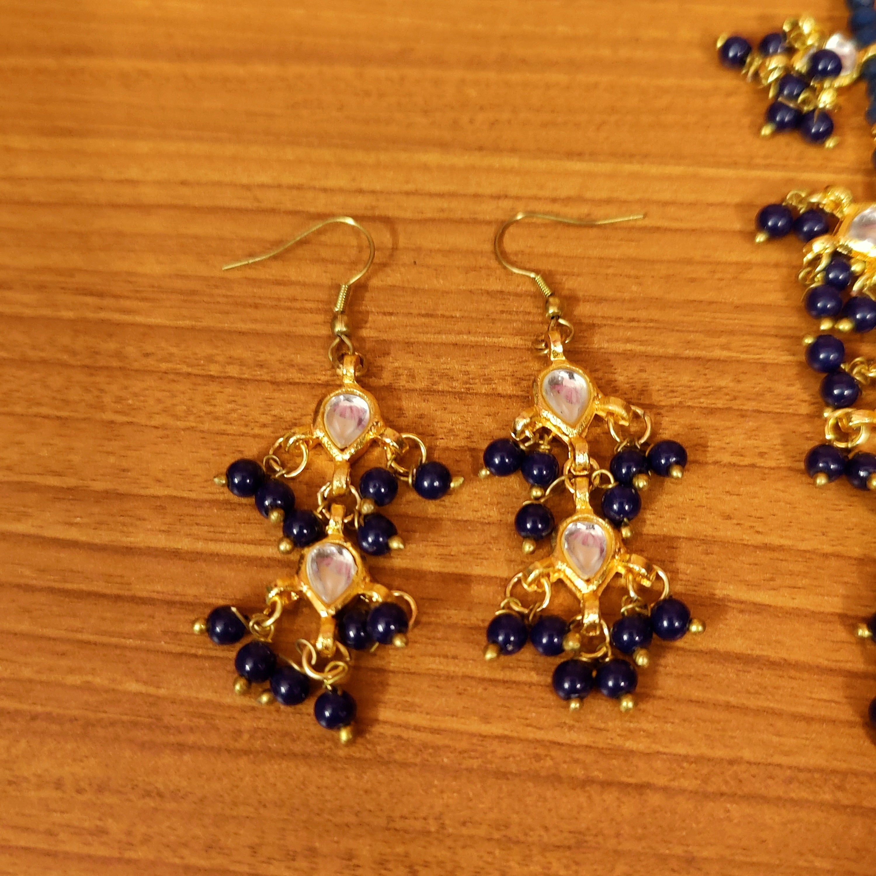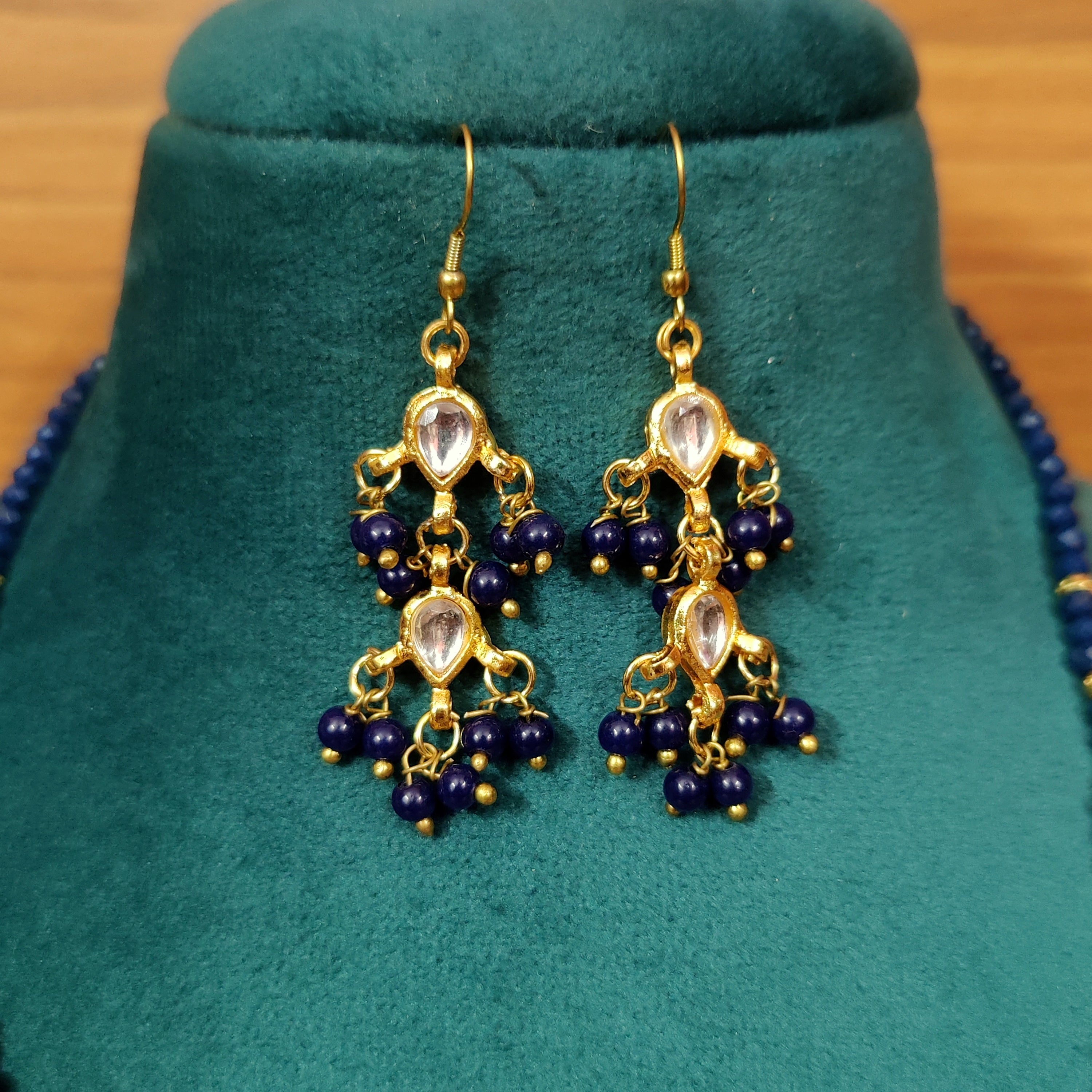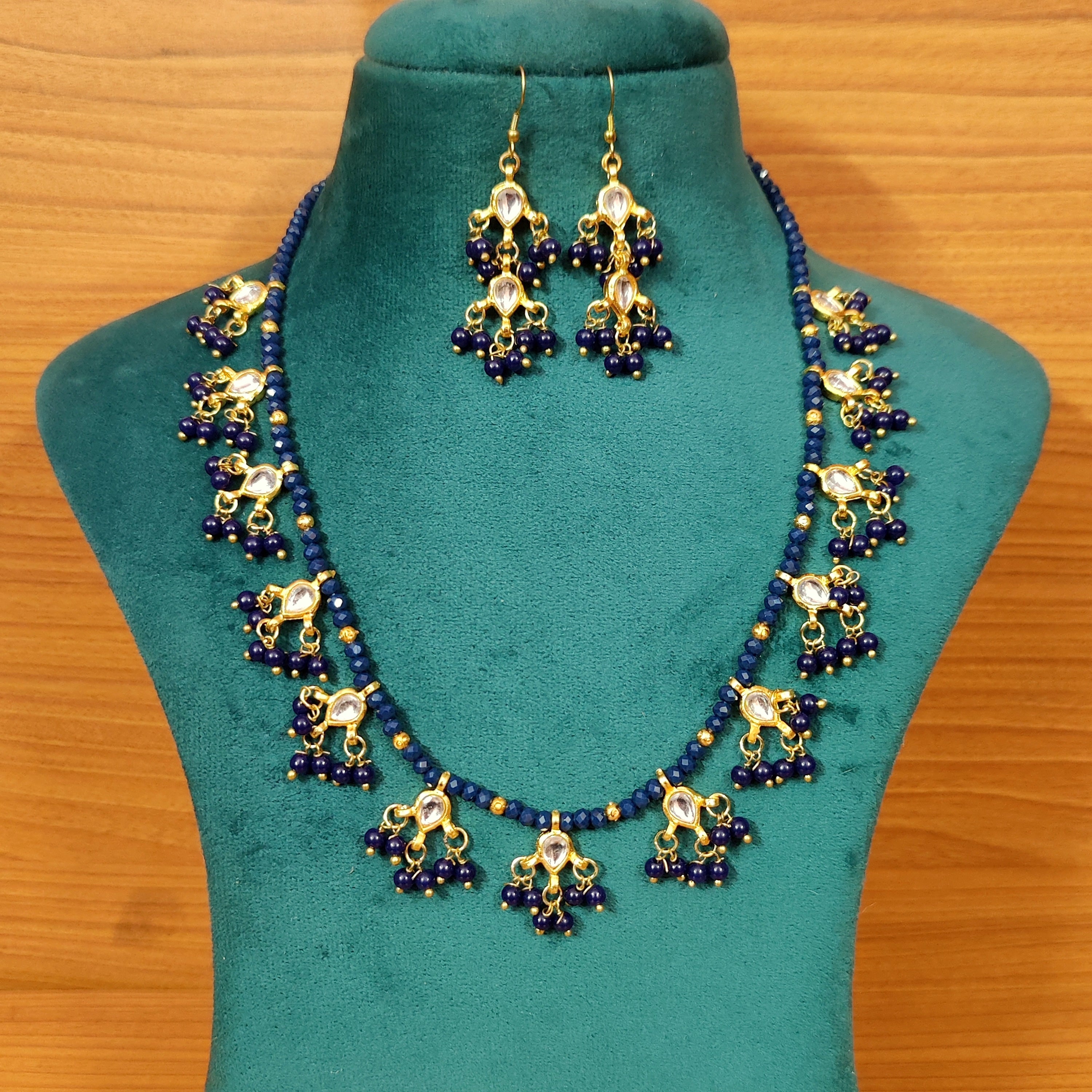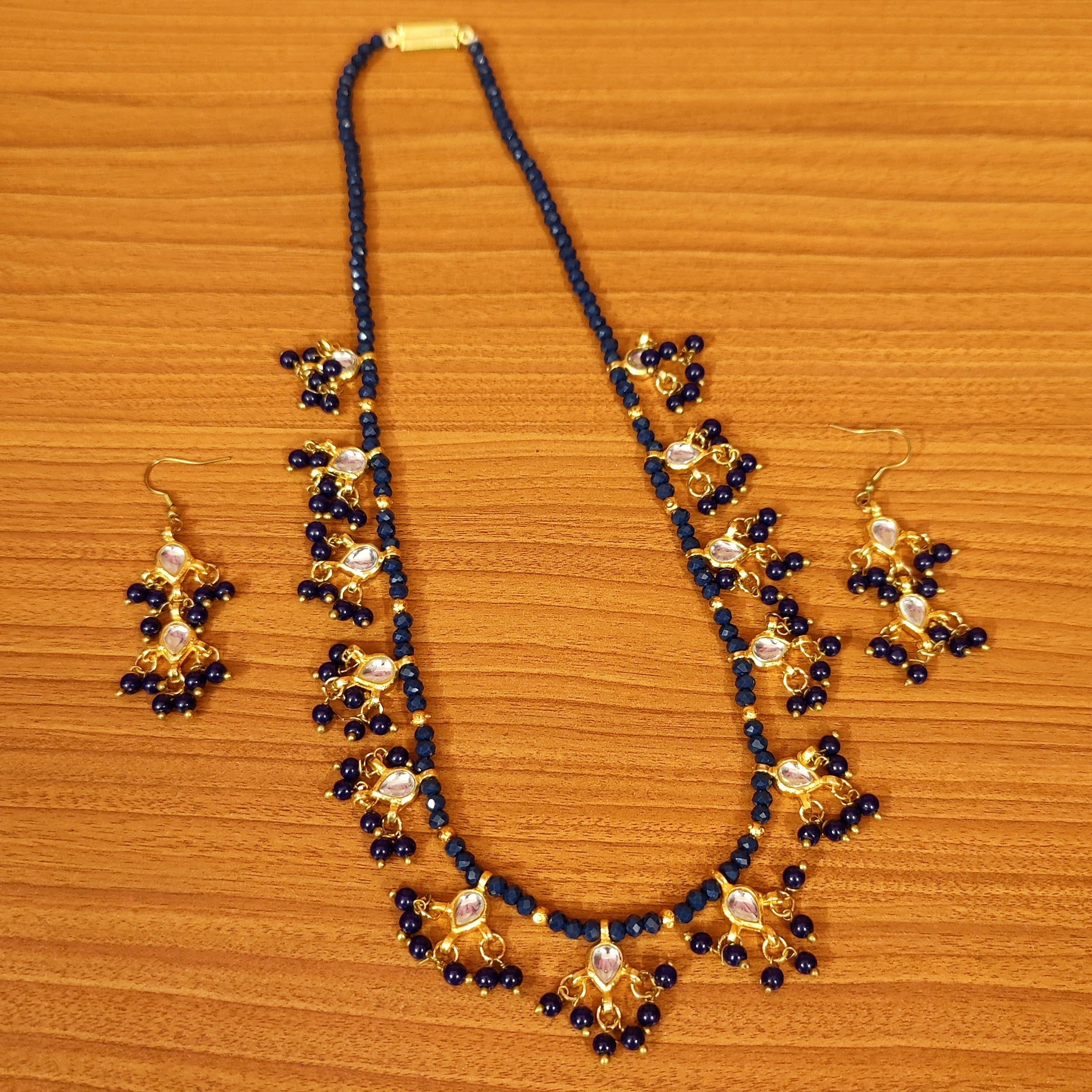 This kundan necklace set is handcrafted in with imitation grey crystal beads, pearls & kundan stones of very fine quality. This gorgeous necklace set is plated with 18kt fine nickle free gold rhodium that gives a unique look to the design. The necklace and the earrings are very light in weight and comes with an adjustable dori.