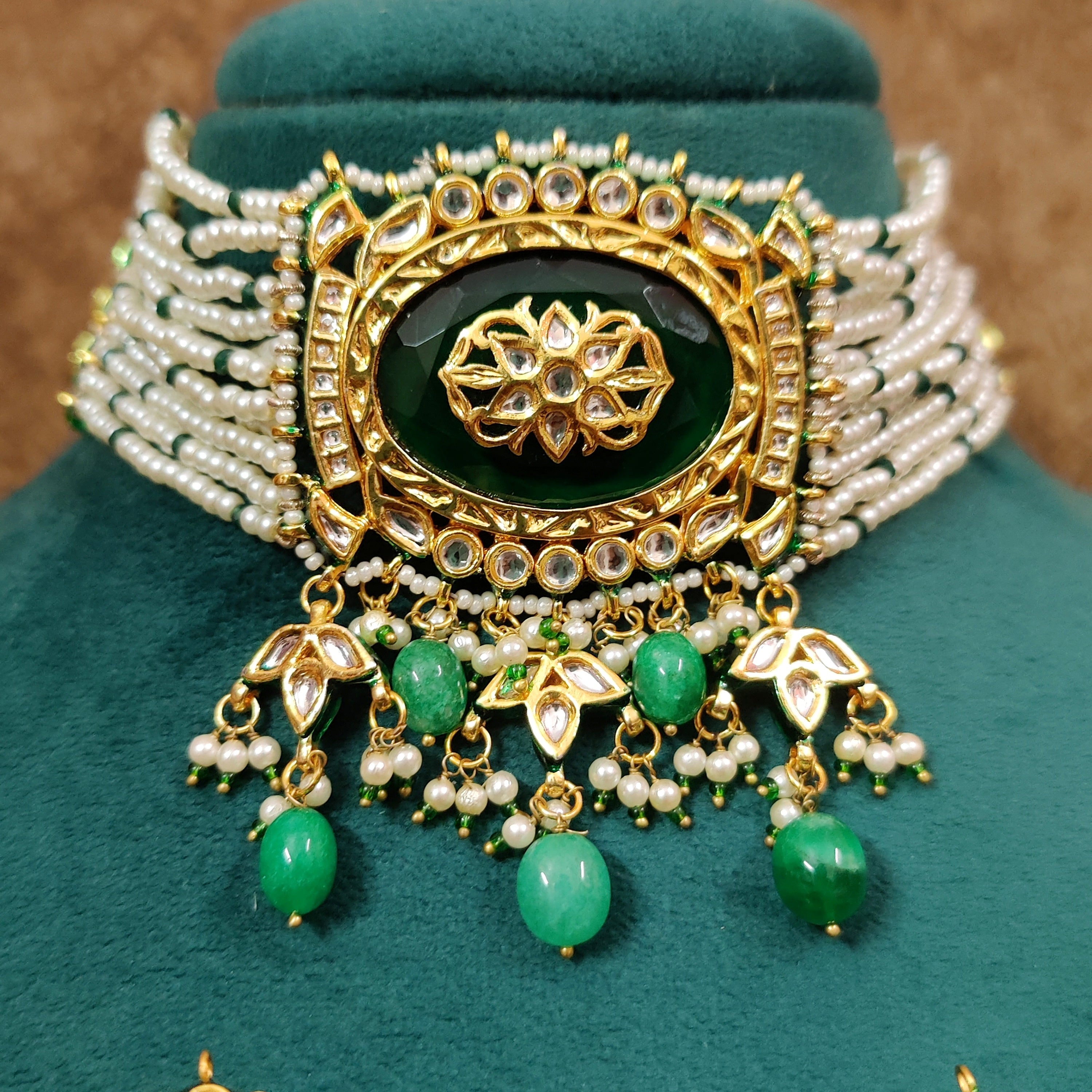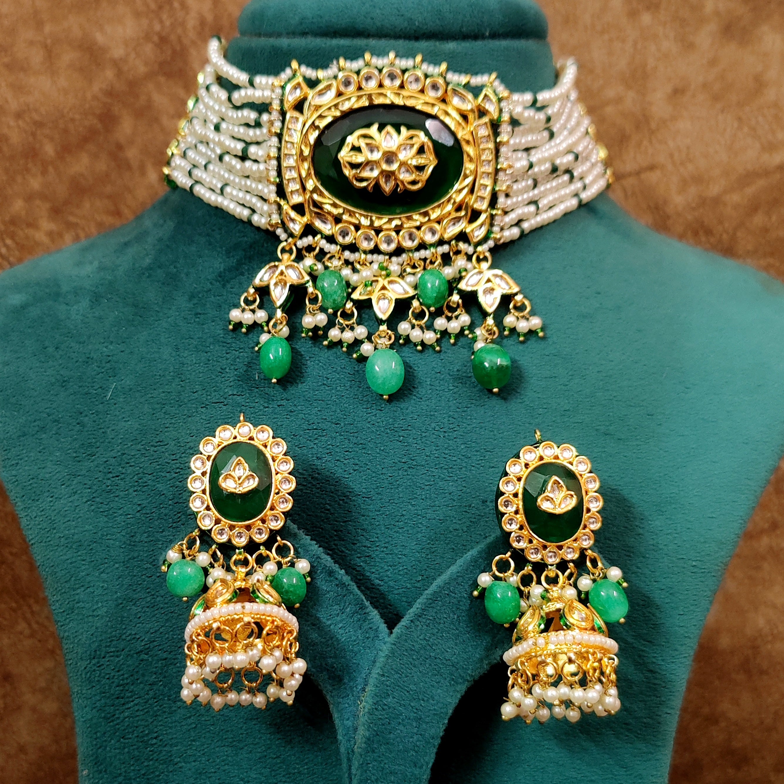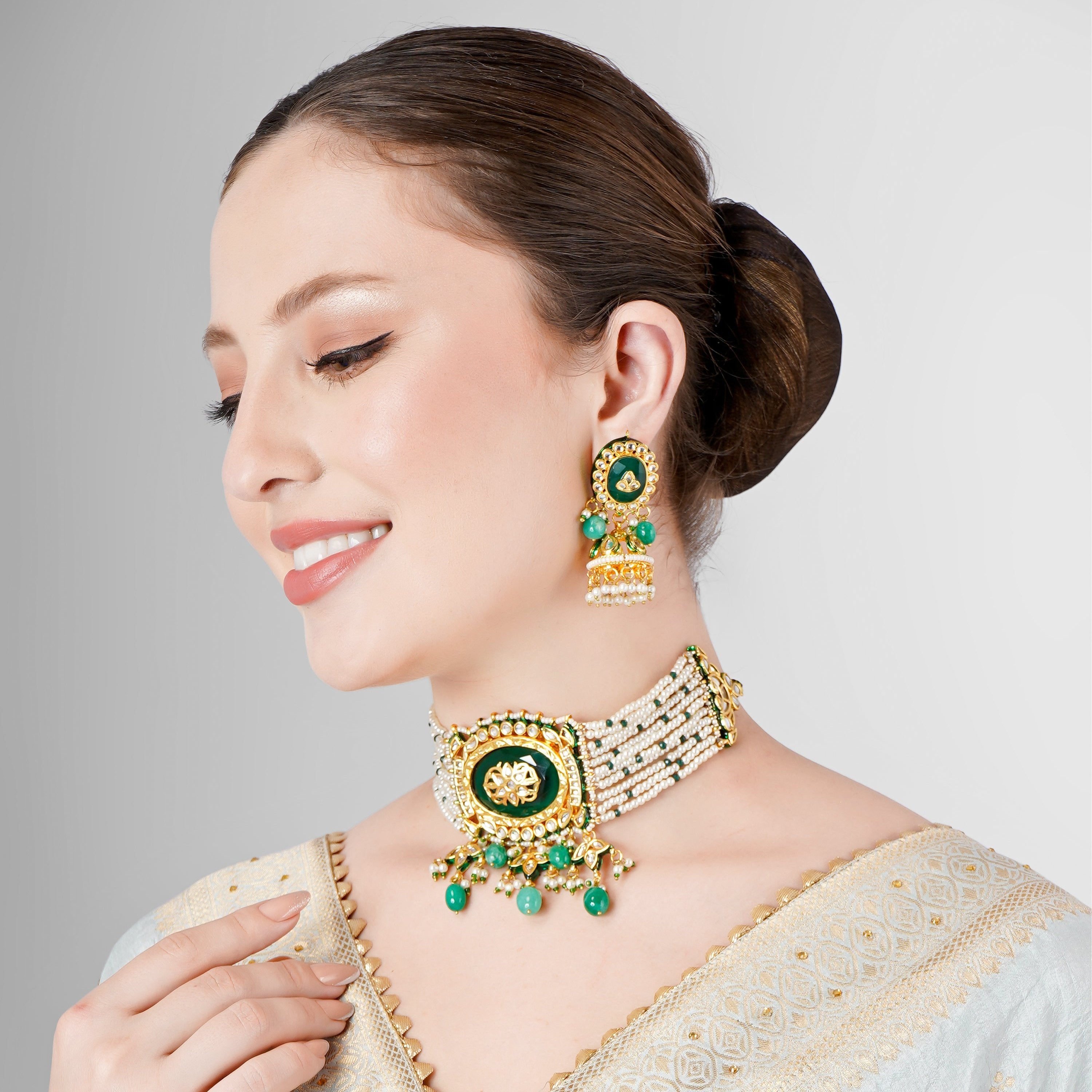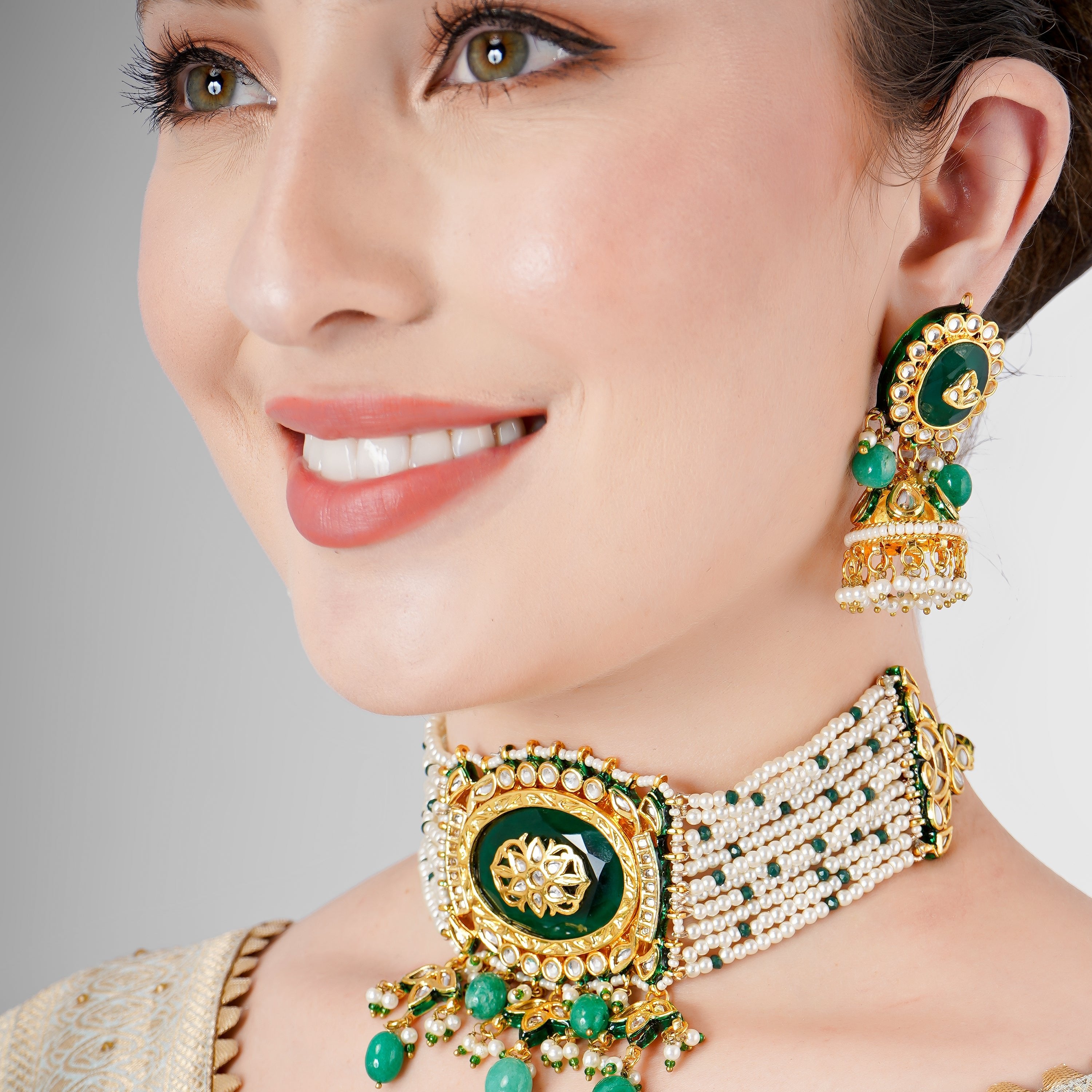 EMERALD KUNDAN POLKI & PEARL ROYAL CHOKER NECKLACE