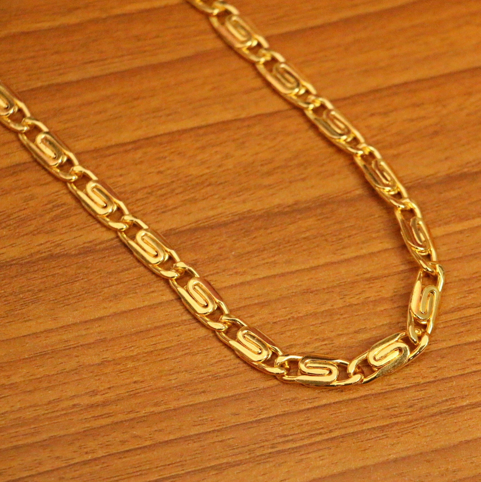 This gold look pattern men's chain is handcrafted in copper alloy with 18kt gold rhodium plating to give it a real gold look .