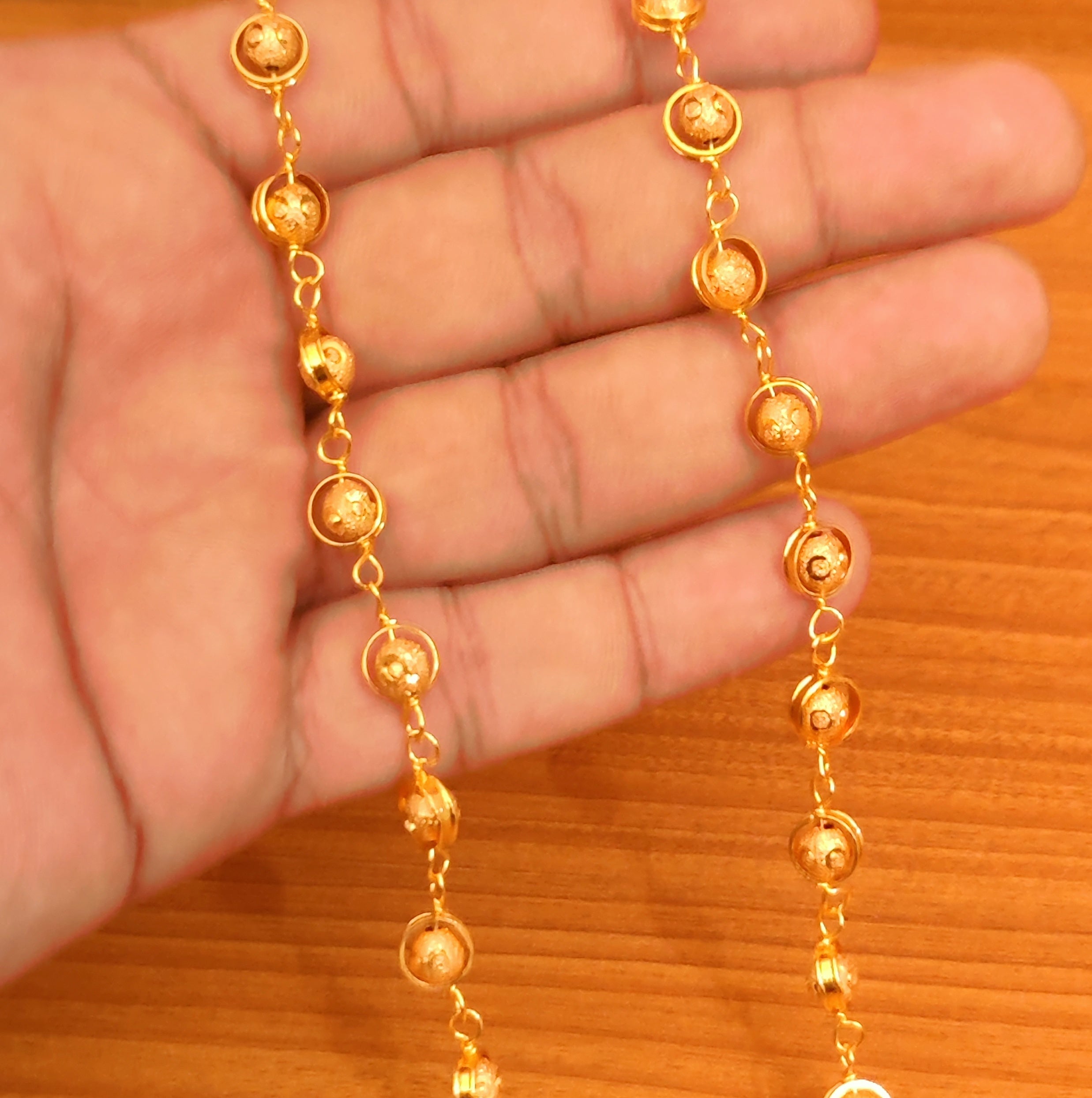 This beautiful necklace is handcrafted in copper alloy with imitation gold beads polki work of very fine quality . this necklace is coated with 18 kt gold polish which give them a unique look . an absolutely stunning piece to own and are very light in weight.