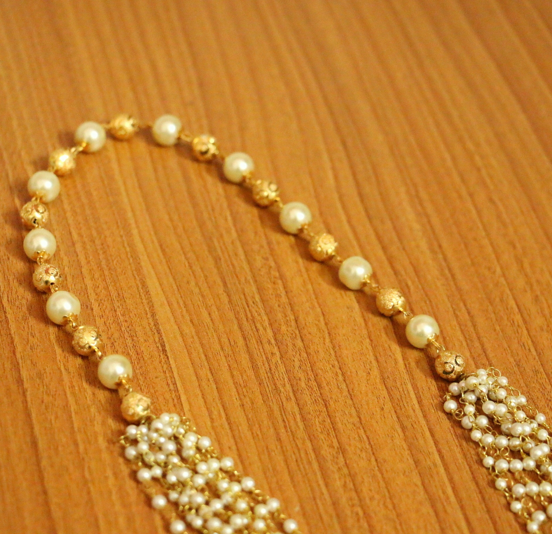These beautiful necklace set are handcrafted with pearls & gold beads of very fine quality. This necklace is coated with 18 kt gold polish . An absolutely stunning piece to own and are very light in weight.