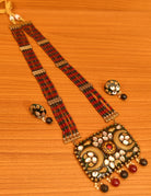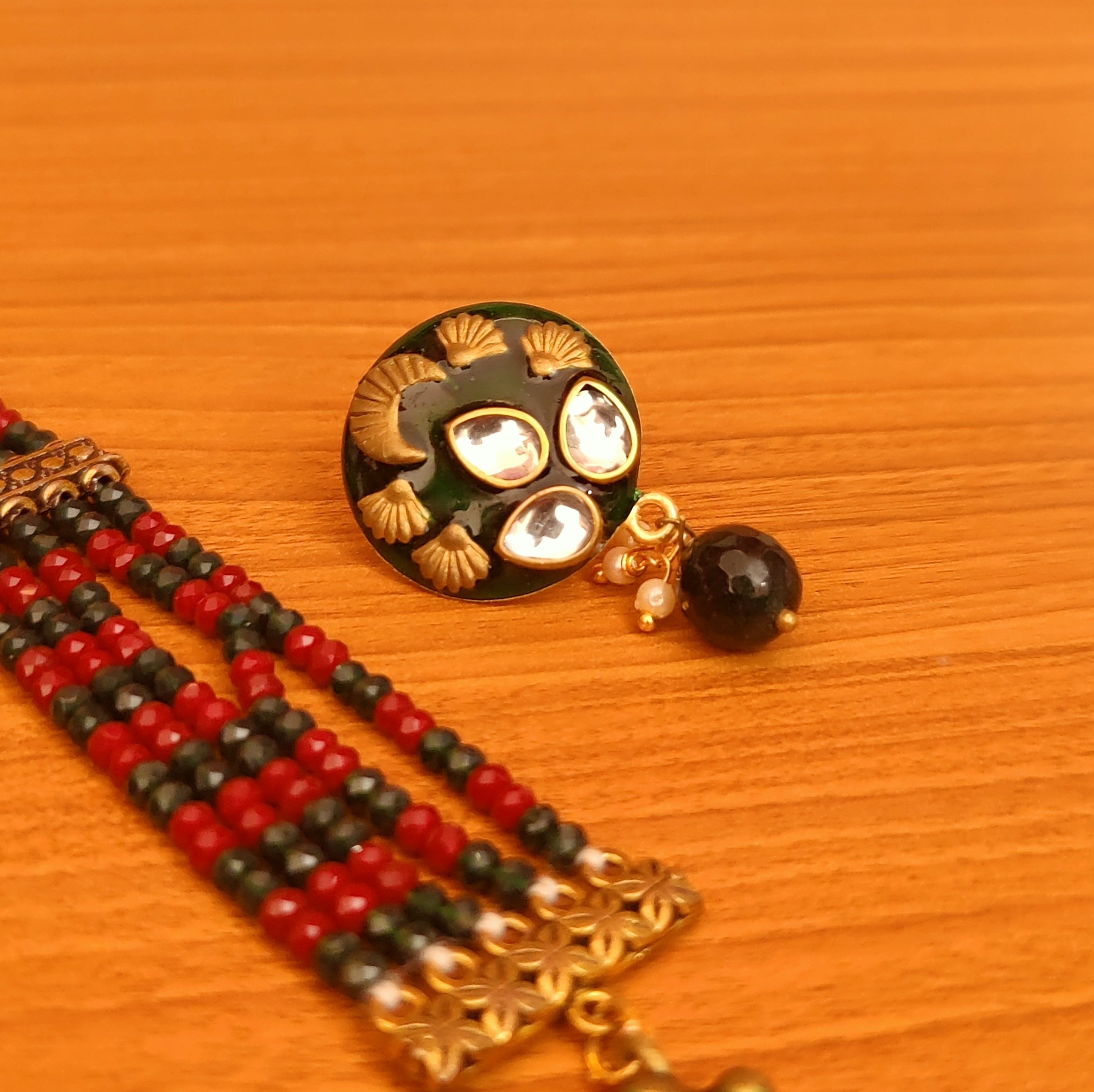 This kundan look necklace set is handcrafted in brass alloy with imitation red & green quartz beads and polki stones .the necklace set has a multi layered red green cystals & gold motif chain attached to it which makes it a perfect saree wear.