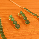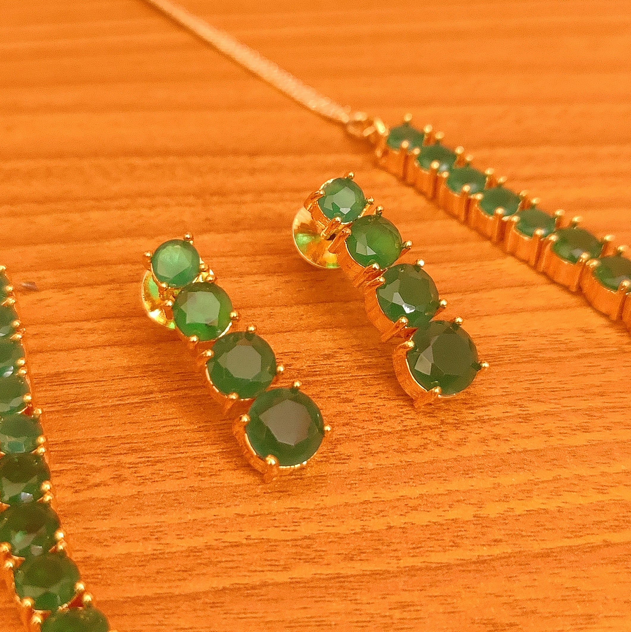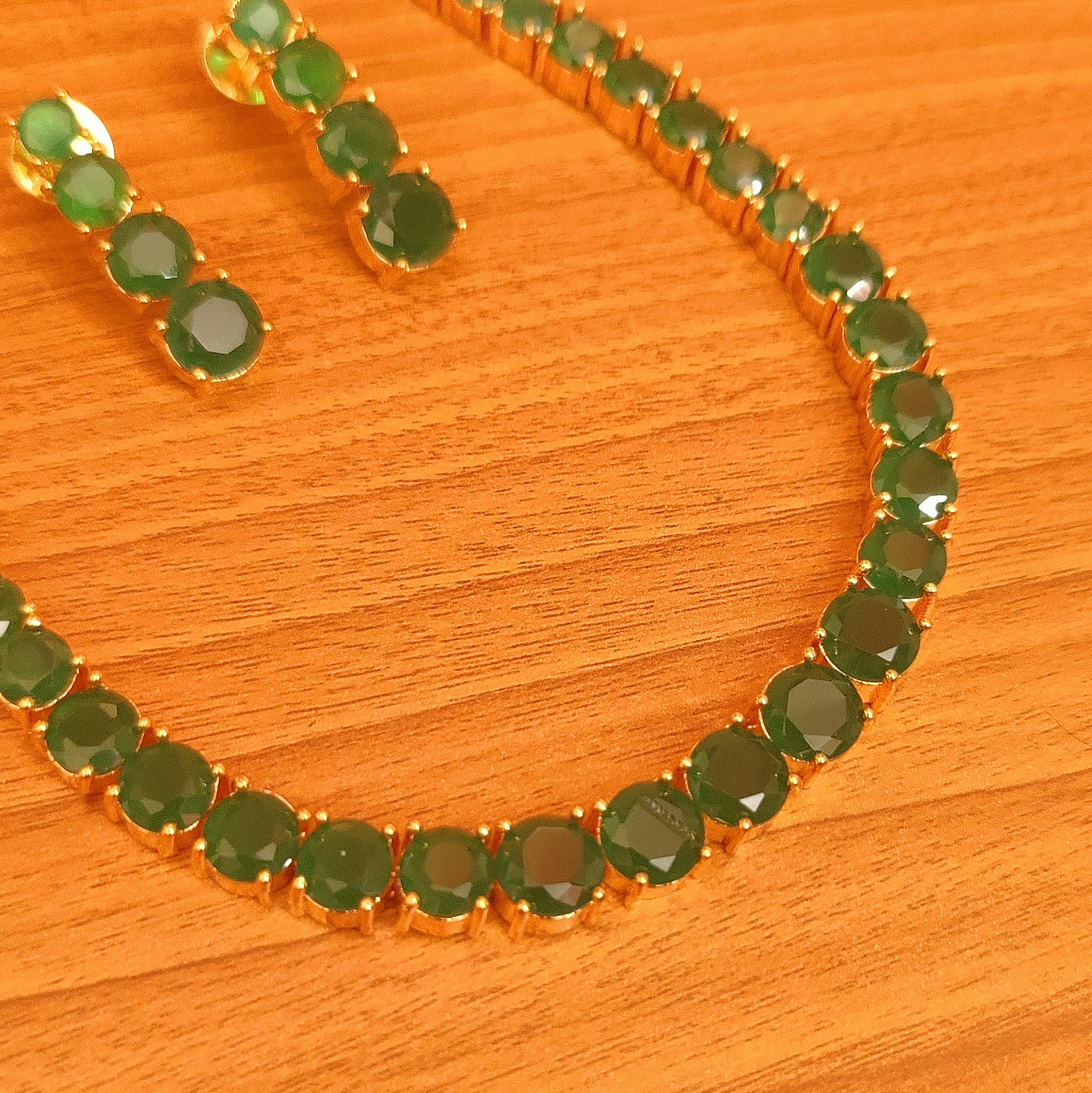 This Single Line Necklace Set Is Handcrafted In Silver Alloy With Imitation emerald Colour Quartz In Round Shape Of Very Fine Quality . This Necklace Set Is Coated With 18kt Gold Rhodium Plating That Gives A Real Gold Look . An Absolutely Stunning Piece To Own And Are Light In Weight.