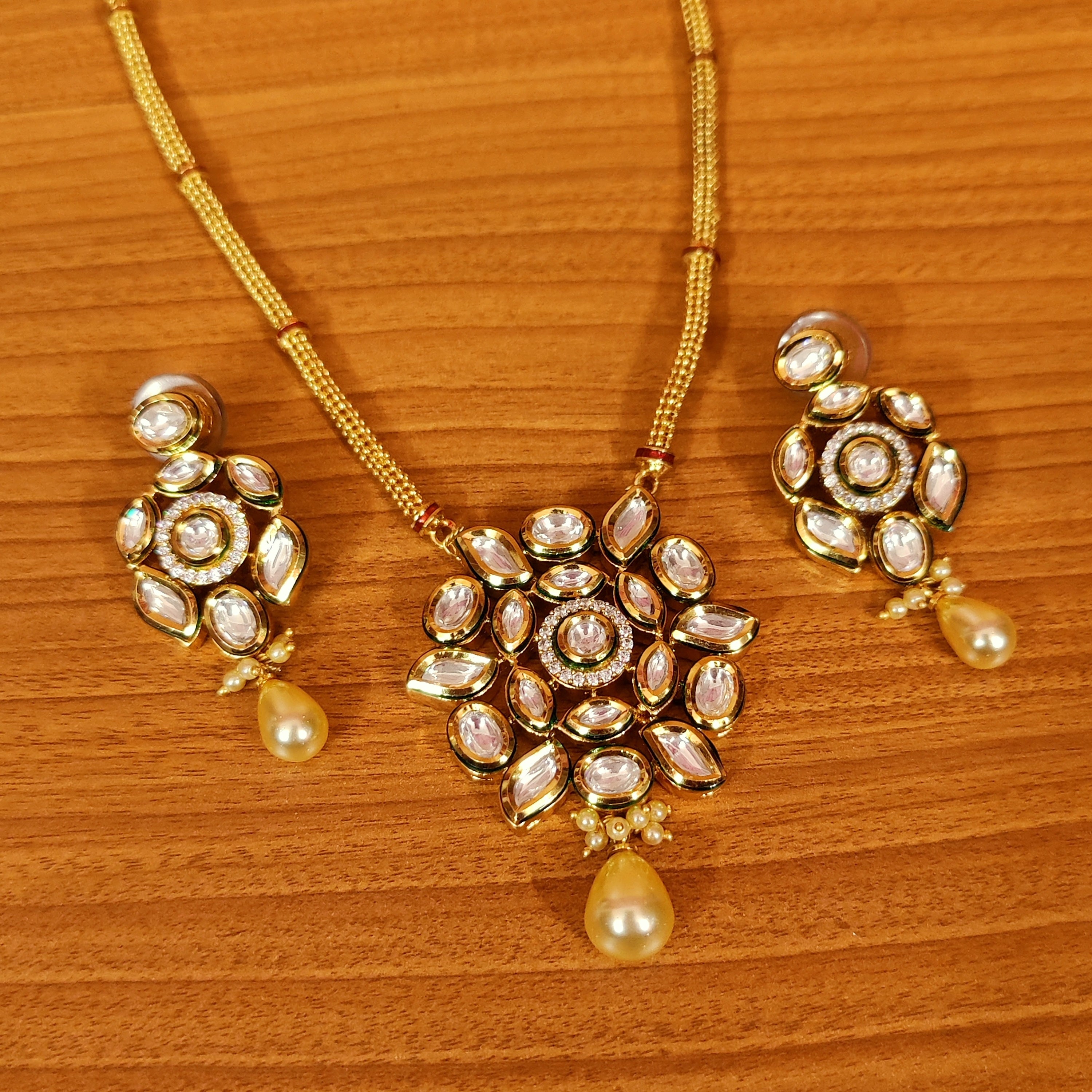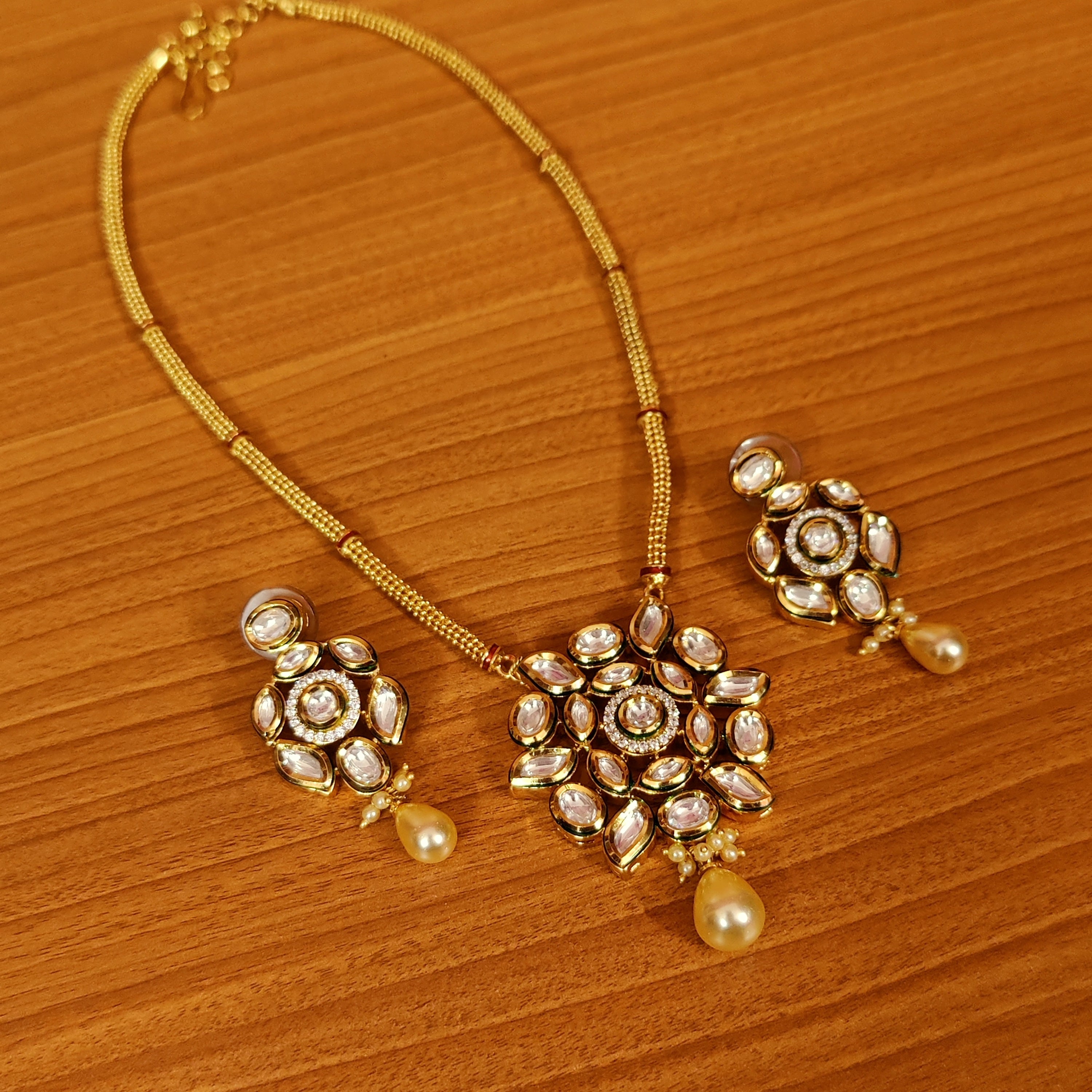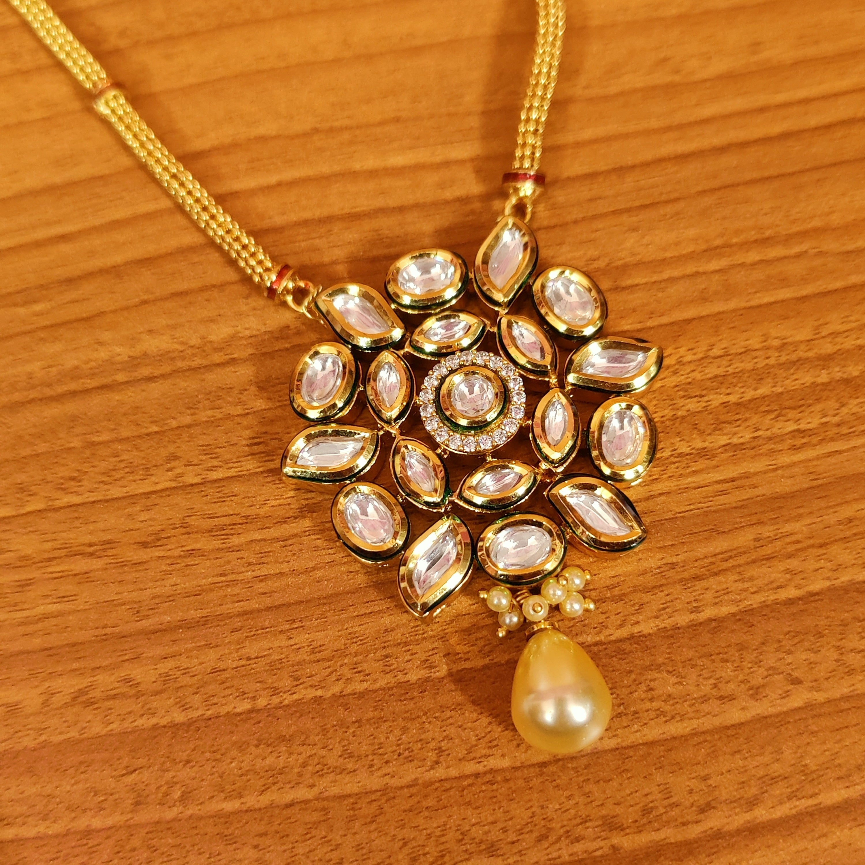 .This handcrafted beautiful pendant set Is made in silver alloy with imitation cz stone & pearls and kundan polki stone of extremely fine quality. This gorgeous pendant set is handcrafted with fine engravings done with hand and is plated 18kt nickle free gold rhodium that gives the design a real look . the pendant comes with a matching pair of earrings which are absolutely gorgeous and are very light in weight.