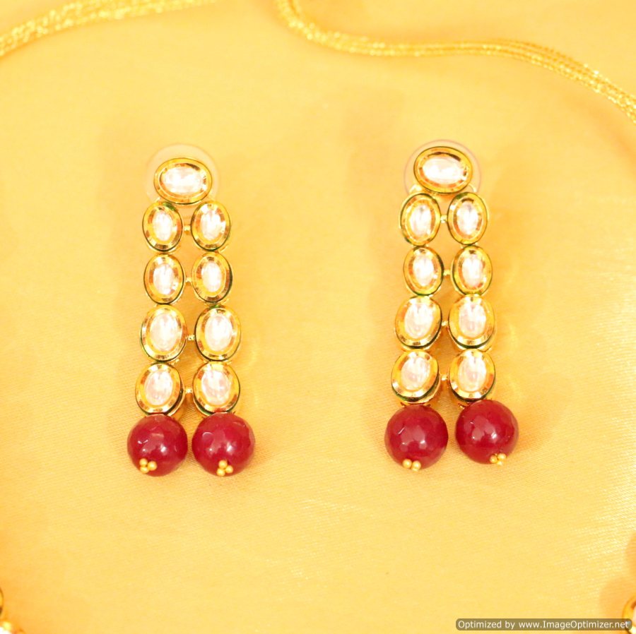 This beautiful necklace set is handcrafted in silver alloy of very fine quality with imitation kundan of very fine quality along with intricate meenakari work done behind the necklace as well as earrings.  This necklace set is coated with 18 kt gold polish which give them a unique look . An absolutely stunning piece to own and are very light in weight.