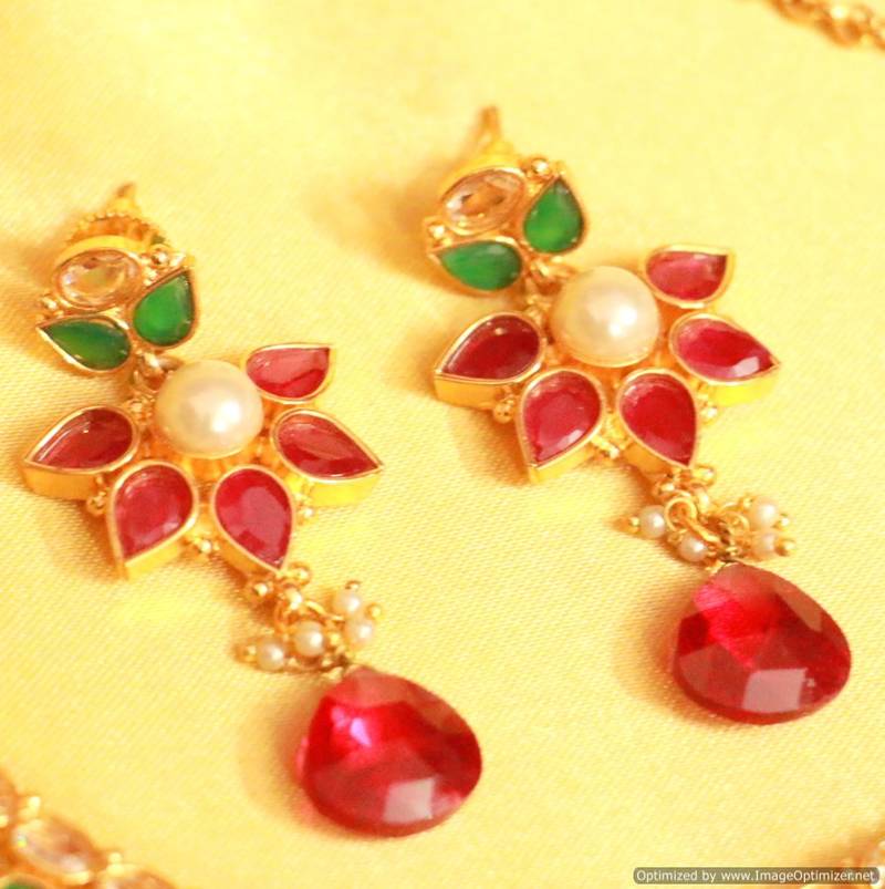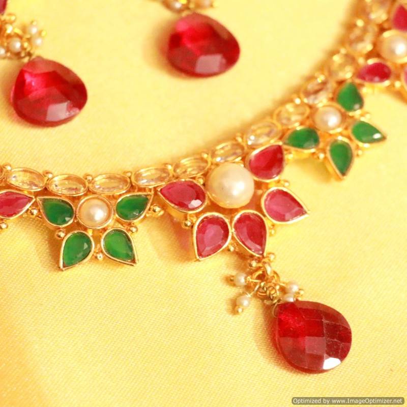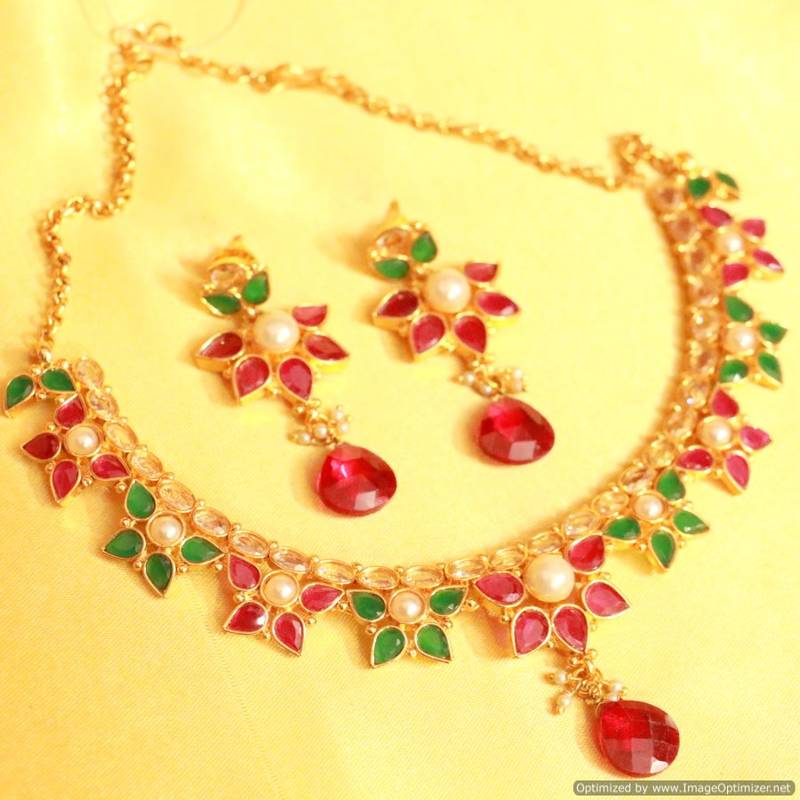 This beautiful necklace set is handcrafted in copper alloy of very fine quality with imitation ruby,onyx & pearls of very fine quality. This necklace set is coated with 18 kt gold polish which give them a unique look . An absolutely stunning piece to own and are very light in weight. *All Jewelry is completely inspected for every crystal and bead before we send it out,each piece is carefully packaged to reach you safely. and comes in a BOX.*
