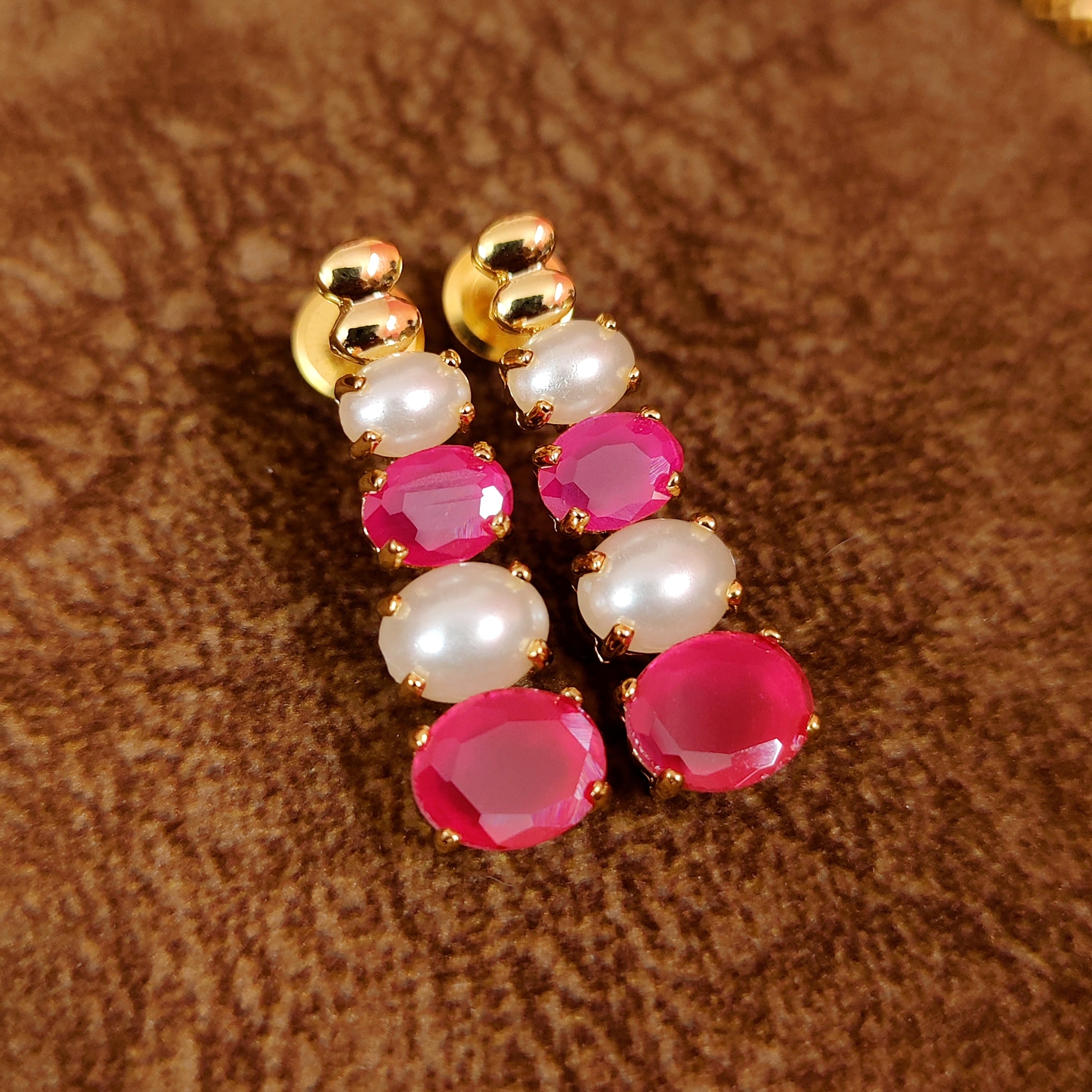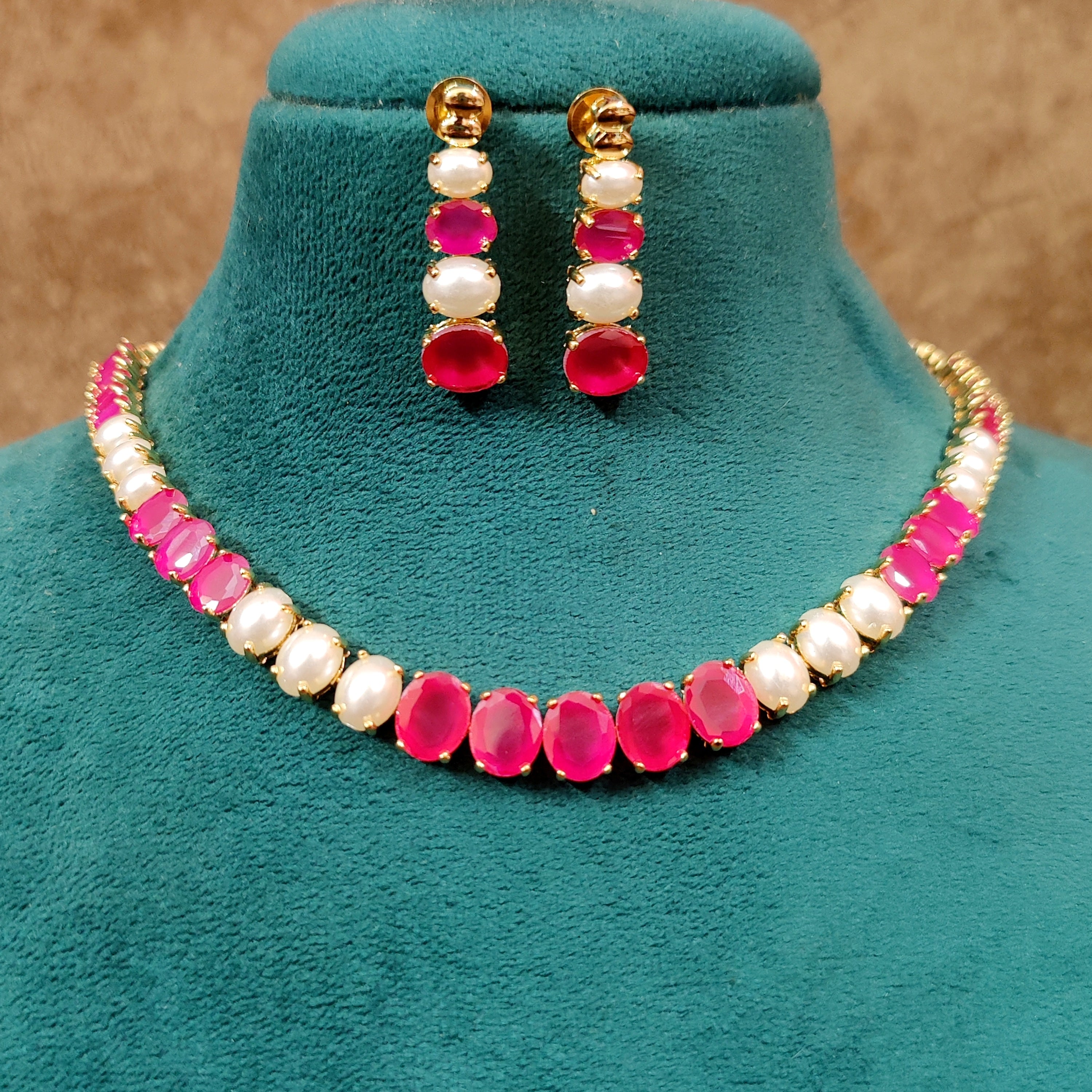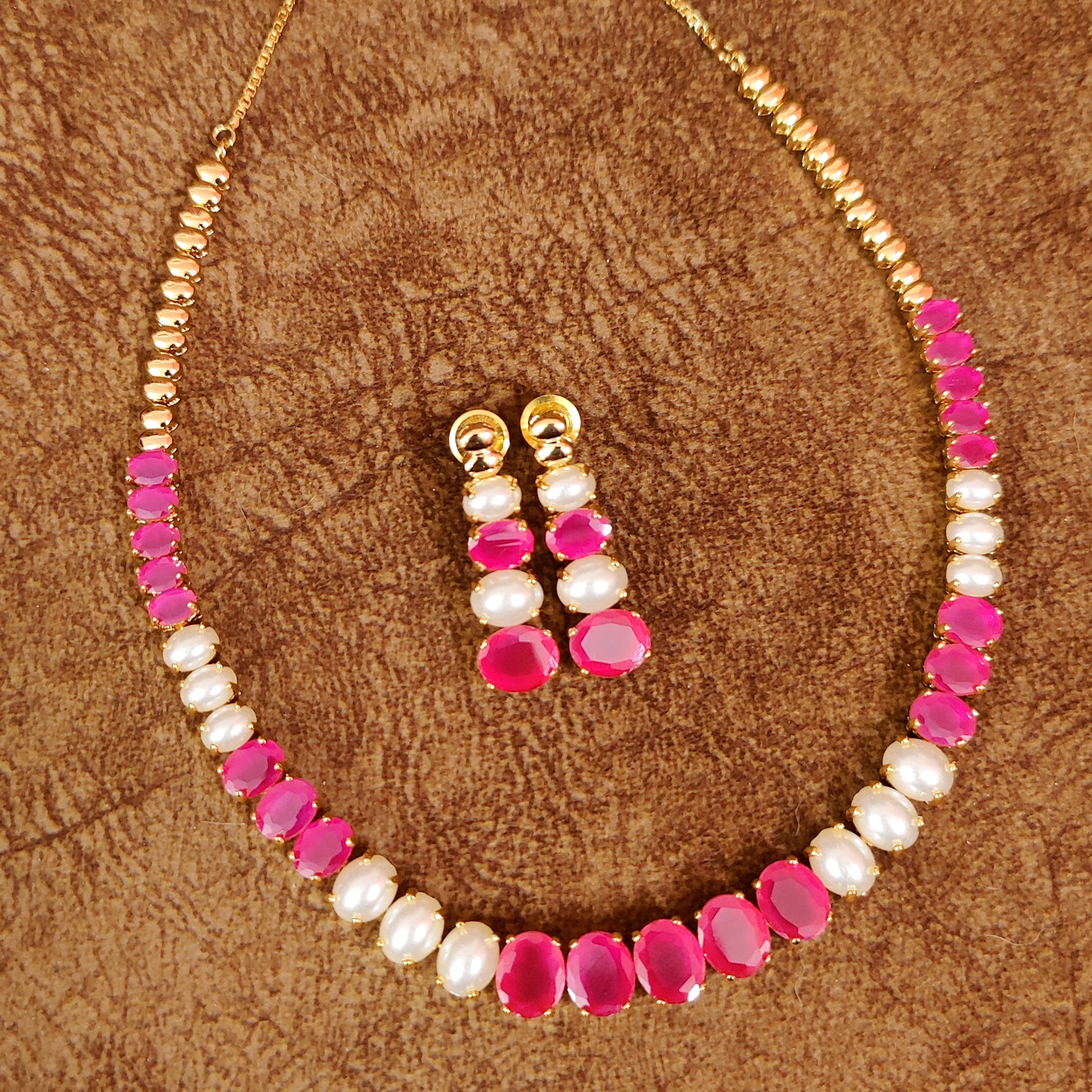 RUBY & PEARL SINGLE LINE GOLD PLATED NECKLACE SET
