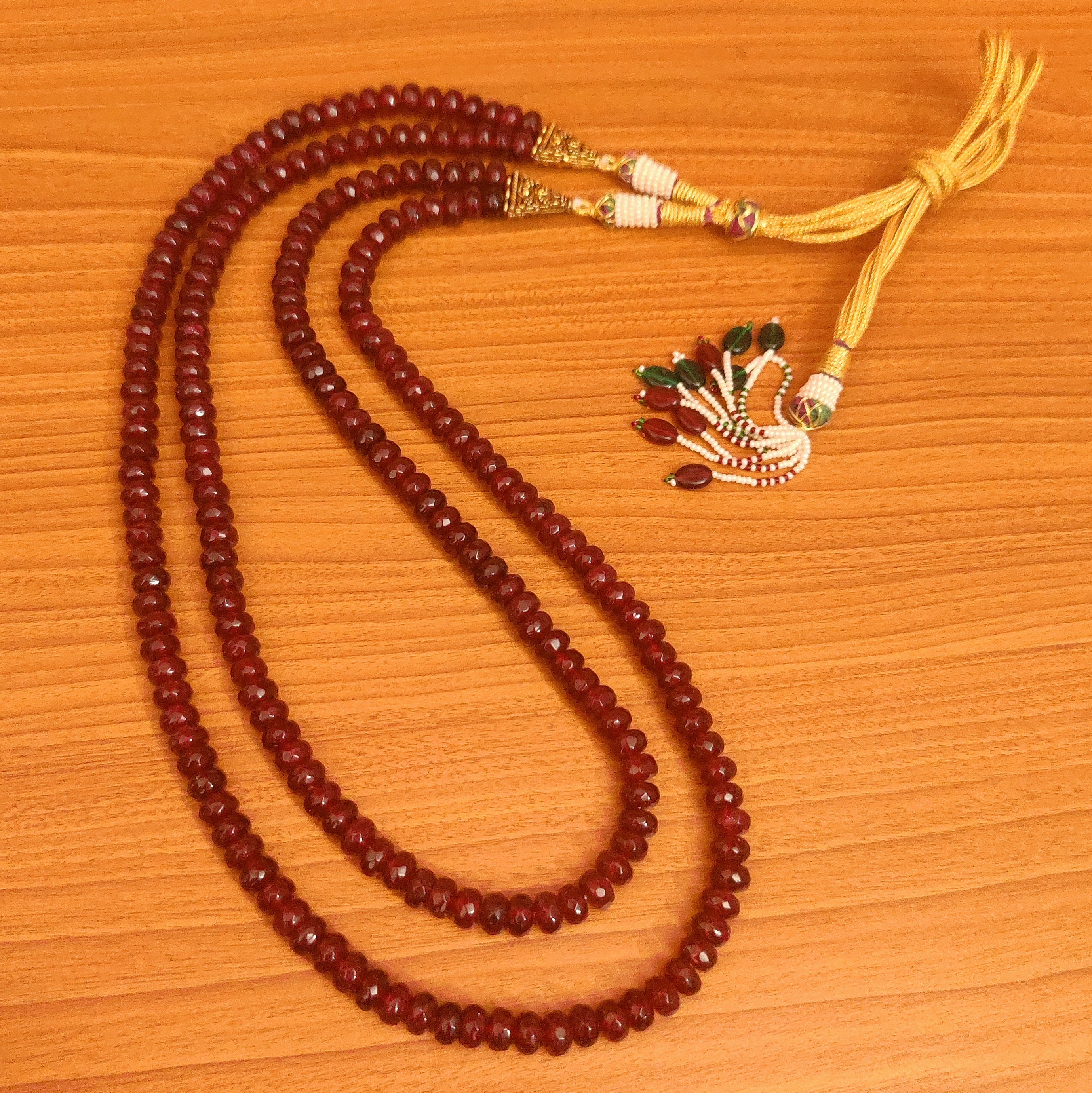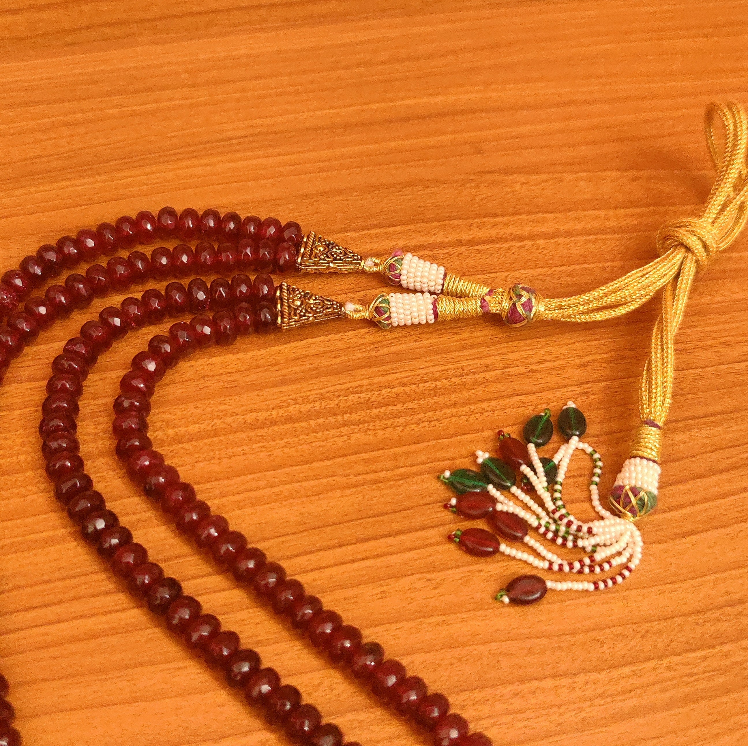 This necklace is handcrafted in brass alloy with imitation real ruby bead work of very fine quality , the necklace is plated with 18 kt nickle free gold plating which gives it a real look .
