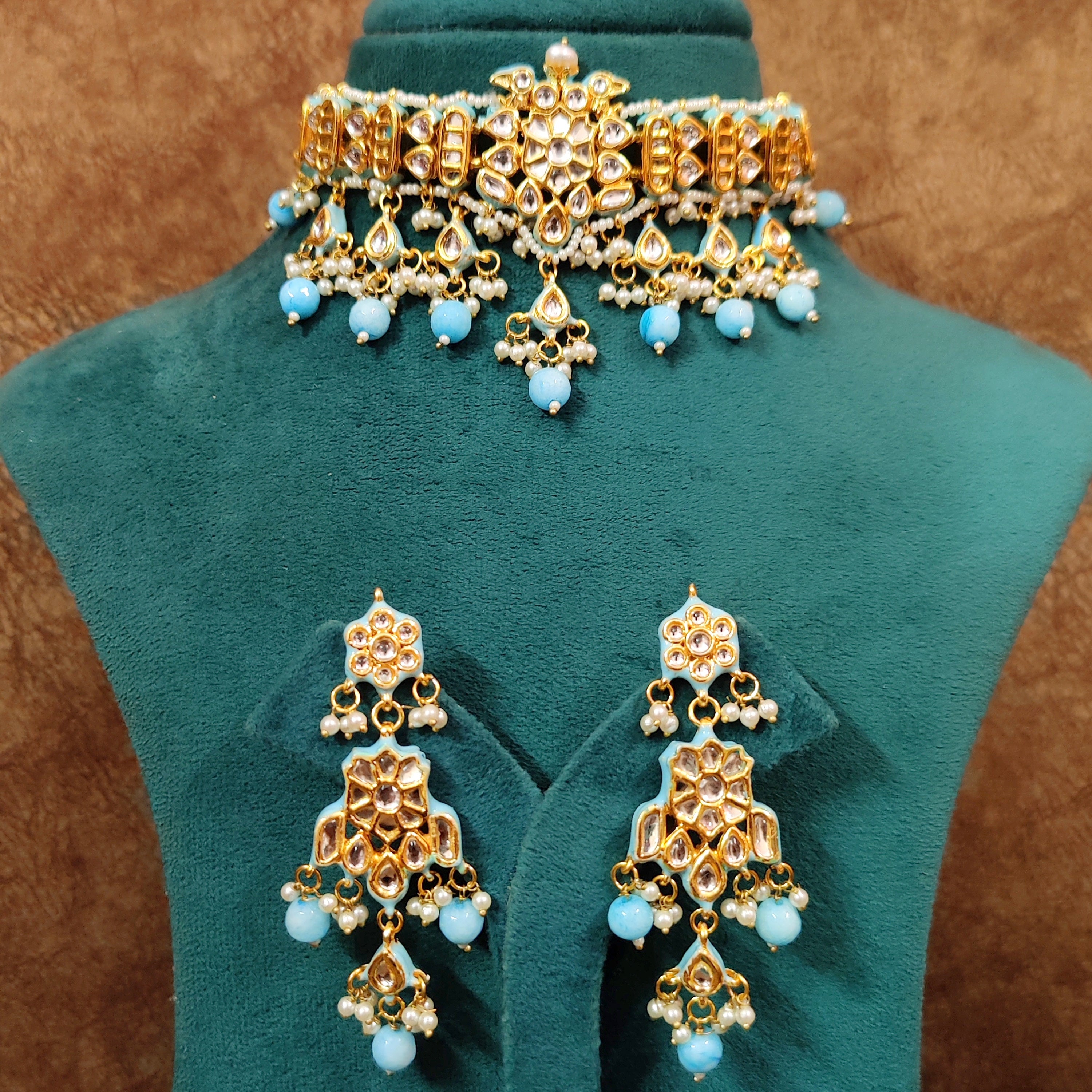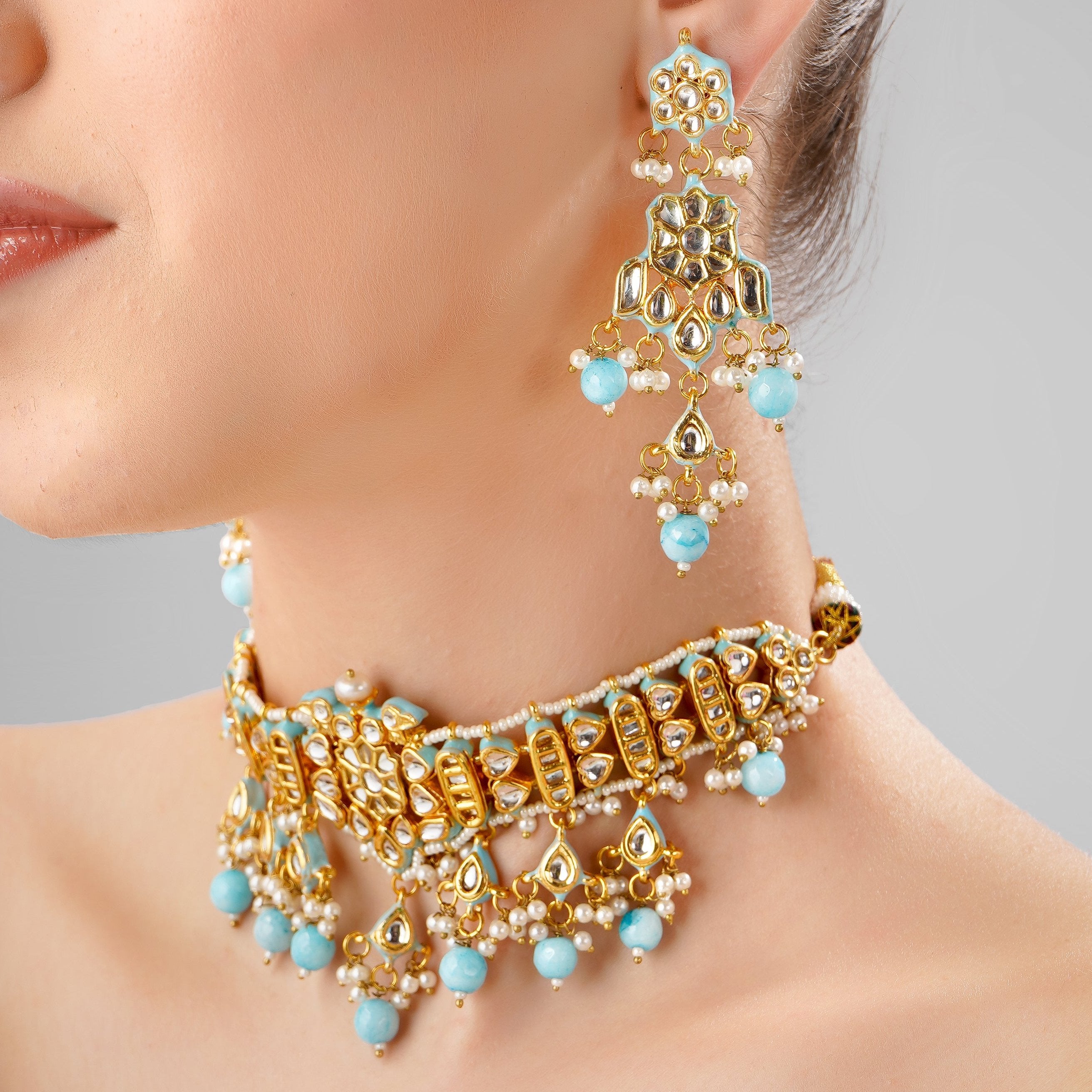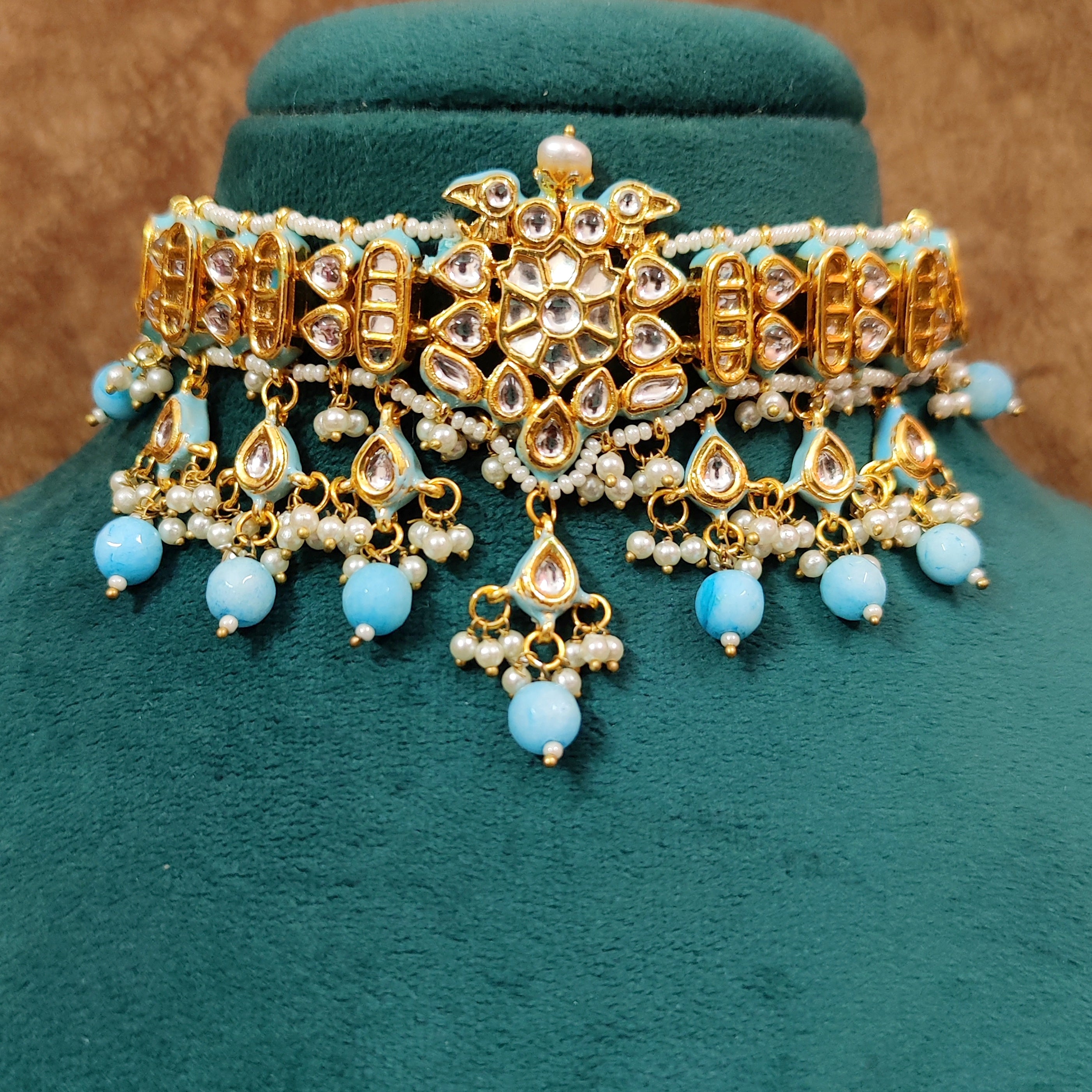 TURQUOISE KUNDAN POLKI GOLD PLATED CHOKER SET