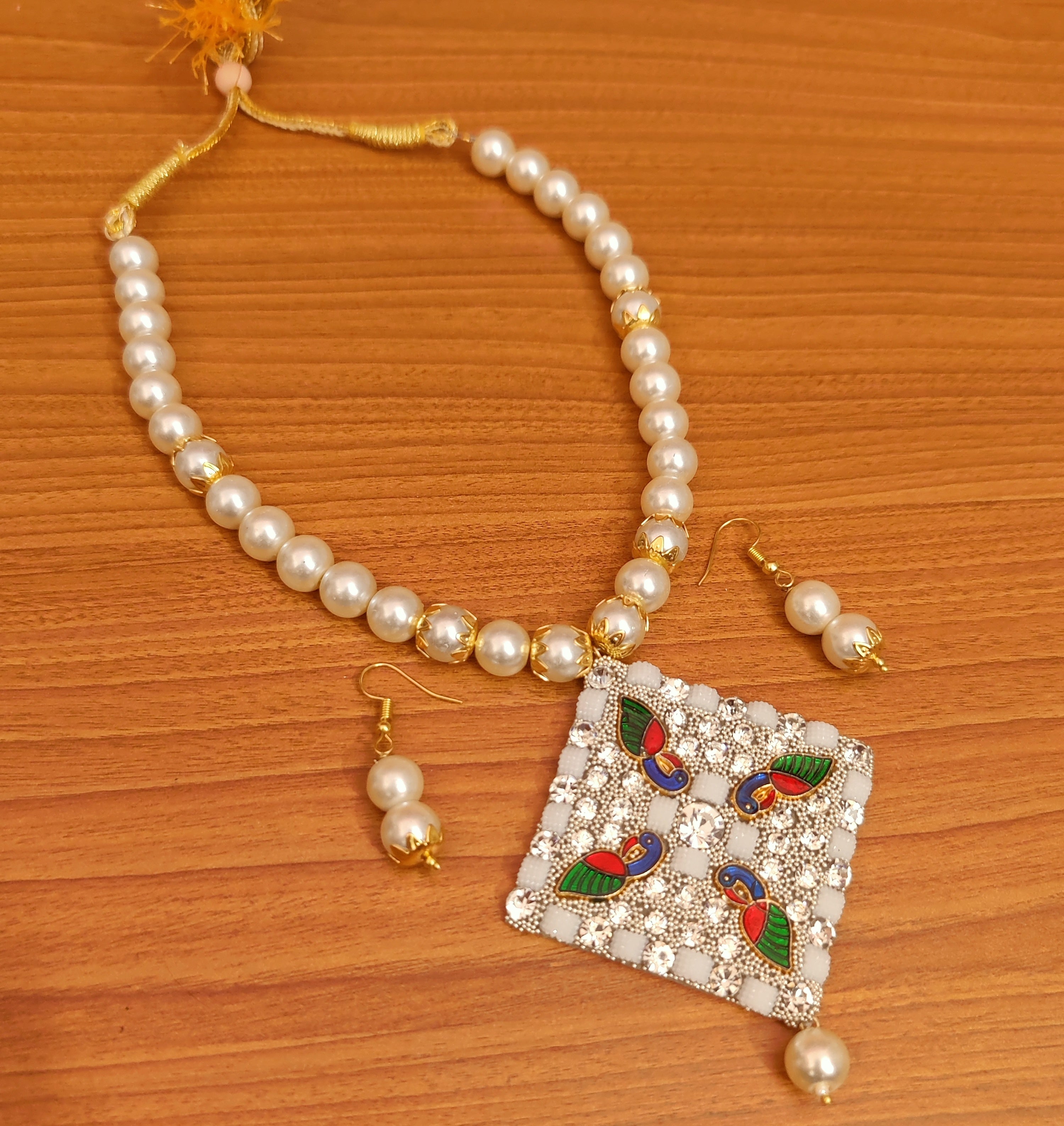 This imitation necklace set is handcrafted in copper alloy with imitation white colour perls & beads of very fine quality . This necklace set is plated with gold plating and is light in weight.