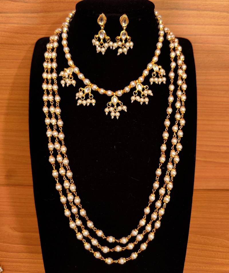 MULTILAYERED GOLD PLATED KUNDAN & PEARL NECKLACE SET