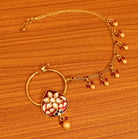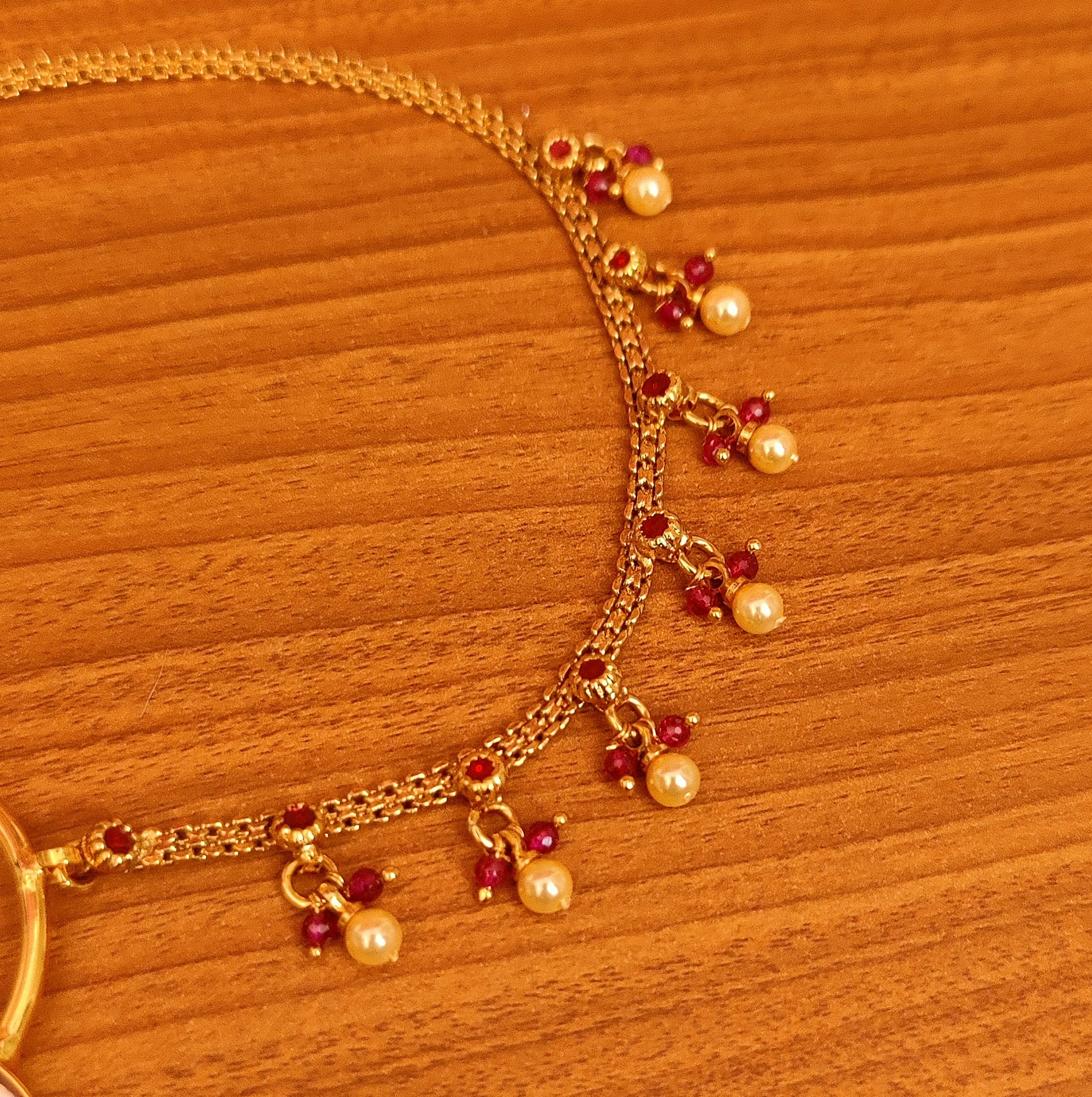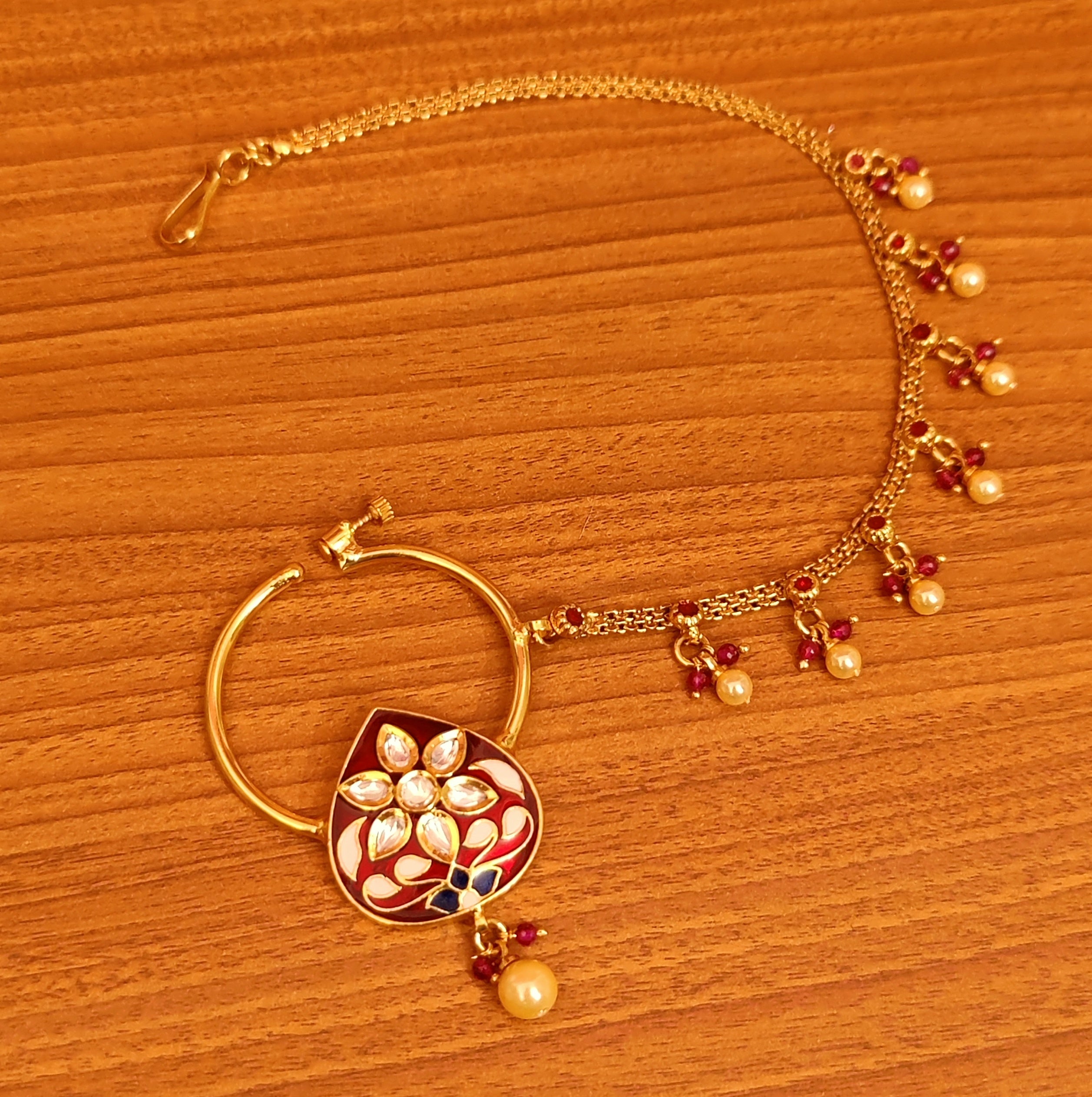 This beautiful nose ring is handcrafted in brass alloy with imitation semi precious red colour beads & pearls and kundan with meenakari work of very fine quality . this nose ring is coated with 18 kt gold polish which give it a real look . an absolutely stunning piece to own and is very light in weight.