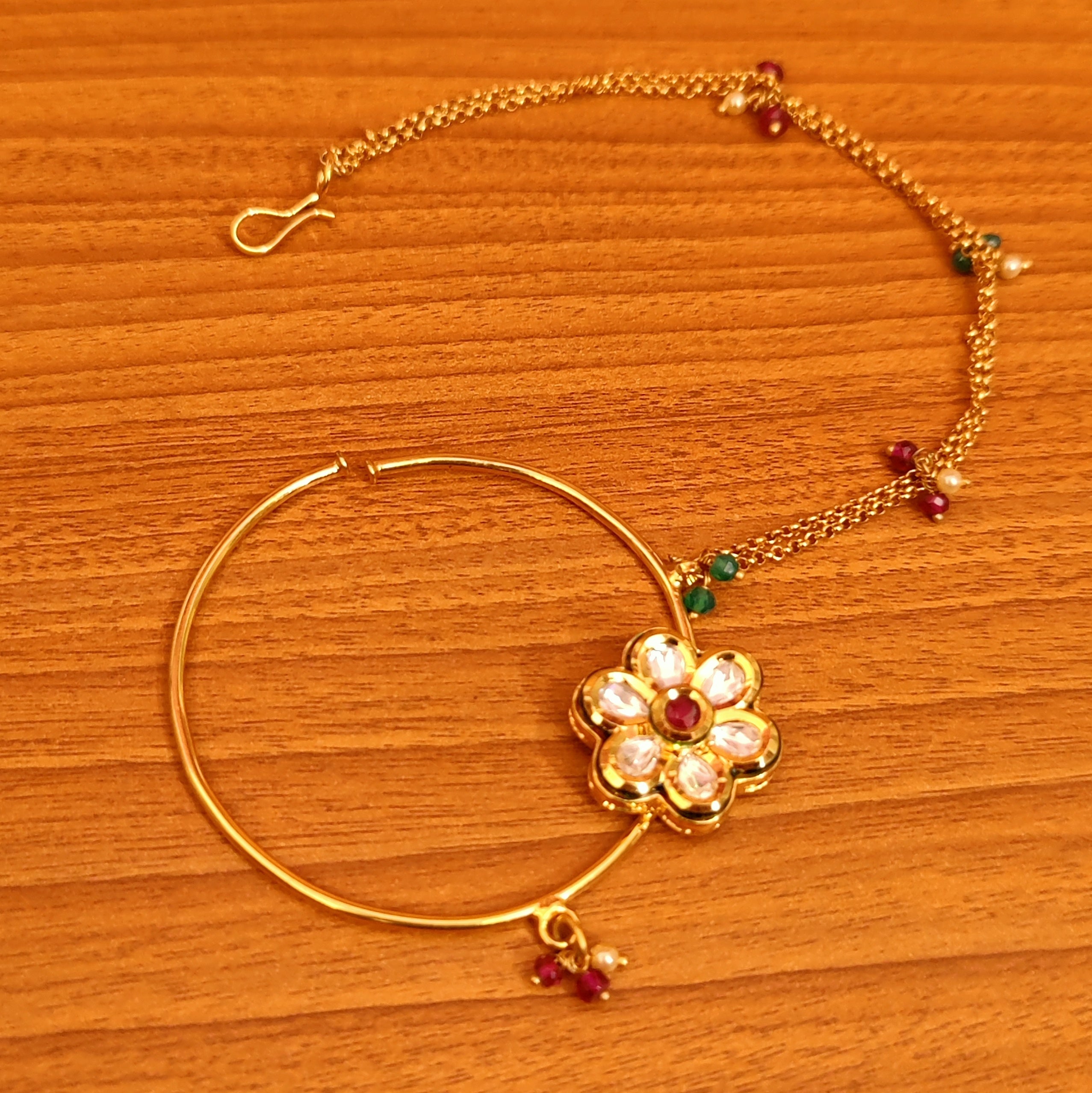 This beautiful nose ring is handcrafted in brass alloy with imitation red colour stone & multi layered and kundan with meenakari work of very fine quality . this nose ring is coated with 18 kt gold polish which give it a real look . an absolutely stunning piece to own and is very light in weight.