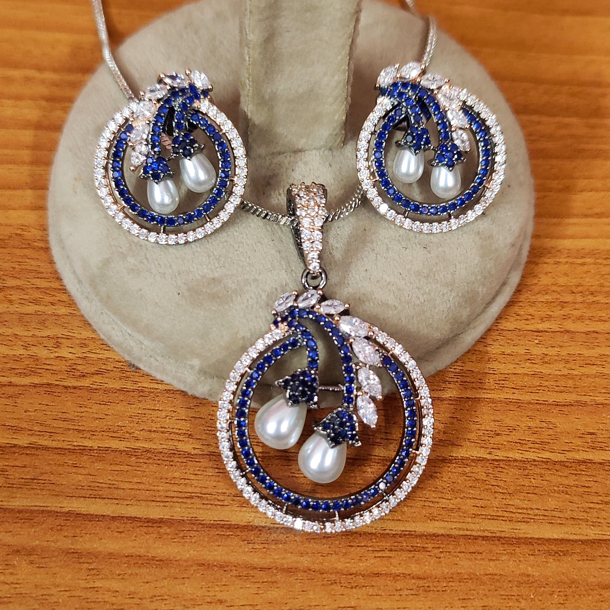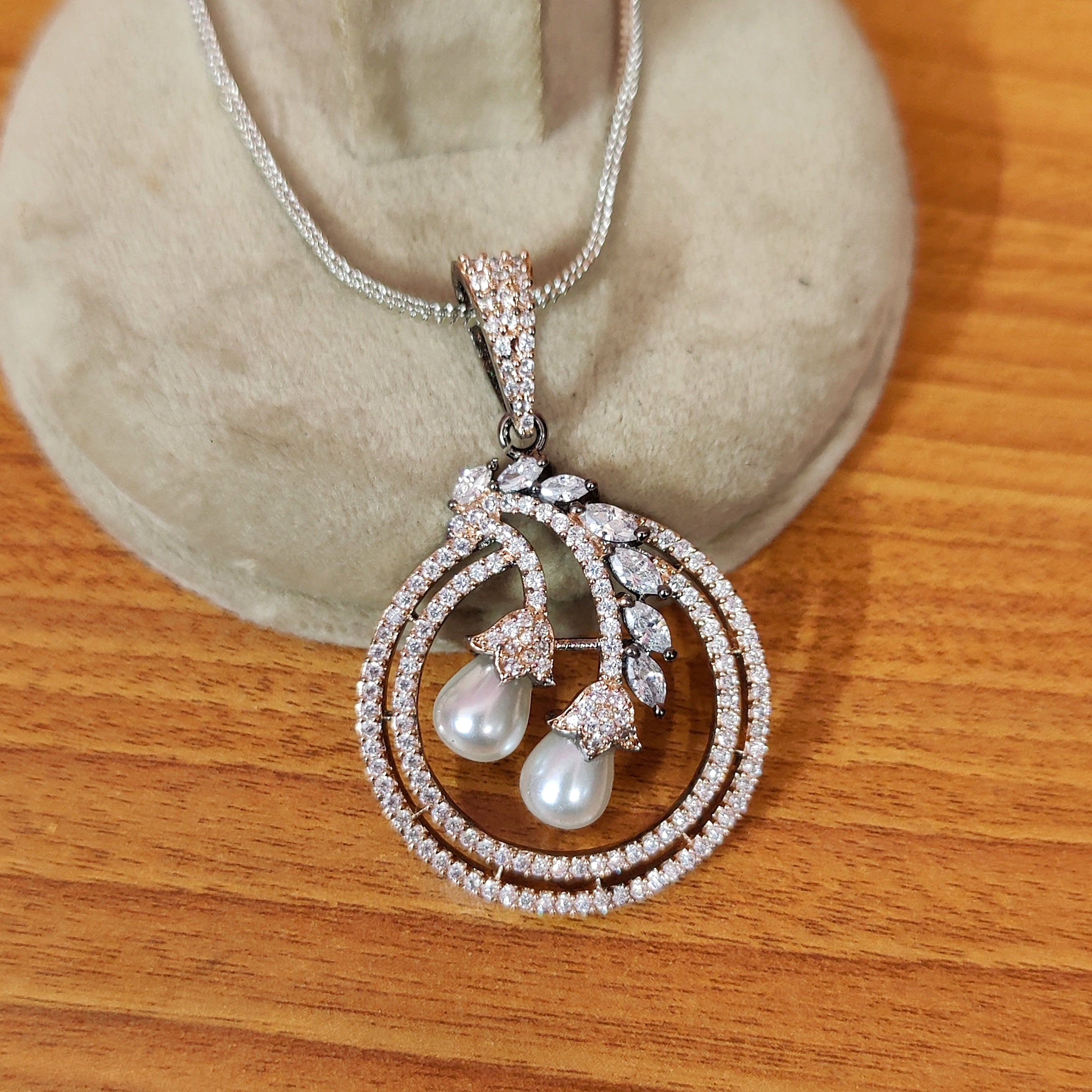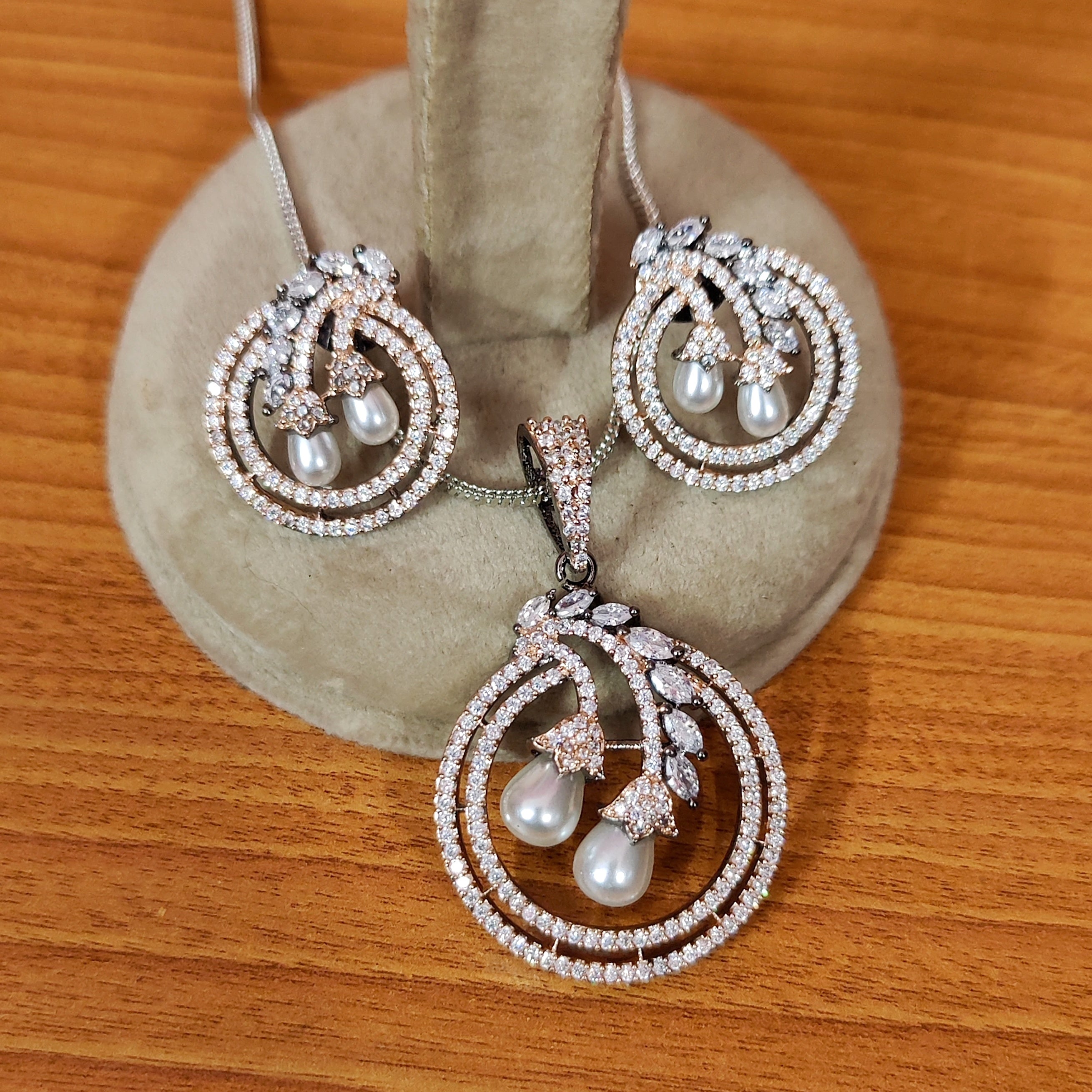 This charming pendant set features a unique combination of pearl stones and sparkling American diamonds on a sleek black rhodium plating. Finely crafted and lightweight, it exudes luxury without breaking the bank. Elevate any outfit with this versatile and elegant set.