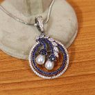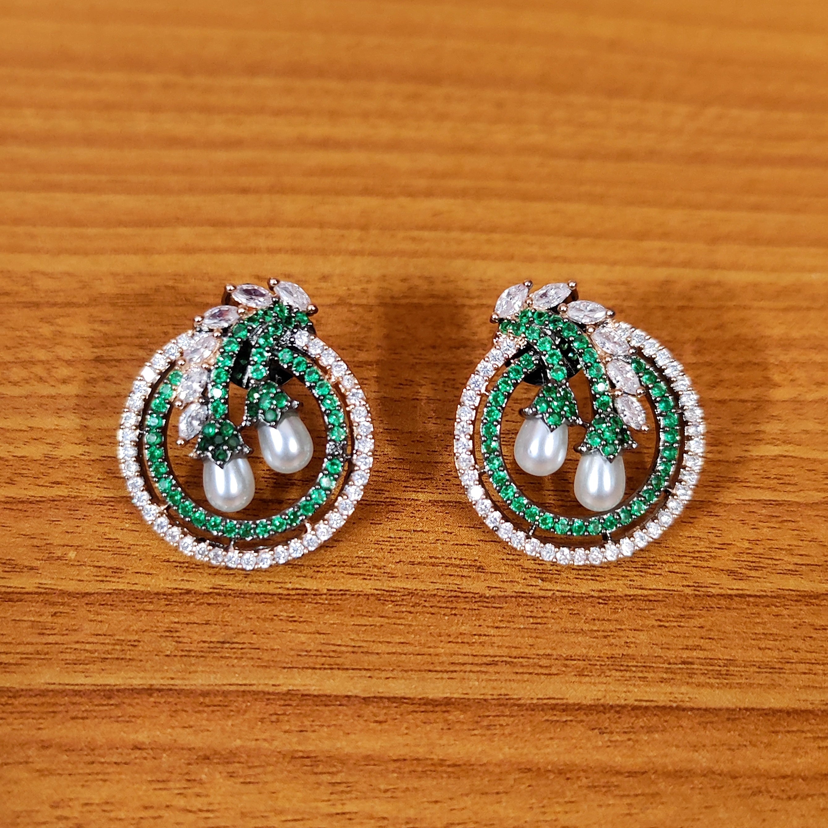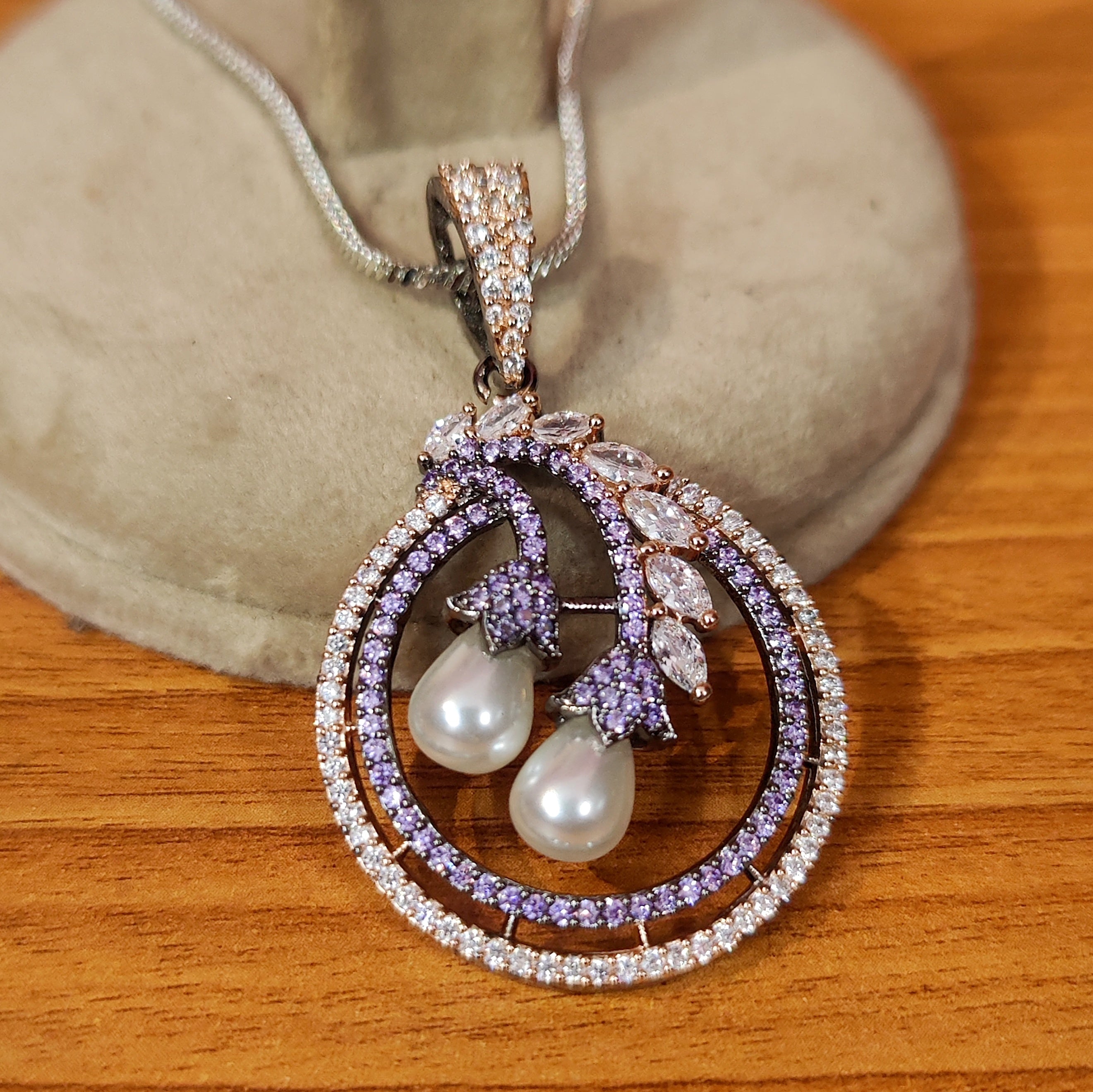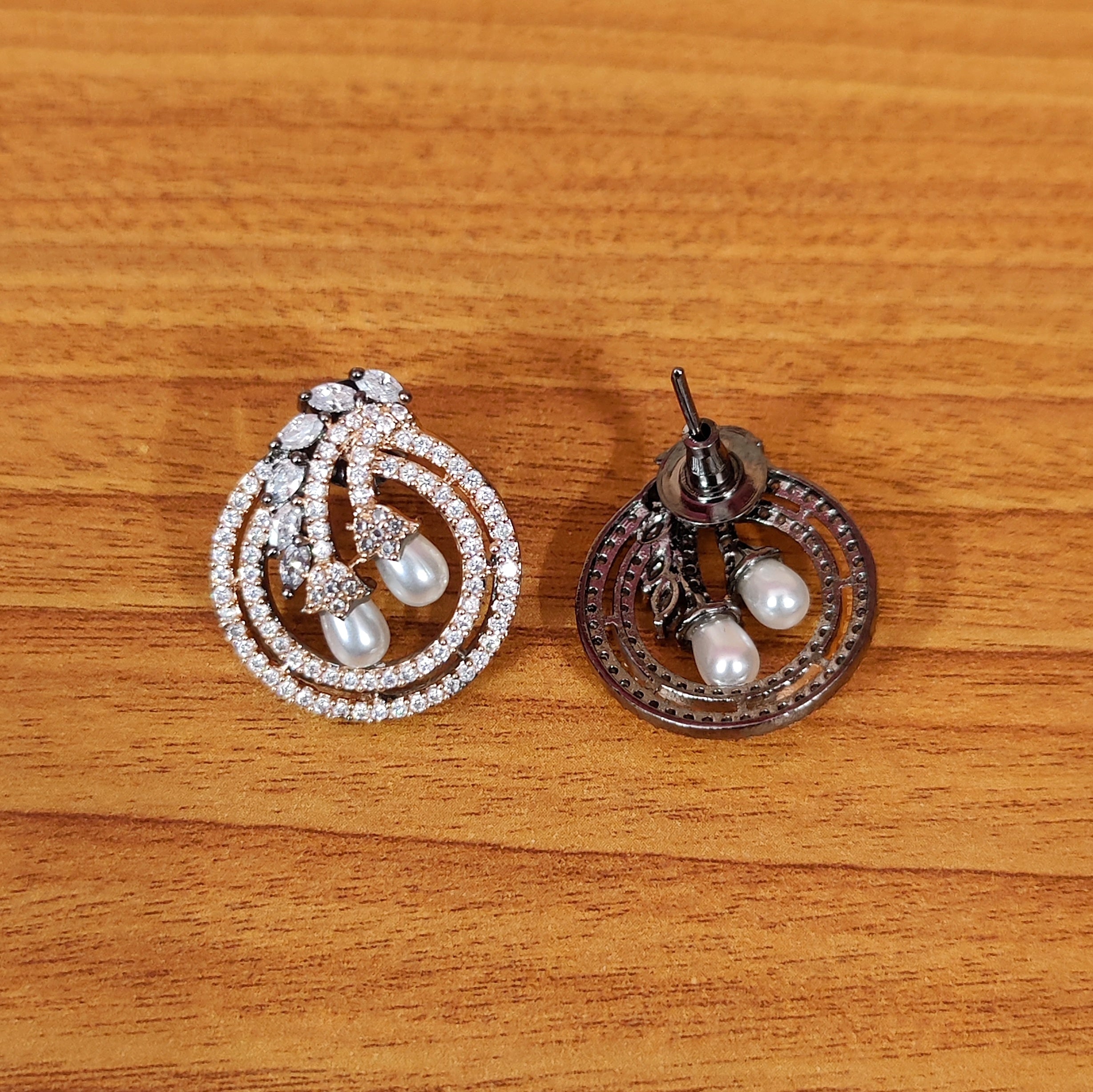 This charming pendant set features a unique combination of pearl stones and sparkling American diamonds on a sleek black rhodium plating. Finely crafted and lightweight, it exudes luxury without breaking the bank. Elevate any outfit with this versatile and elegant set.