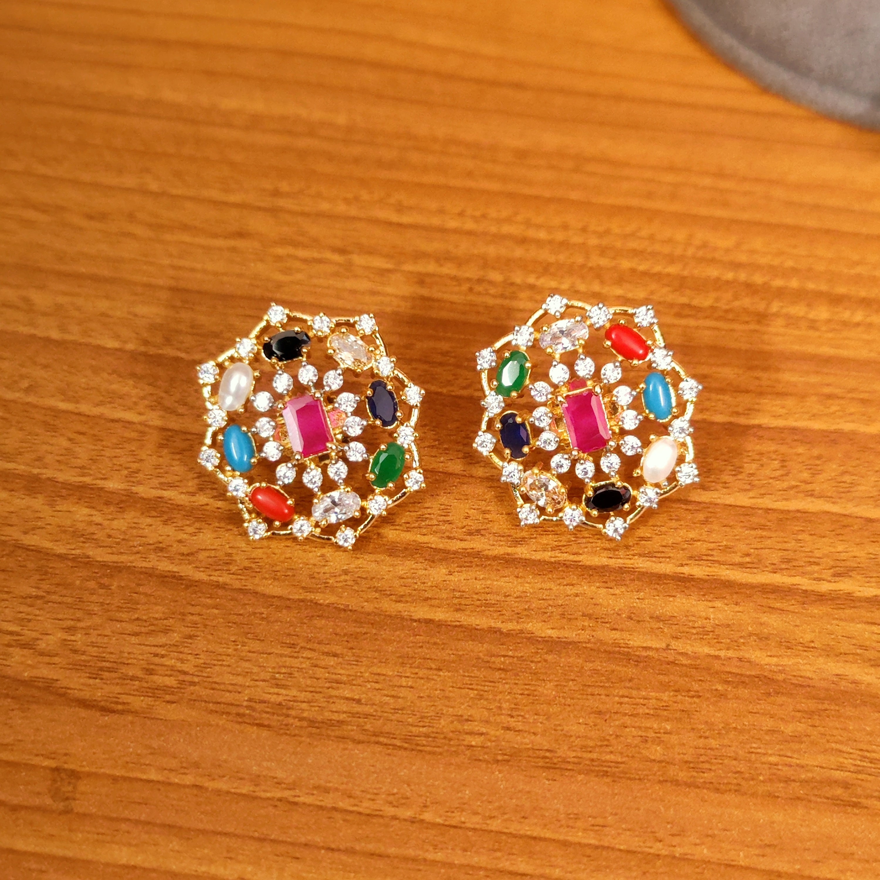This diamond look pendant set is made in silver alloy with imitation multicolour navratan stones and american diamond stones of extremely fine quality. This gorgeous pendant set is handcrafted to perfection with superior quality coloured stones & cz stones. This pendant set is plated with 18kt nickle free gold rhodium that gives the design a real gold look & comes with a matching pair of perfect size earrings which are absolutely gorgeous and are very light in weight.