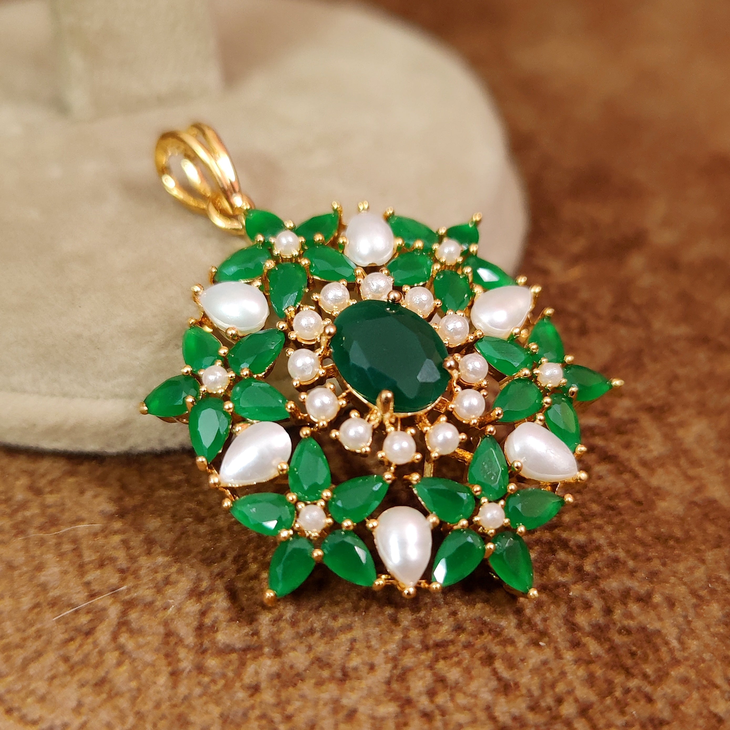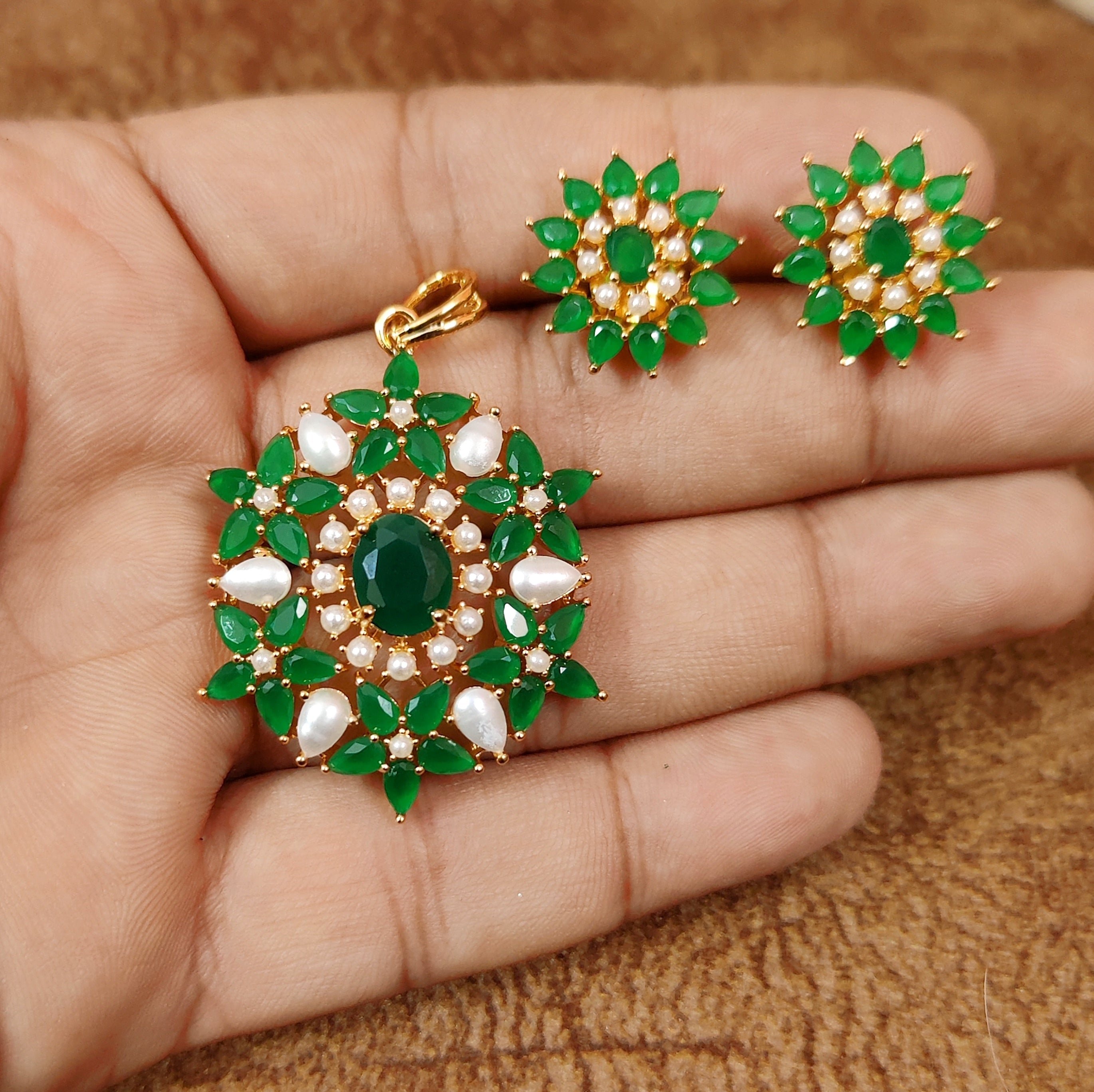 PEARL & EMERALD STONE FLOWER STUDDED PREMIUM PENDANT SET