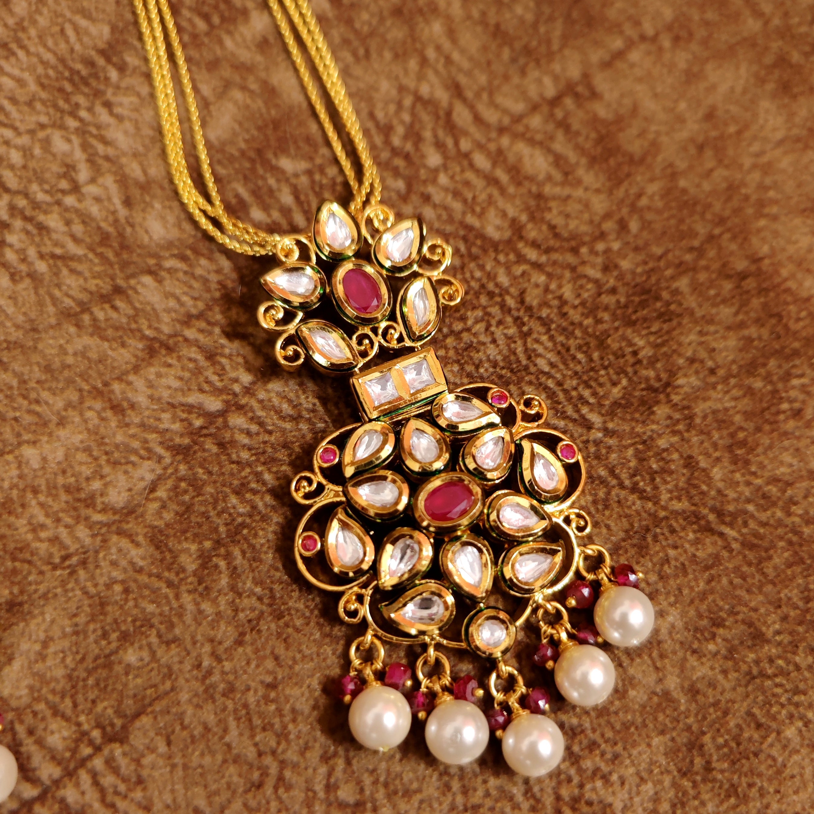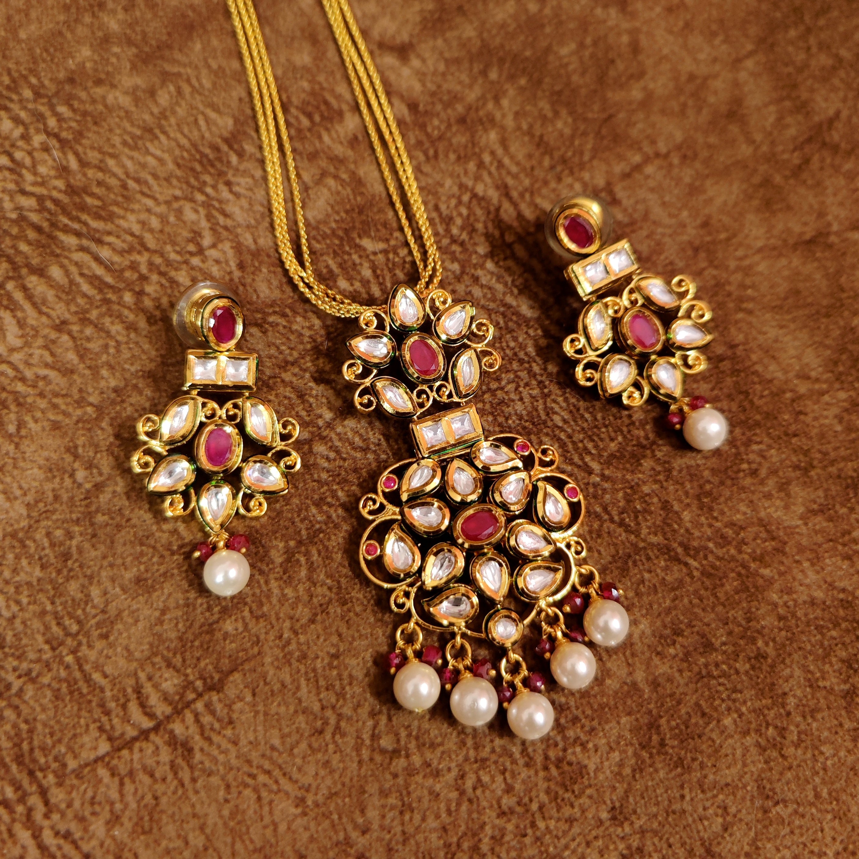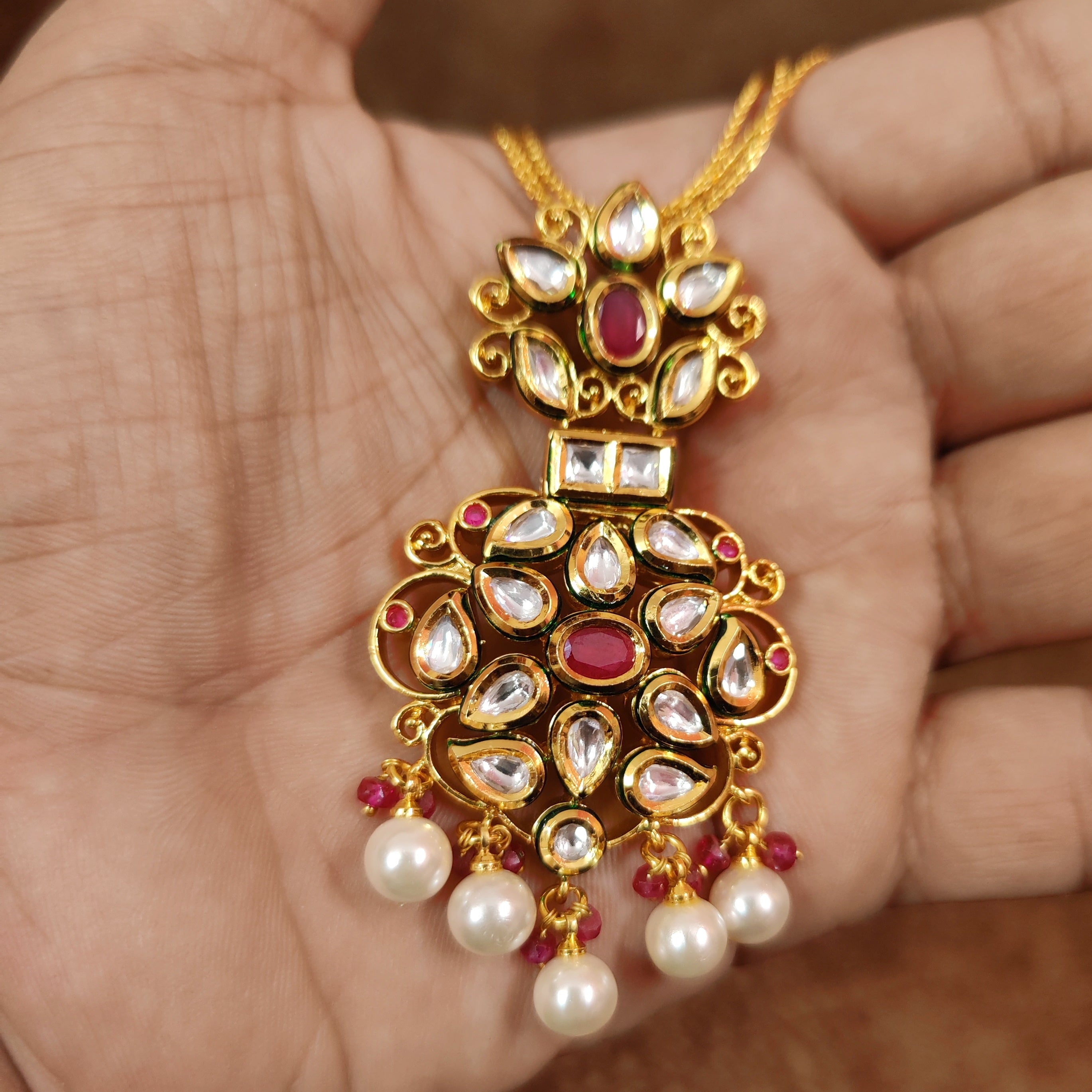 This handcrafted beautiful pendant set Is made in silver alloy with imitation ruby colour red stone & pearls and kundan polki stone of extremely fine quality. This gorgeous pendant set is handcrafted with fine engravings done with hand and is plated 18kt nickle free gold rhodium that gives the design a real look . the pendant comes with a matching pair of earrings which are absolutely gorgeous and are very light in weight.