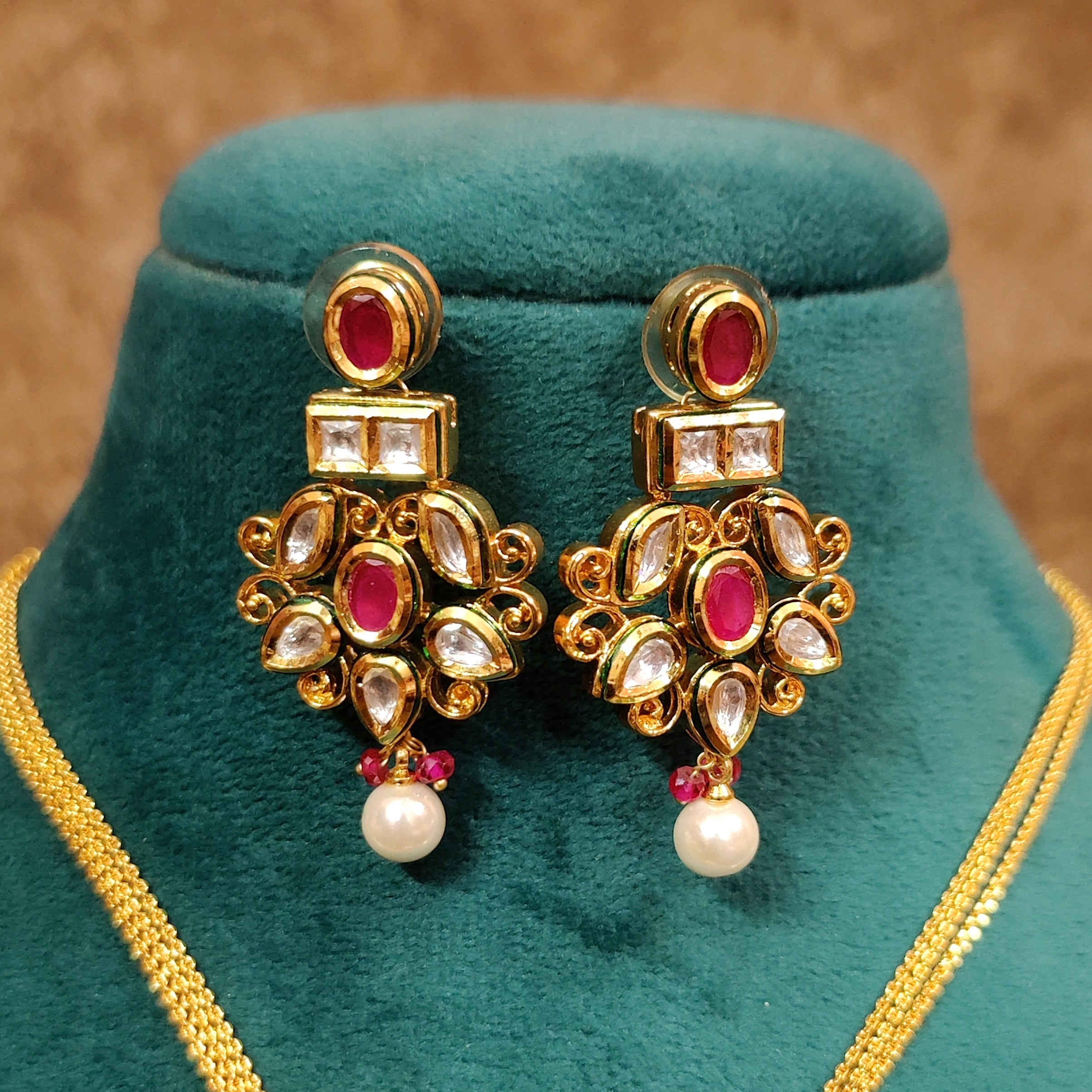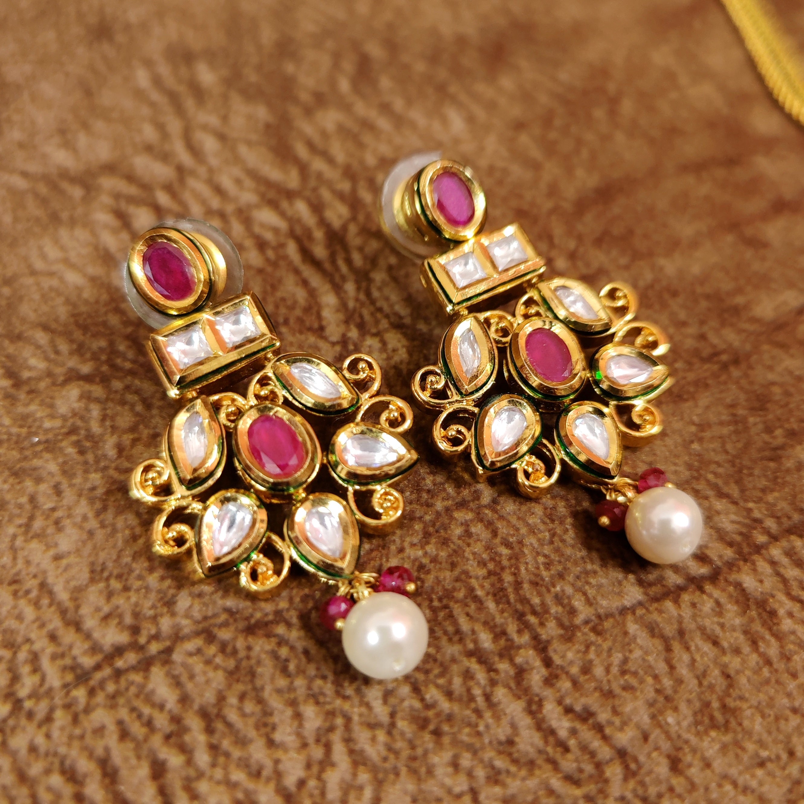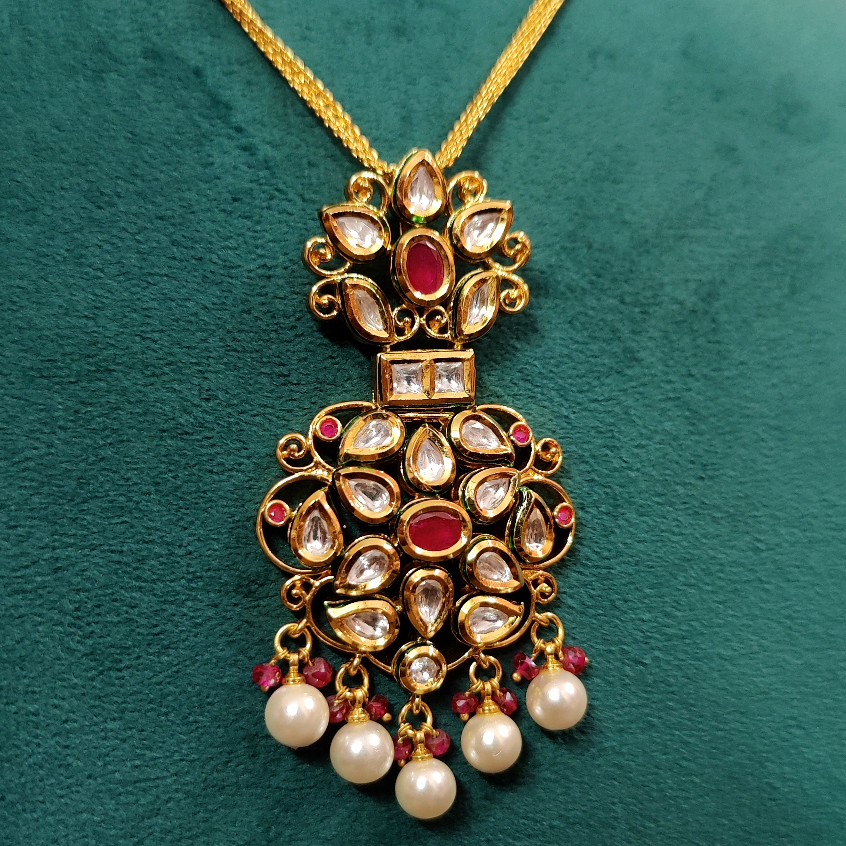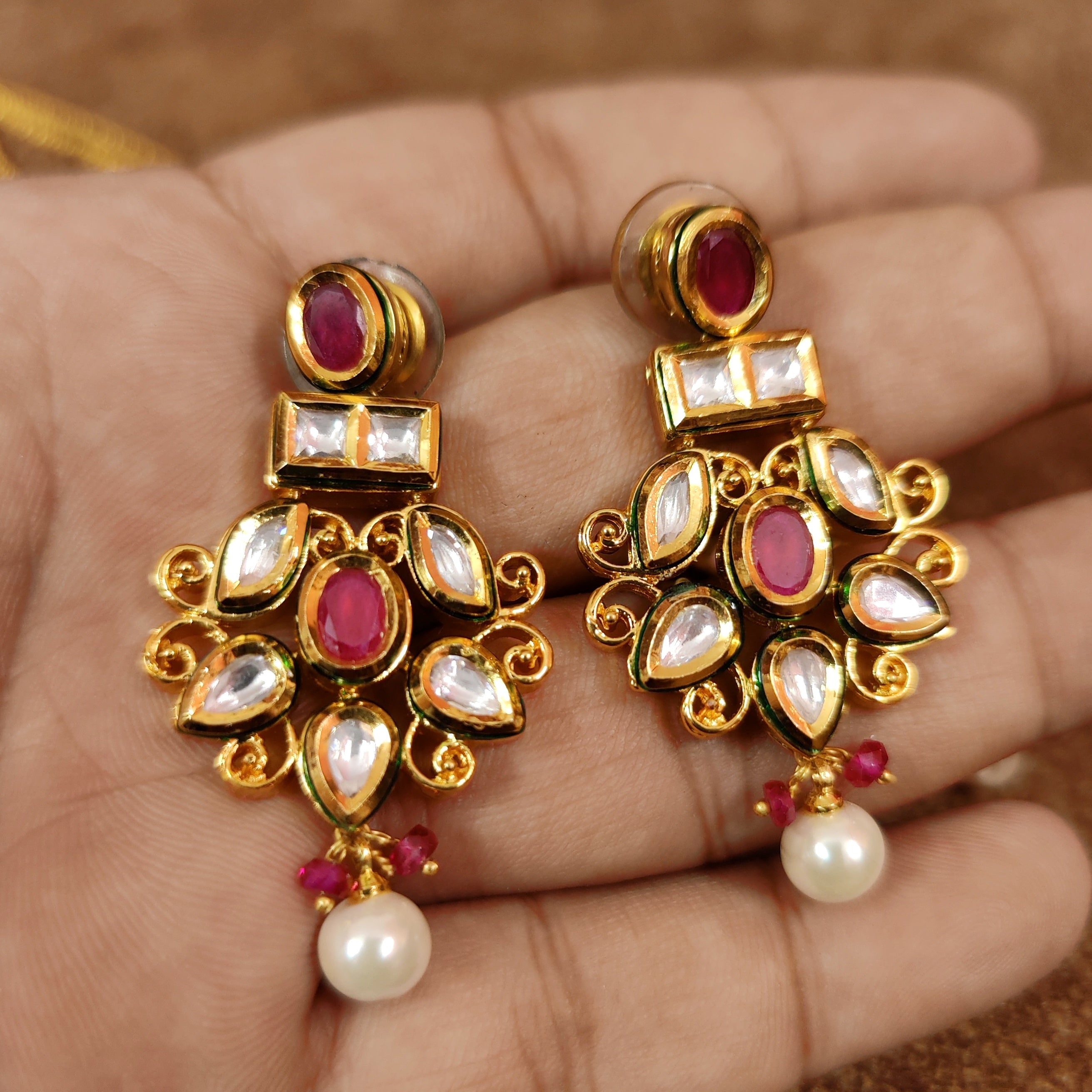 This handcrafted beautiful pendant set Is made in silver alloy with imitation ruby colour red stone & pearls and kundan polki stone of extremely fine quality. This gorgeous pendant set is handcrafted with fine engravings done with hand and is plated 18kt nickle free gold rhodium that gives the design a real look . the pendant comes with a matching pair of earrings which are absolutely gorgeous and are very light in weight.