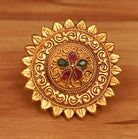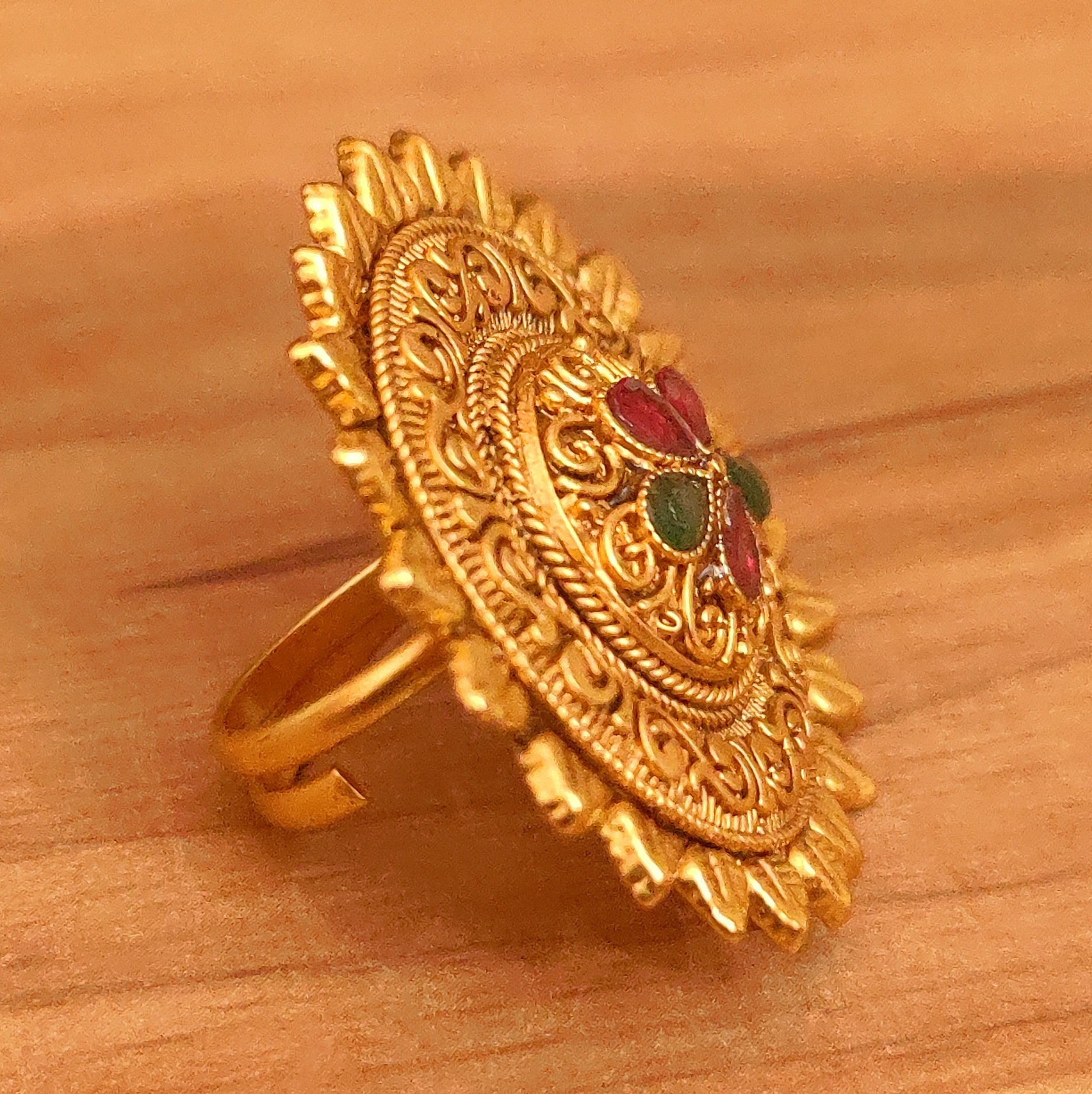 This beautiful flower pattern ring is handcrafted in copper alloy with imitation red & green colour stone and gold polki work of very fine quality . this ring is coated with 18 kt gold polish which give it a real look . an absolutely stunning piece to own and is very light in weight.