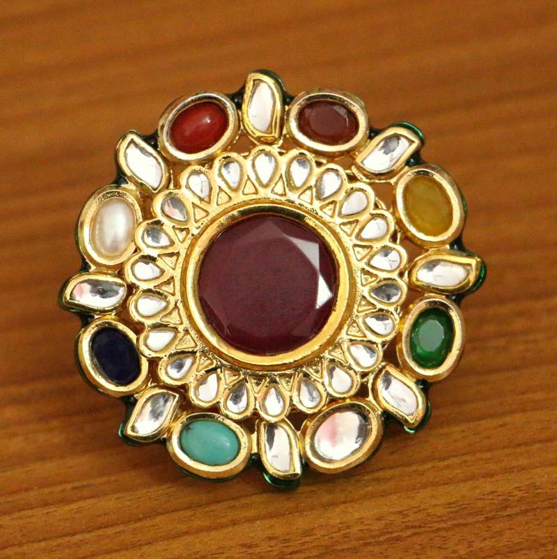 This gorgeous multicolor Kundan Polki ring is carefully crafted by hand with brass alloy and features exquisite imitation ruby and Navratan stones of superb quality. Lightweight and plated with 18kt gold rhodium for that luxurious gold look, each piece undergoes a thorough inspection before shipping. Delivered in secure bubble wrap with sturdy plastic boxes, it's sure to arrive in perfect condition.