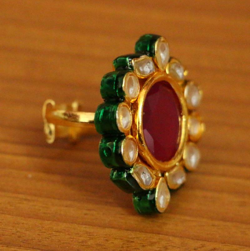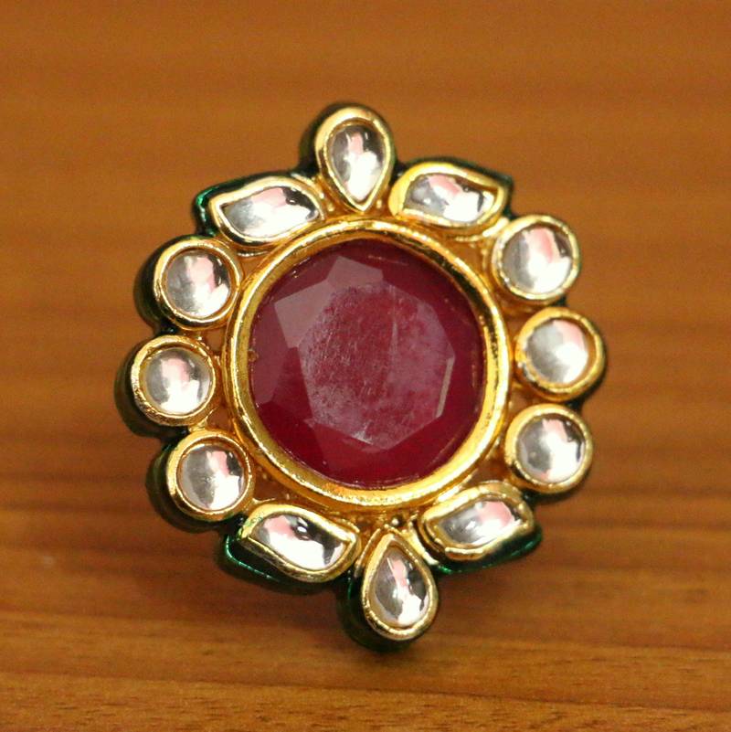 This Kundan Polki Ring Is Handcarfted In Brass Alloy With Imitation Ruby Colour & Meenakari Work Of Very Fine Quality , The Ring Is Light In Weight And Plated With 18kt Gold Rhodium To Give It A Real Gold Look.