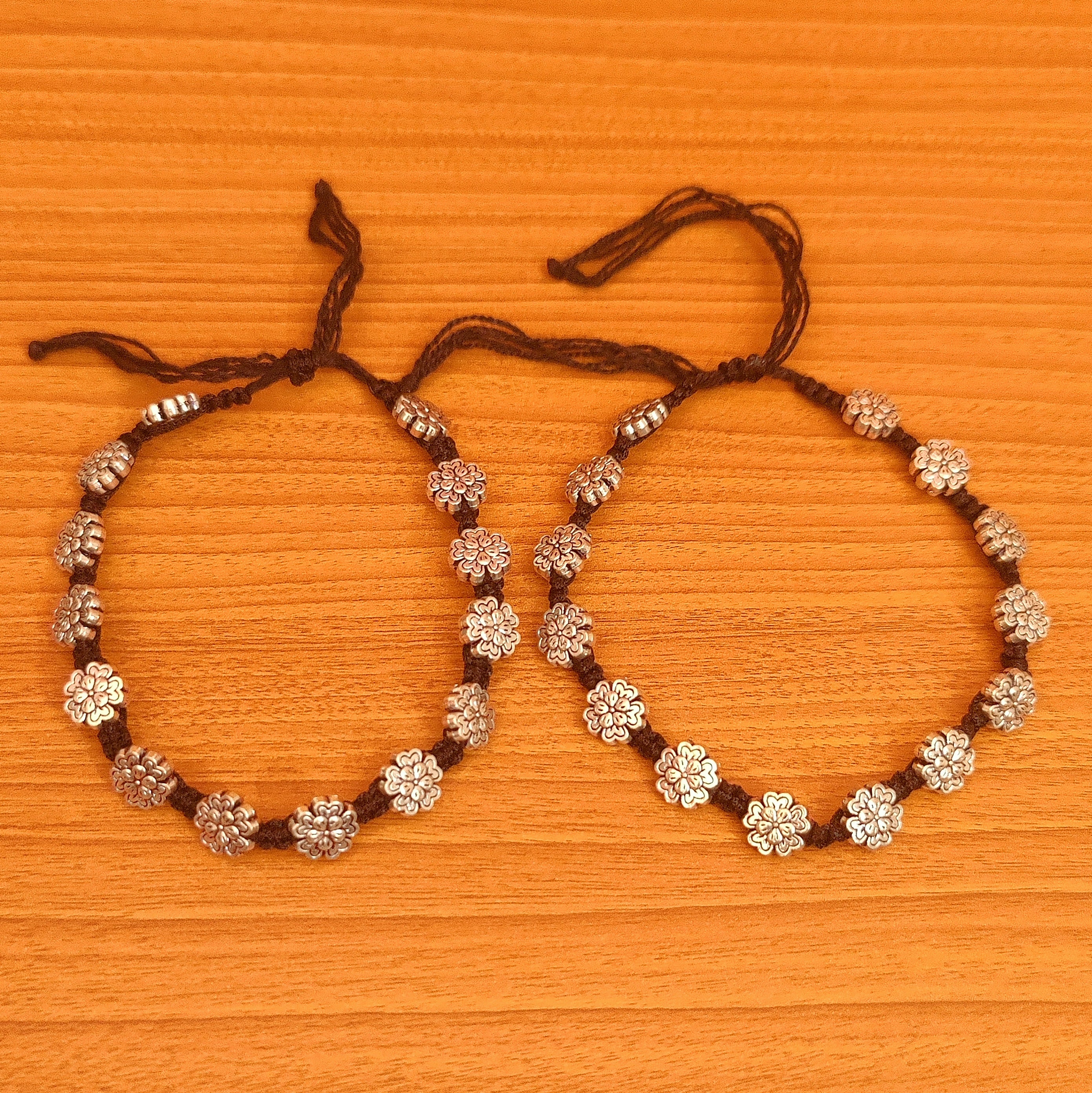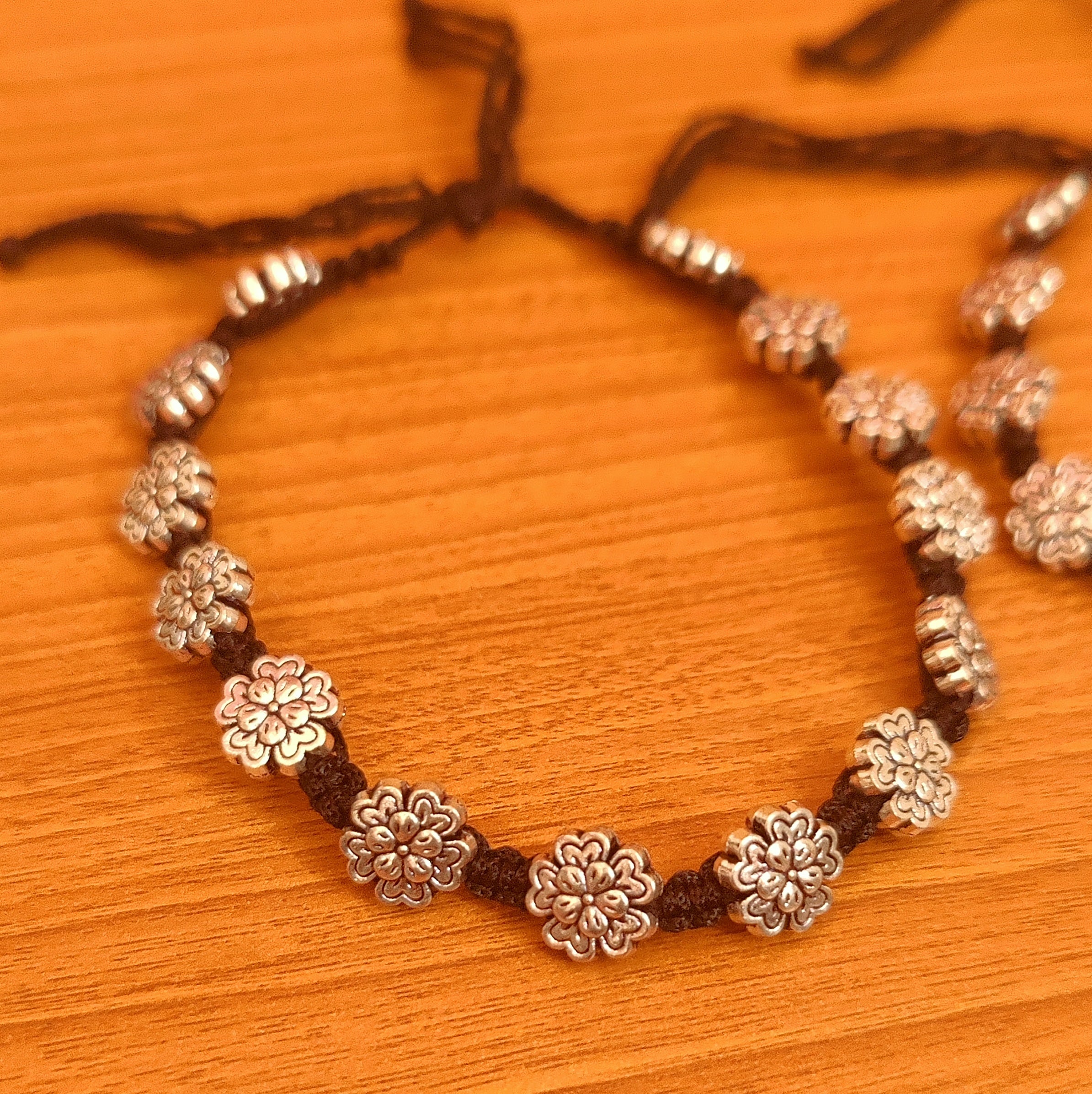 These silver lookalike anklets are handcrafted in copper alloy flower pattern beads handwoven with black threads . These anklets are polished with antique silver plating are are very light in weight.