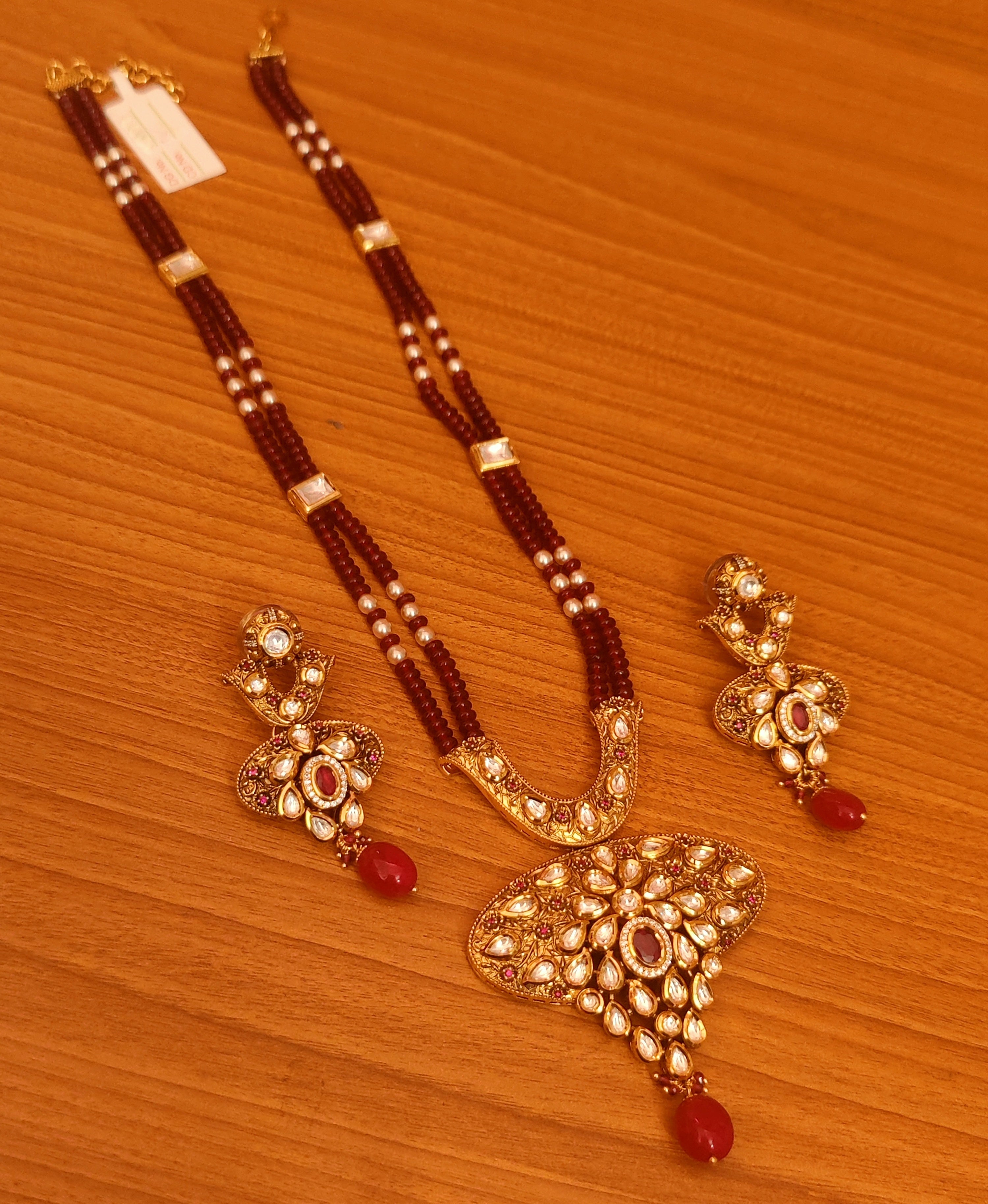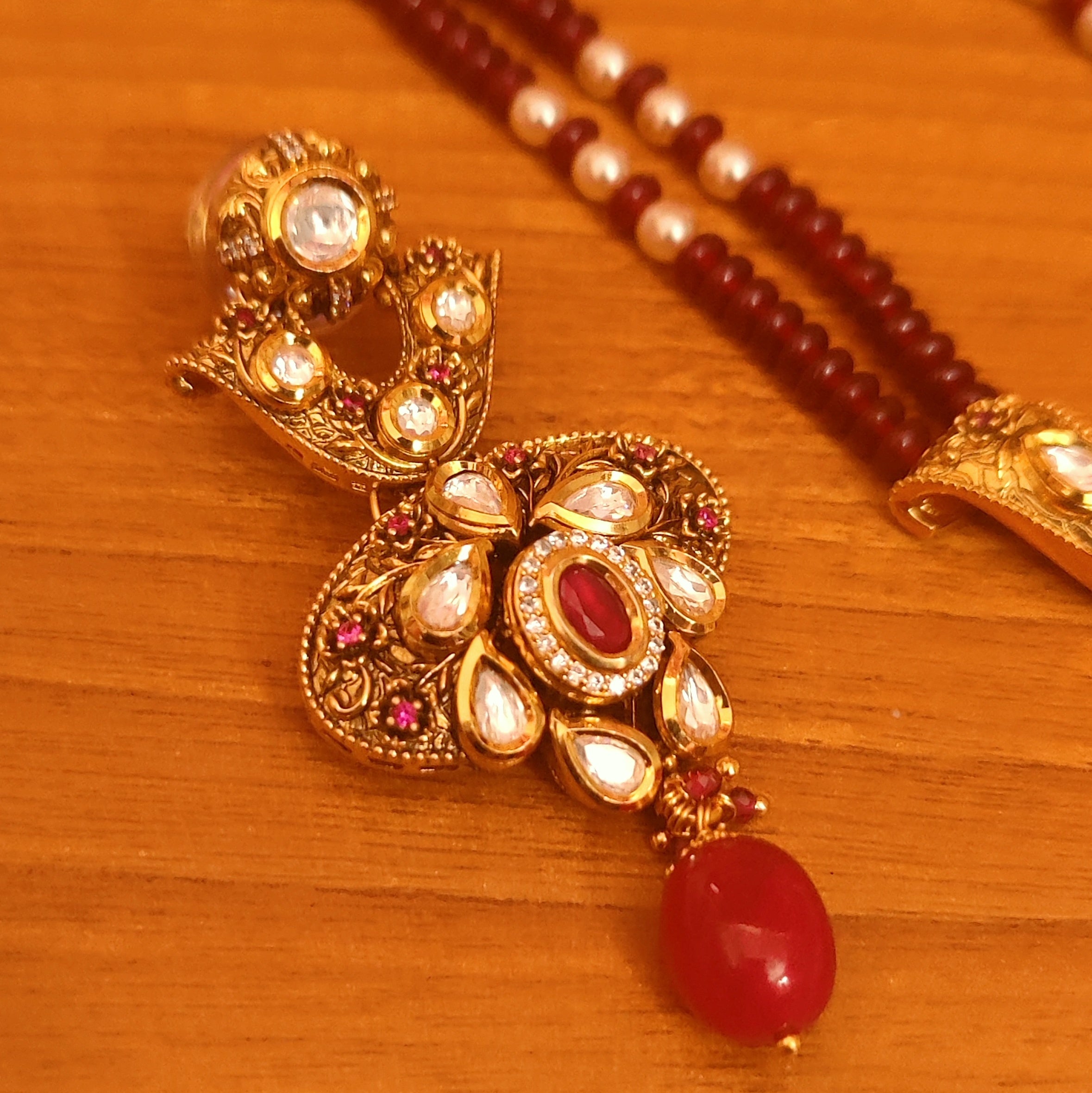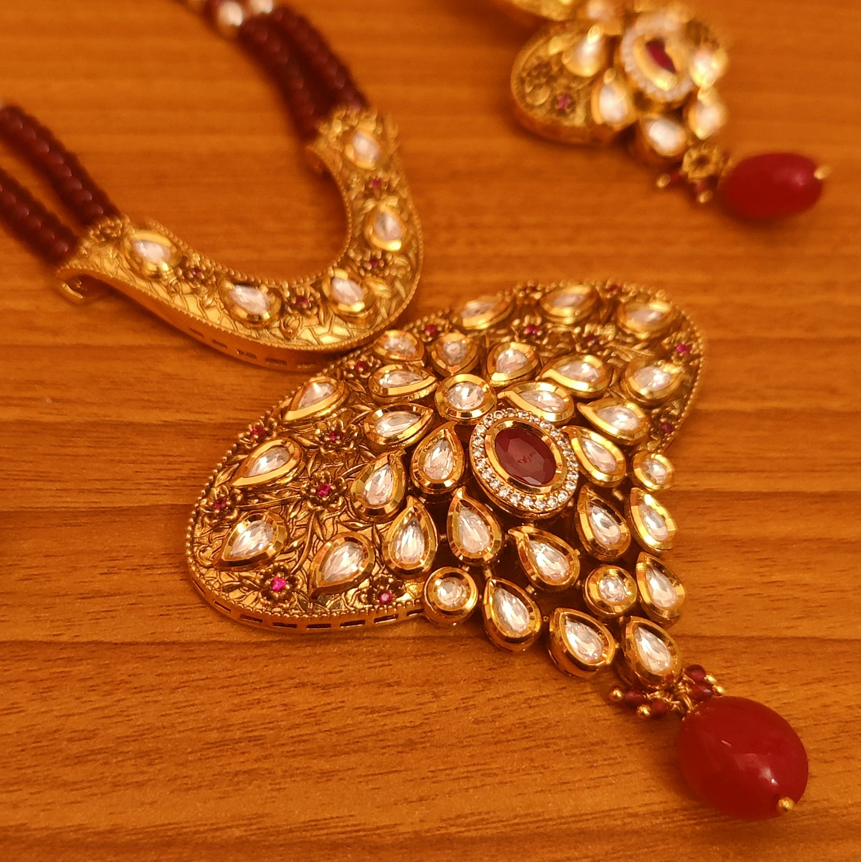 This kundan polki necklace set is handcrafted in brass alloy with imitation ruby colour pearls & beads and kundan with antique work of very fine quality . this necklace set is coated with 18 Kt gold polish which give them a unique look . an absolutely stunning piece to own and are very light in weight.