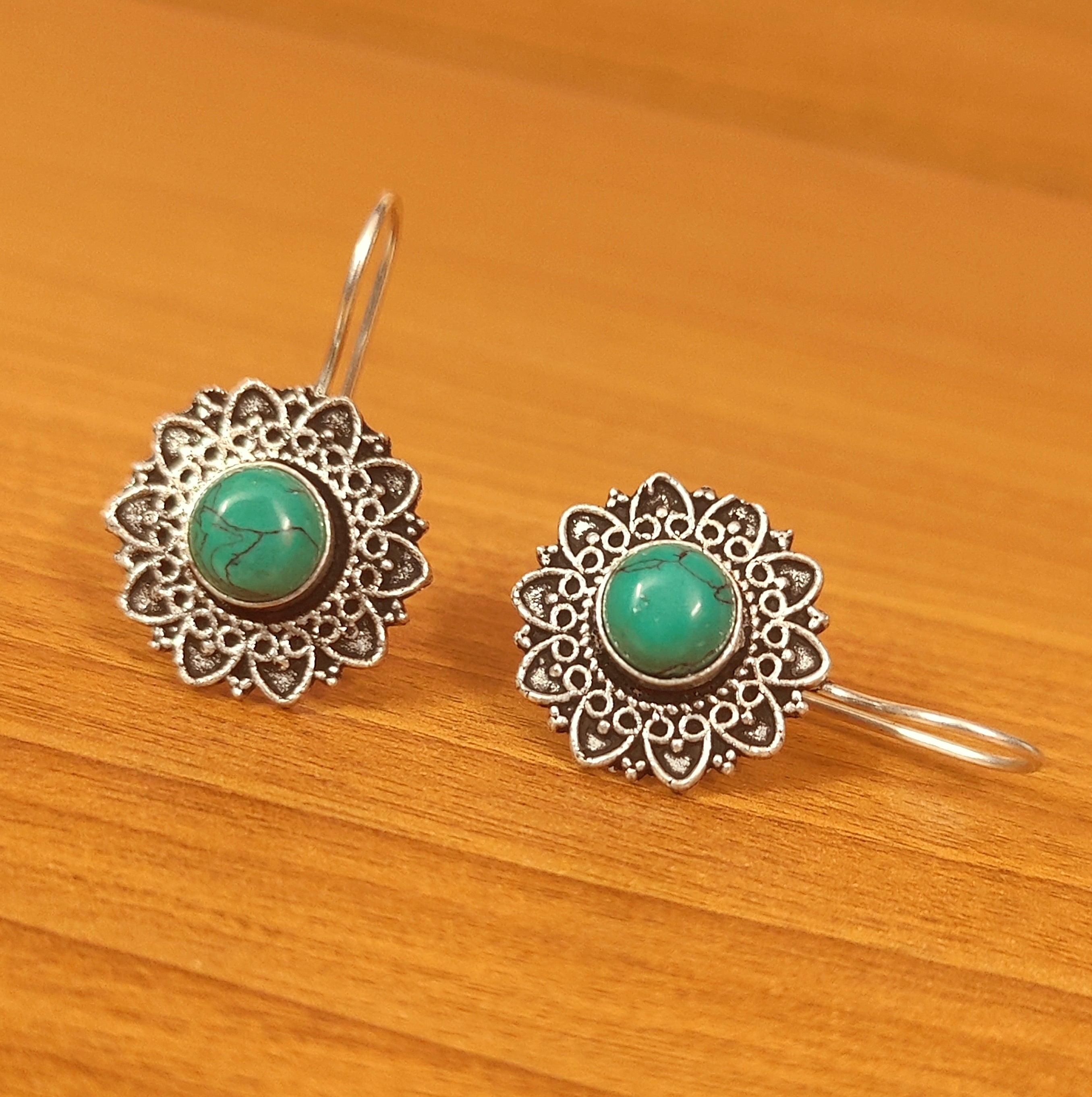 These silver lookalike earrings are handcrafted in copper alloy with imitation turquoise colour stone of very fine quality. These simple and light weight earrings are plated with fine nickle free antique silver plating that gives a real silver look to the design.