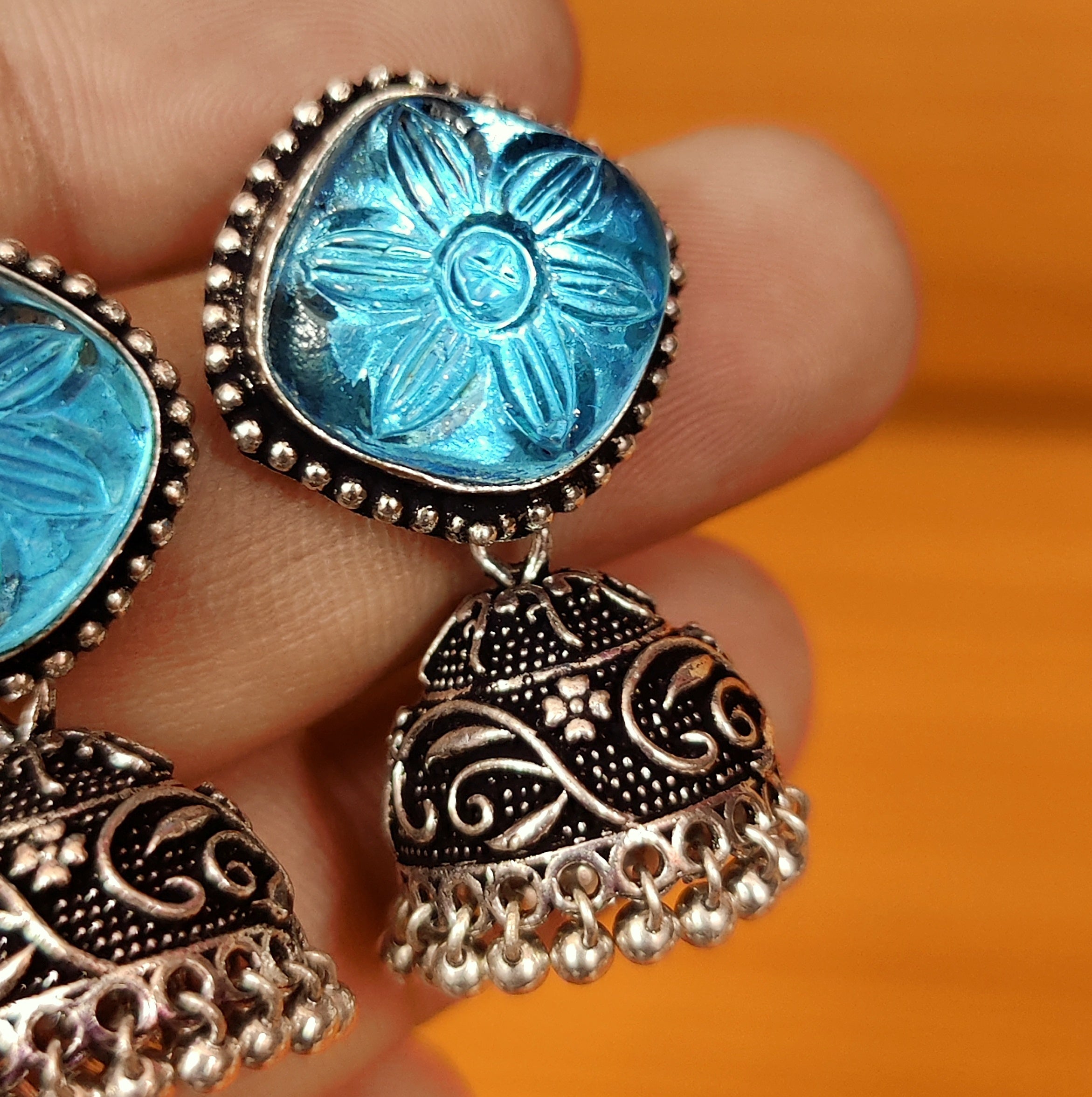 AQUA COLOUR CARVED STONE SILVER LOOK ALIKE JHUMKA'S