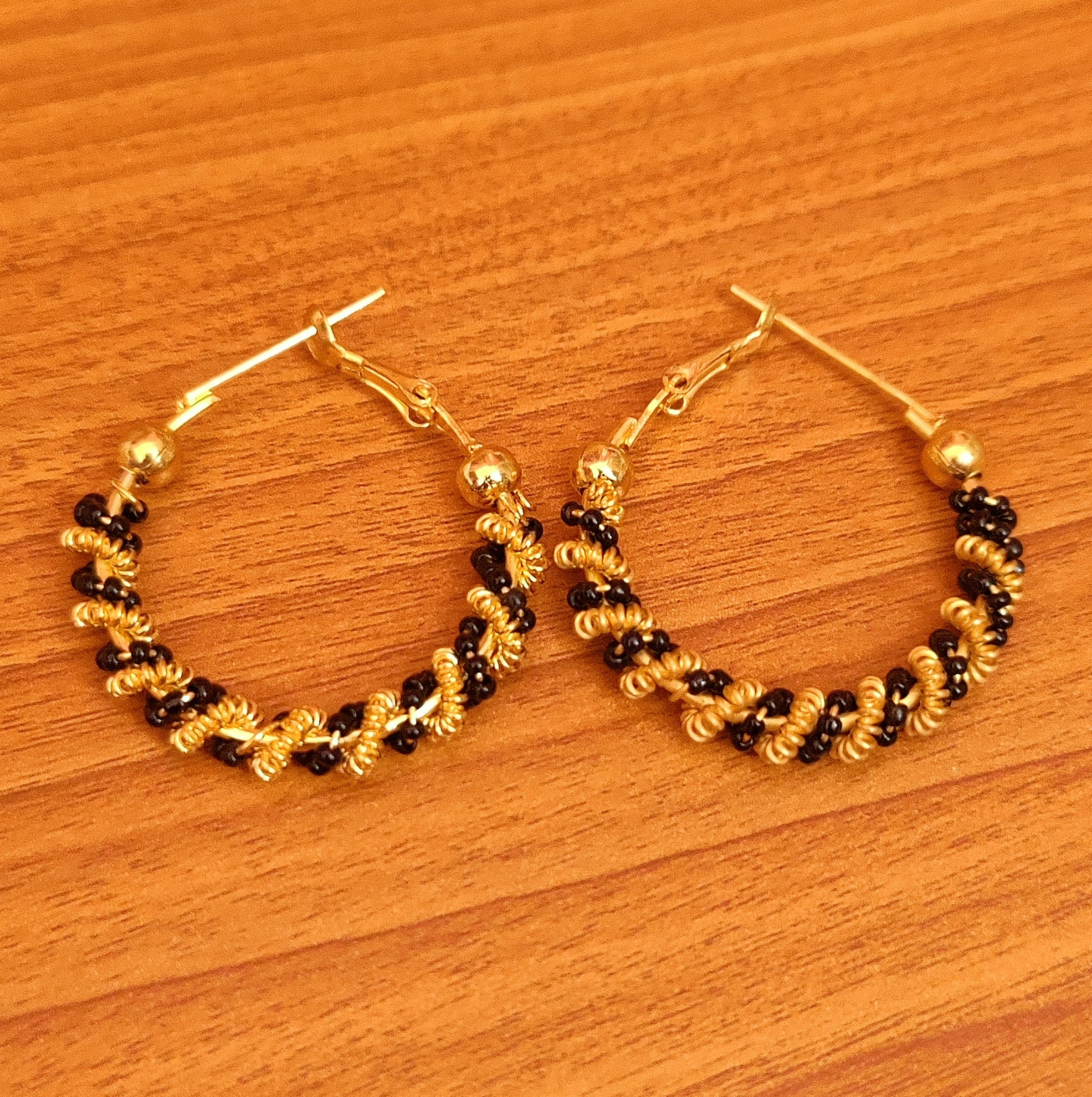 These hoops are handcrafted in brass alloy with imitation semi precious black colour pearls of very fine quality. these artistic yet modern hoops are plated with high quality gold rhodium. the earrings are very light in weight.