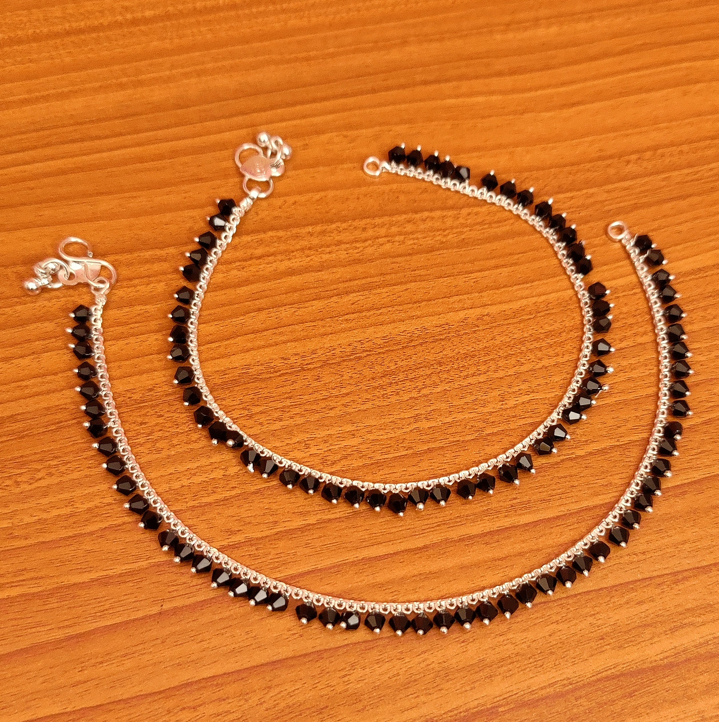 These anklets are handcrafted in copper alloy with imitation black colour swarovski crystals beads of very fine quality , these anklets are very light in weight and platedin silver rhodium .