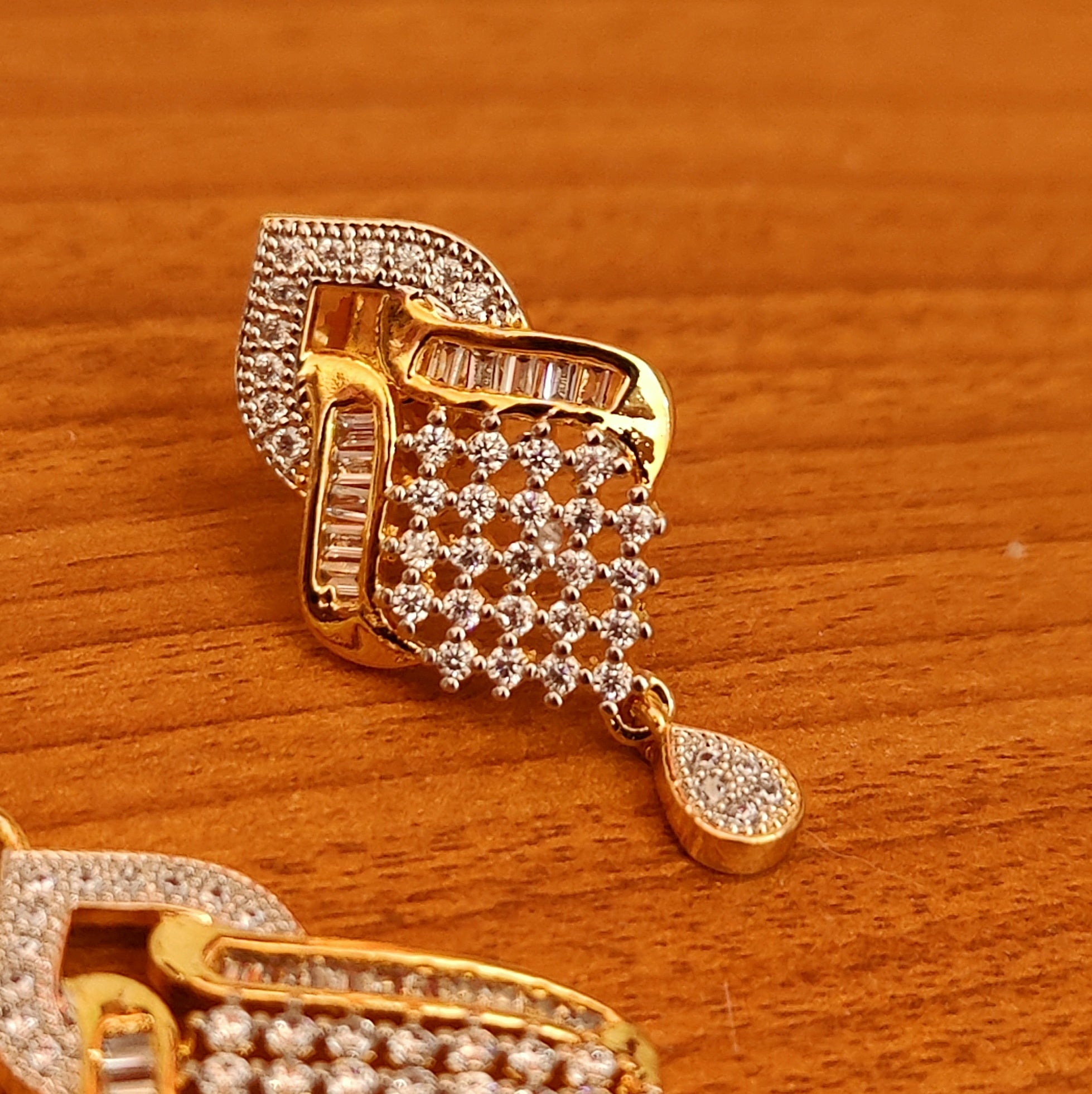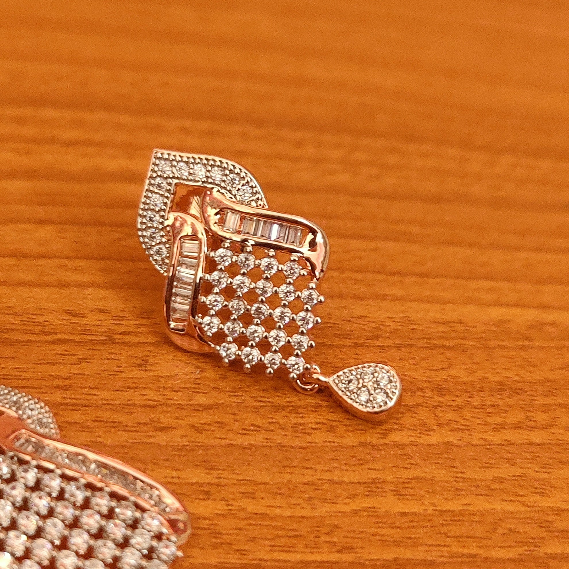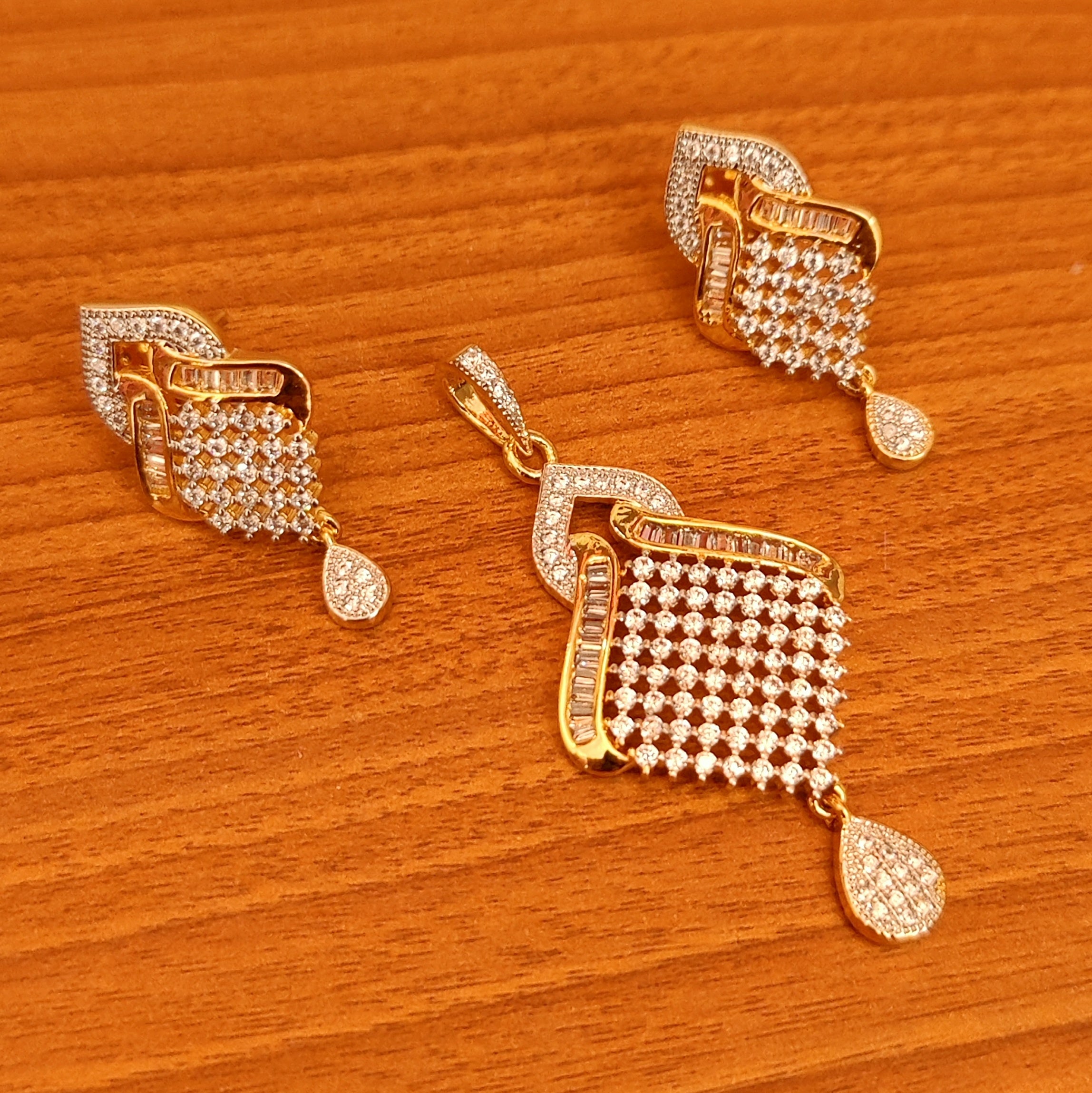 This beautiful pendant set is handcrafted in brass alloy with imitation cz stone of very fine quality . this pendant set is coated with 18k gold rhodium plating which give them a unique look . an absolutely stunning piece to own and are light in weight.
