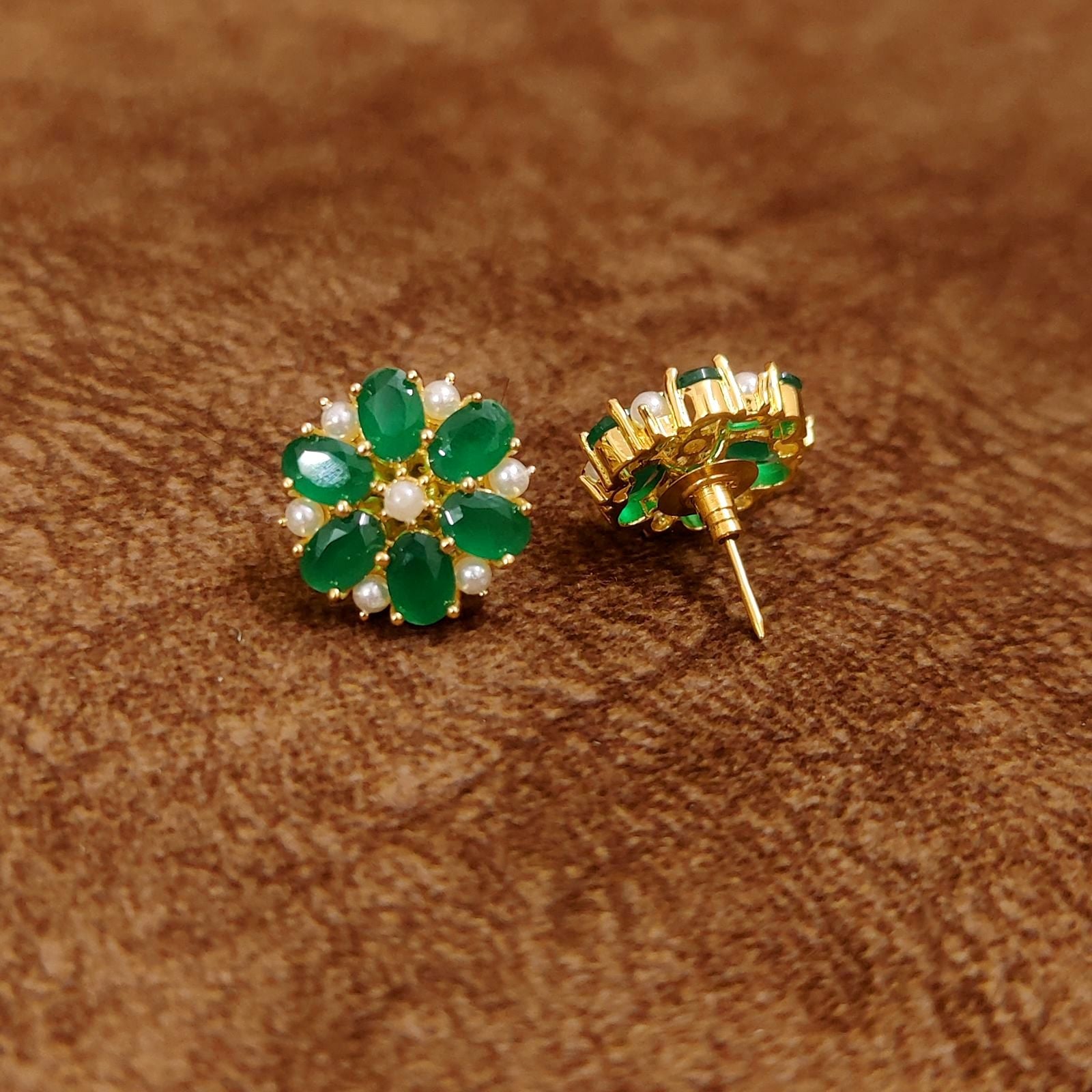 Elegant emerald green floral stud earrings featuring vibrant green stones arranged in a delicate flower design with pearl accents. These designer imitation jewellery earrings offer a luxurious festive look, perfect for weddings, parties, and everyday styling worldwide.
