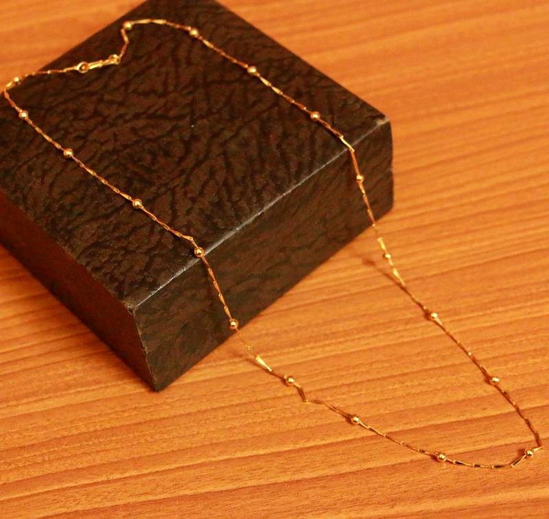 This Gold Look Thin Rice Chain With Golden Beads Is Handcrafted In Brass Of Very Fine Quality . The Chain Is Coated With 18tk Gold Rhodium Plating Which Gives It A Real Gold Look . An Absolutely Stunning Piece To Own And Are Very Light In Weight.