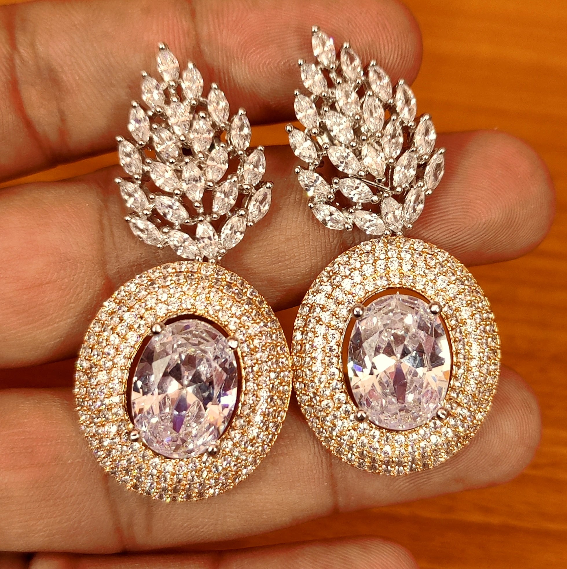 These diamond look danglers are handcrafted in silver alloy with imitation cz stones of very fine quality. These earrings are plated in 18kt gold rhodium plating that gives you a perfect look to your party dress.