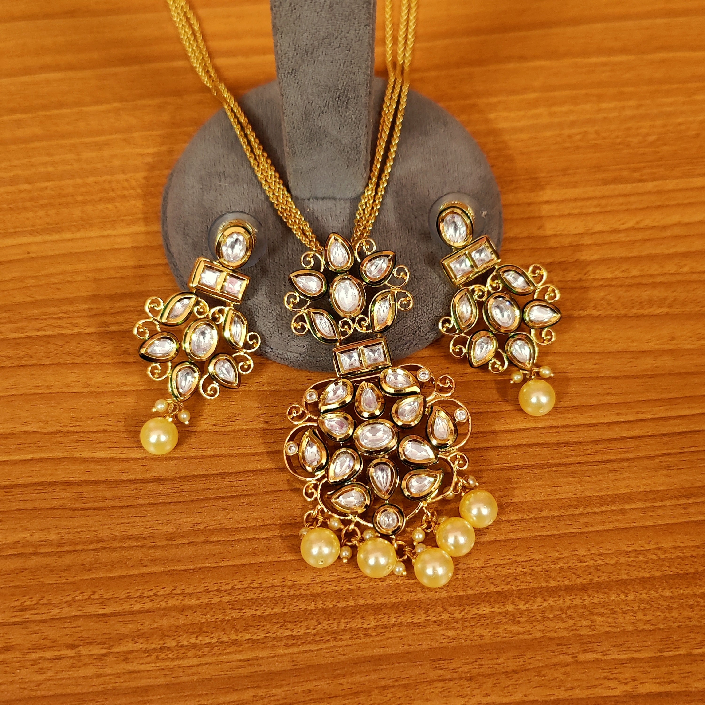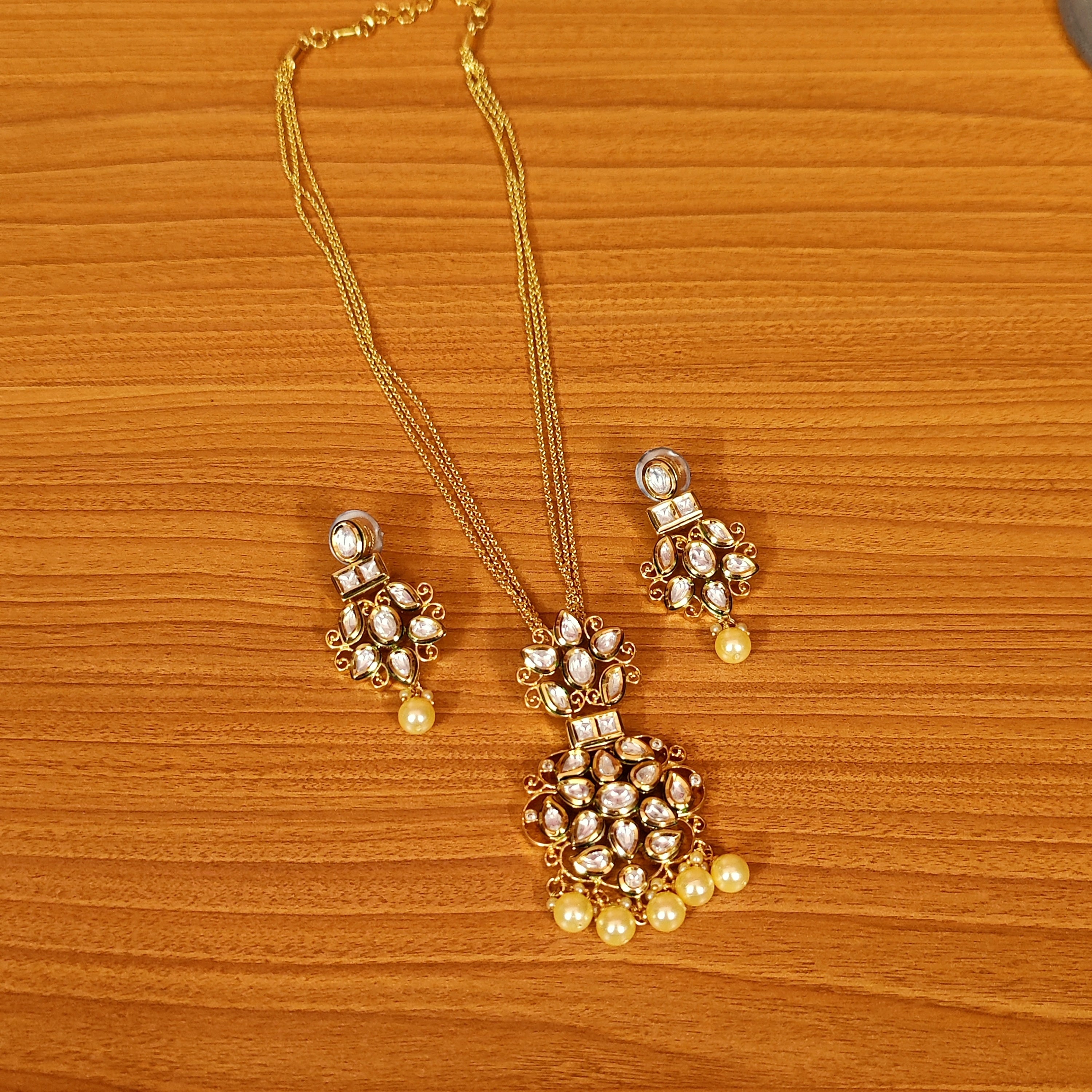 This handcrafted beautiful pendant set Is made in silver alloy with imitation pearls and kundan polki stone of extremely fine quality. This gorgeous pendant set is handcrafted with fine engravings done with hand and is plated 18kt nickle free gold rhodium that gives the design a real look . the pendant comes with a matching pair of earrings which are absolutely gorgeous and are very light in weight.
