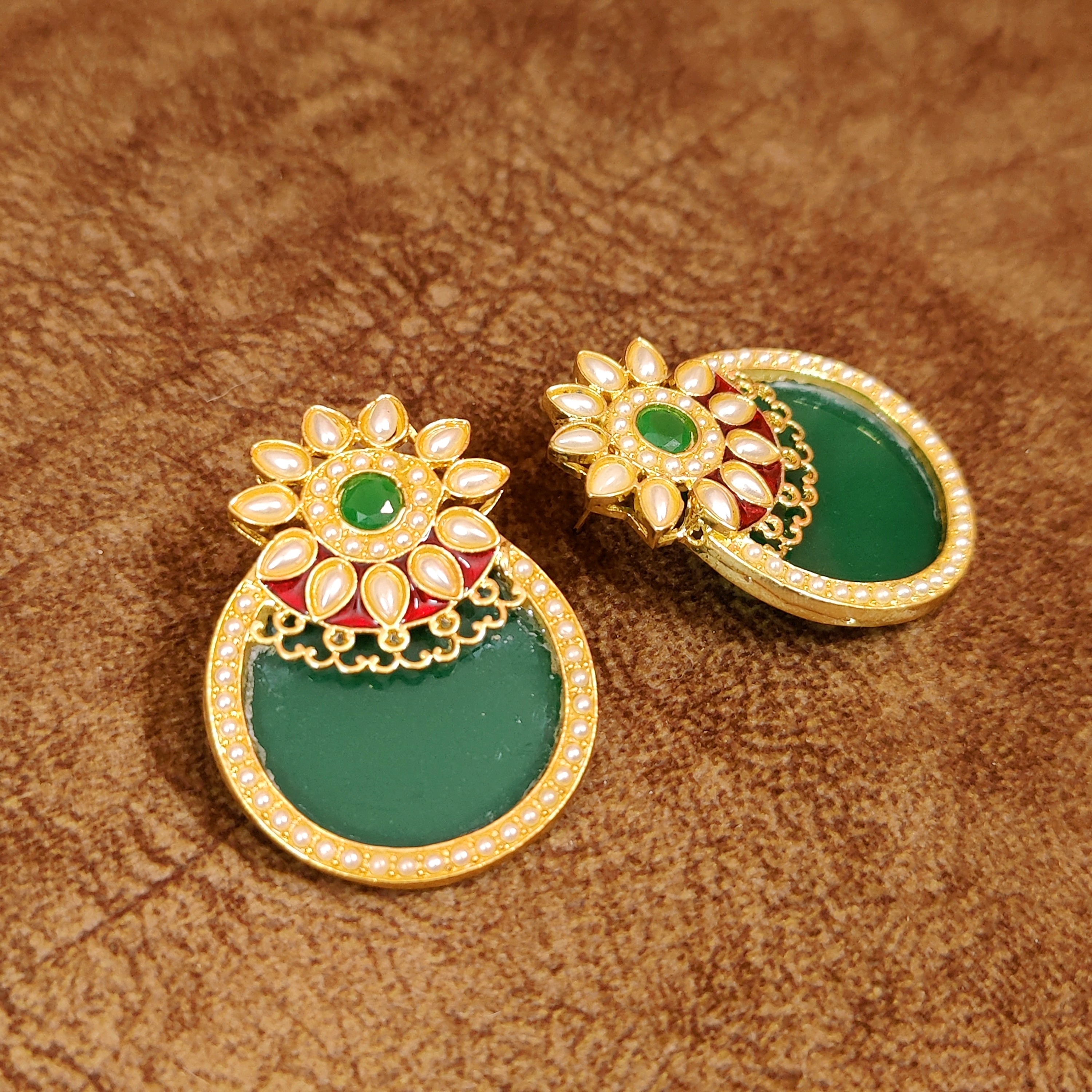 Enhance your elegance with these Green Stone Pearl Earrings, a perfect blend of sophistication and tradition. Featuring lustrous pearls and vibrant green stones, these earrings are set in a gold-plated finish, adding a royal touch to any outfit. Ideal for festive occasions, weddings, and special events, these earrings are a must-have for those who love timeless beauty.
