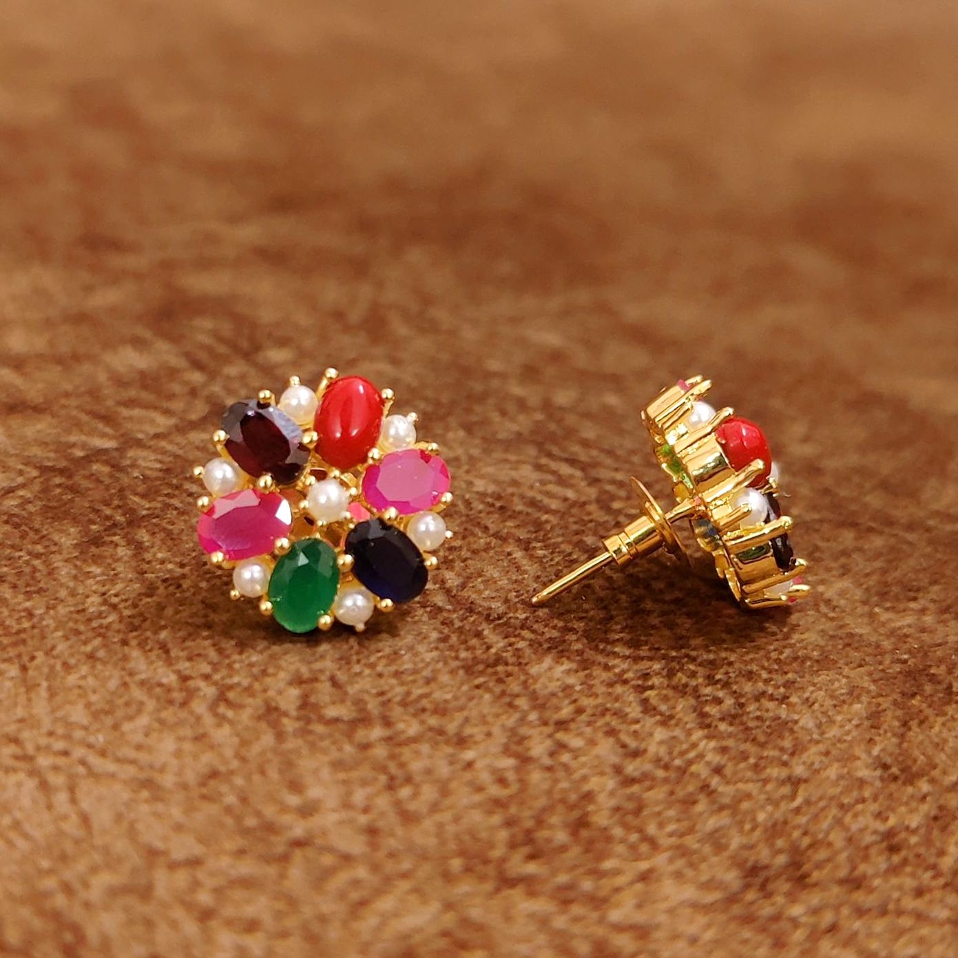 Elegant multicolor floral stud earrings featuring vibrant Navratna-inspired stones arranged in a delicate flower design with pearl accents. These designer imitation jewellery earrings offer a colorful festive look perfect for weddings, parties, and everyday styling worldwide.