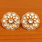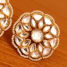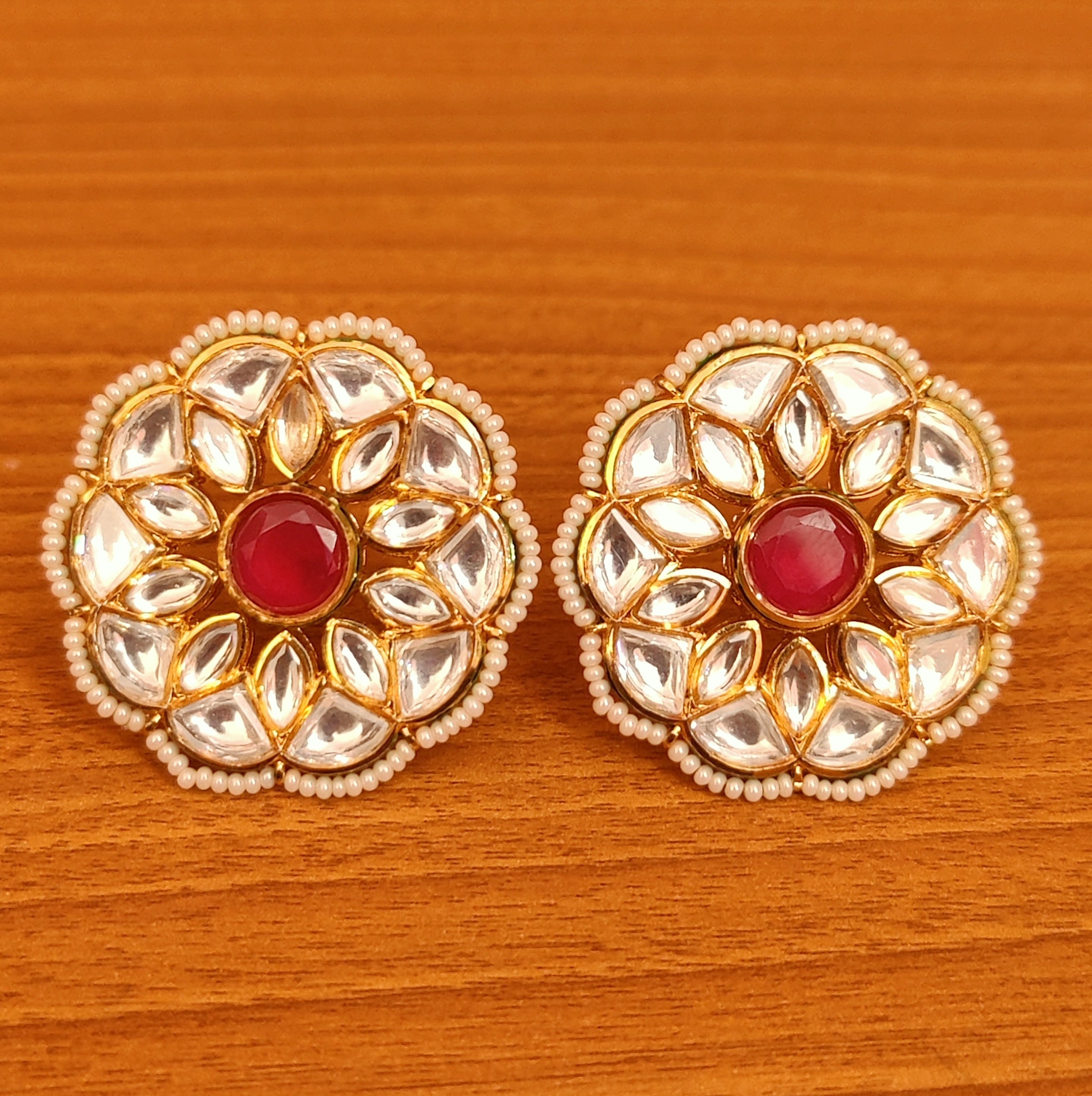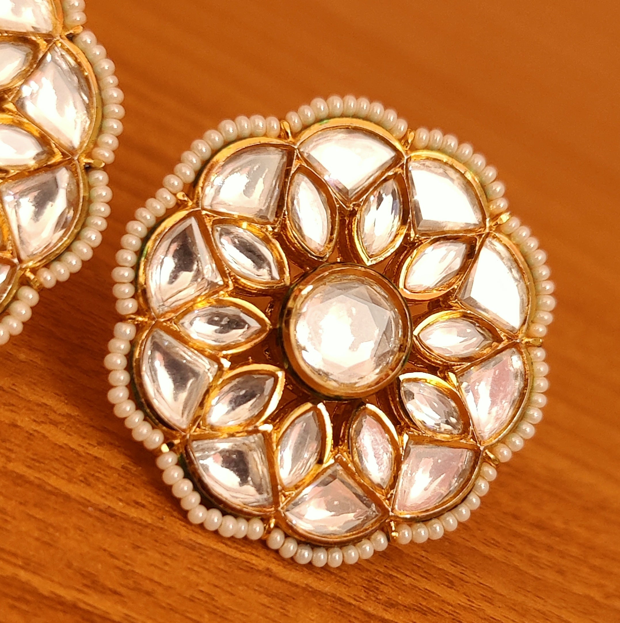 These beautiful big studs are handcrafted in brass alloy with imitation semi precious pearls and kundan work of very fine quality. these artistic yet modern earrings are plated with high quality gold rhodium. the earrings are very light in weight.