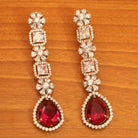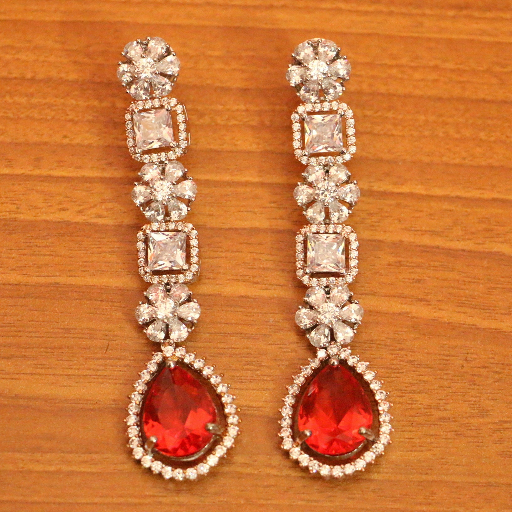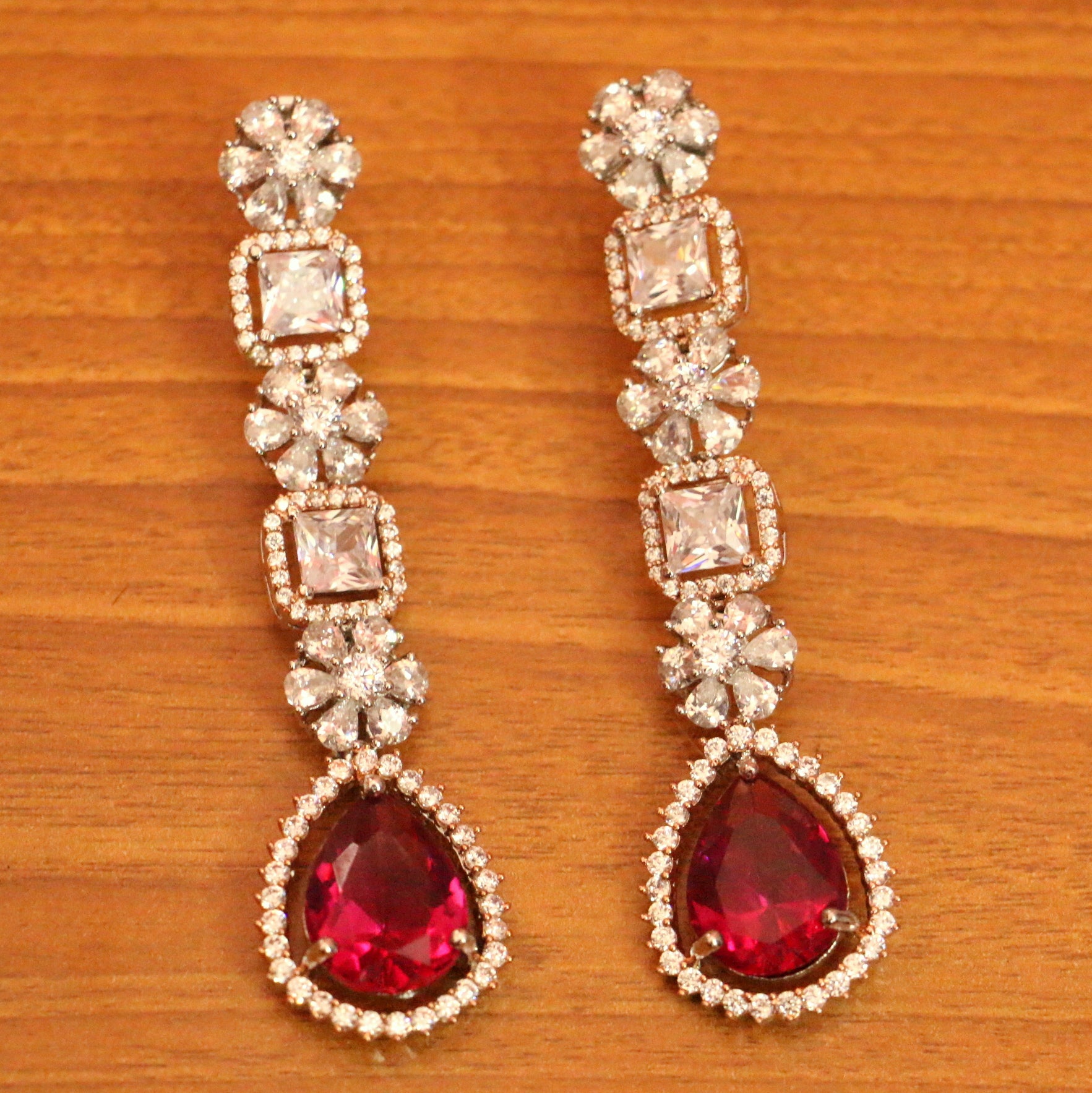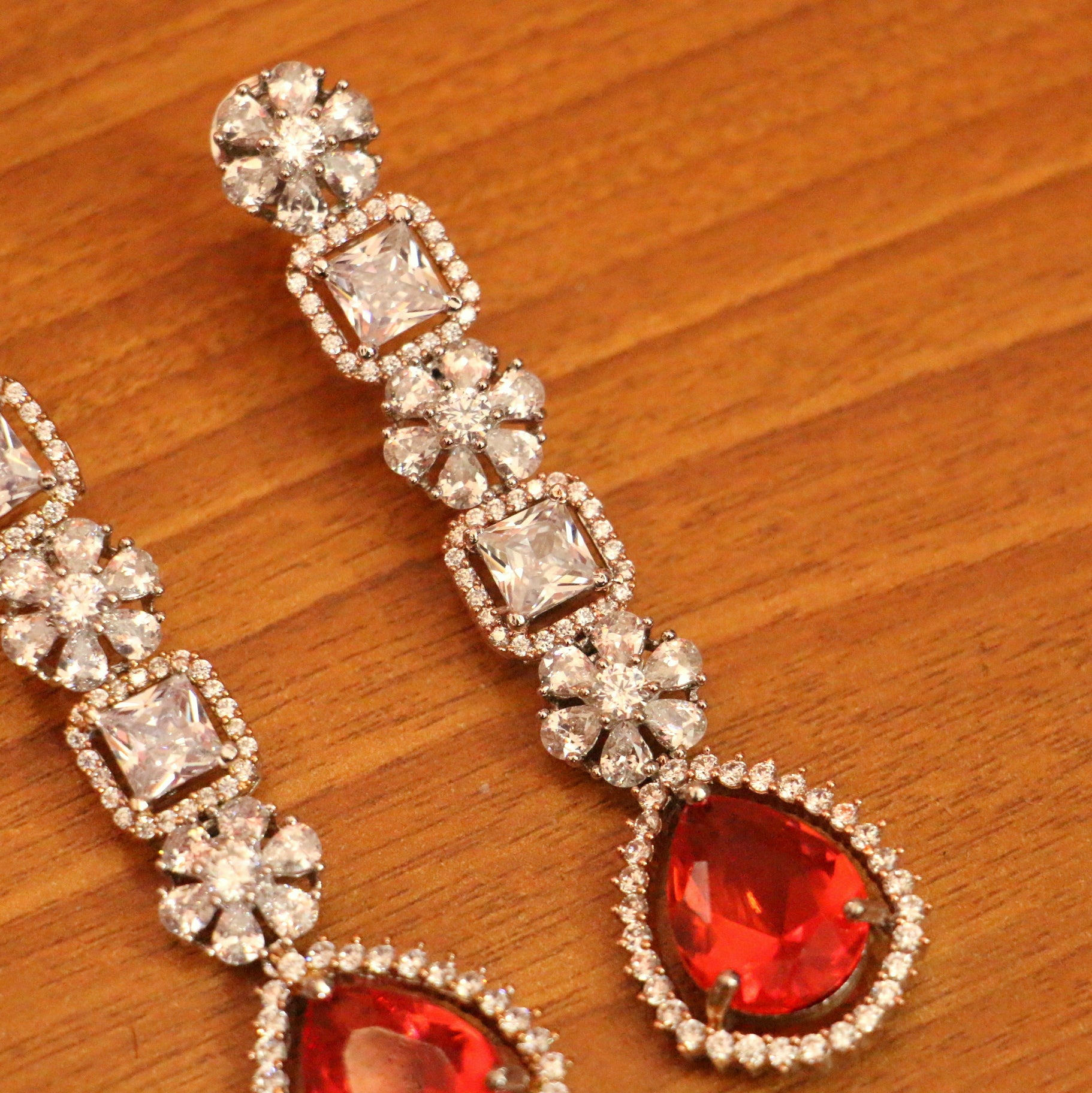 These earrings are handcrafted in silver alloy with imitation ruby & american diamond work of very fine quality. These artistic yet modern earrings are plated with high quality white gold rhodium. The earrings are very light in weight.