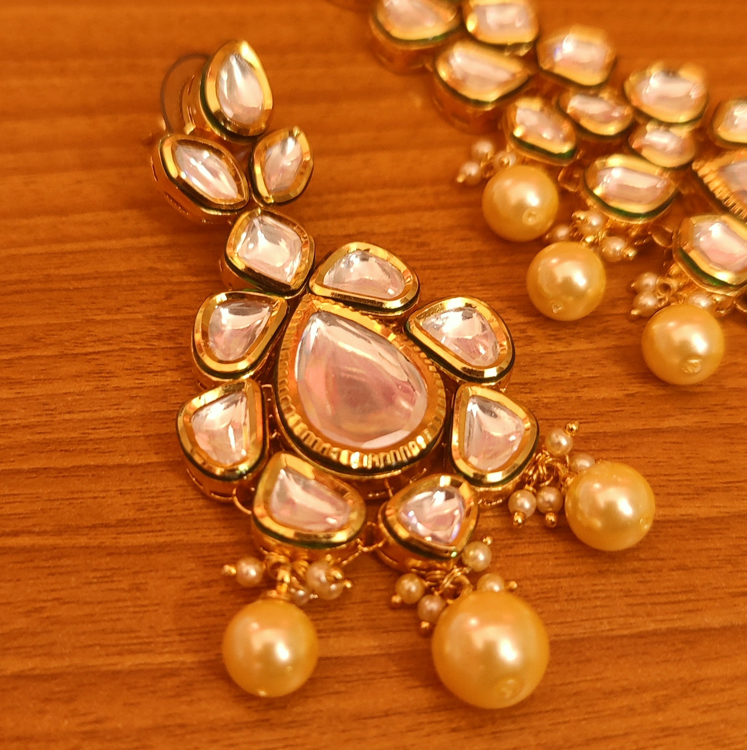 This beautiful necklace set is handcrafted in brass alloy with imitation semi precious pearls & beads and kundan with meenakari work of very fine quality . this necklace set is coated with 18 Kt gold polish which give them a unique look . an absolutely stunning piece to own and are very light in weight.