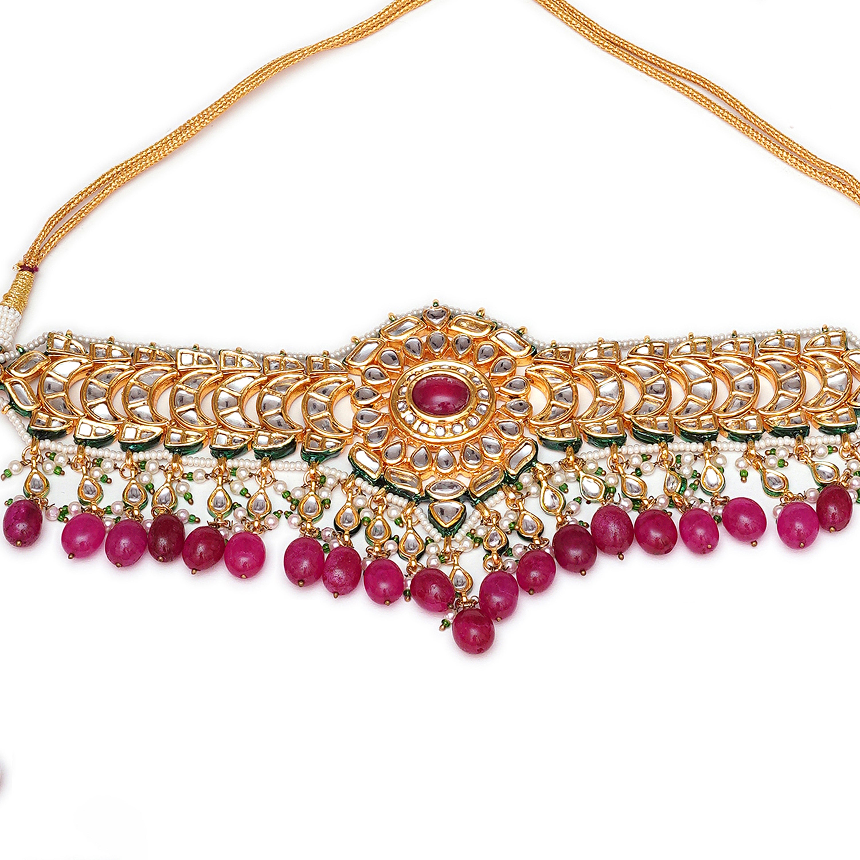 Elevate your style with our multicolour kundan polki necklace set ! Adorned with red and green stones, kundan polki stones, and meenakari work, this set is an 18kt gold plated treasure. The perfect matching earrings complete the unique look, perfect for weddings, parties, and special occasions. Embrace the trend and make your day even more special!
