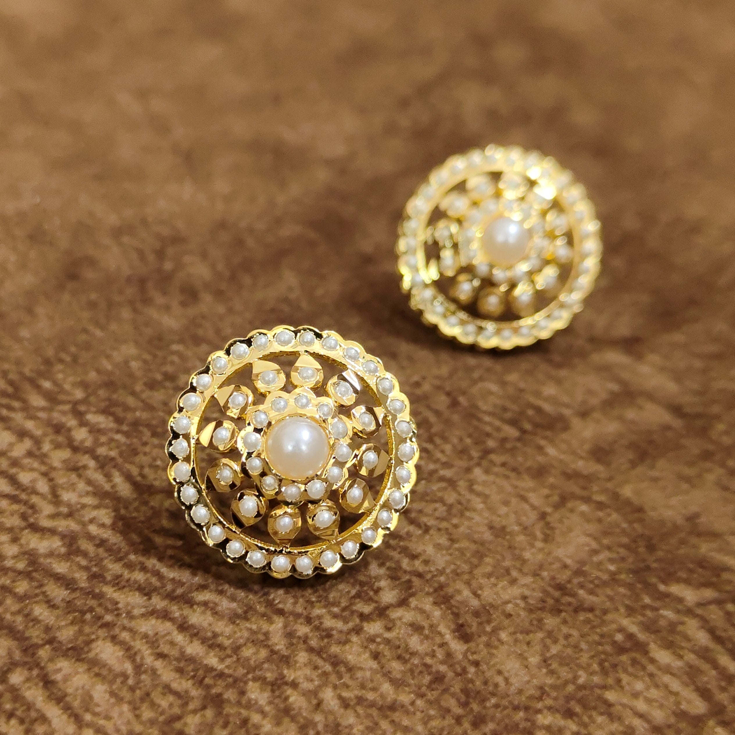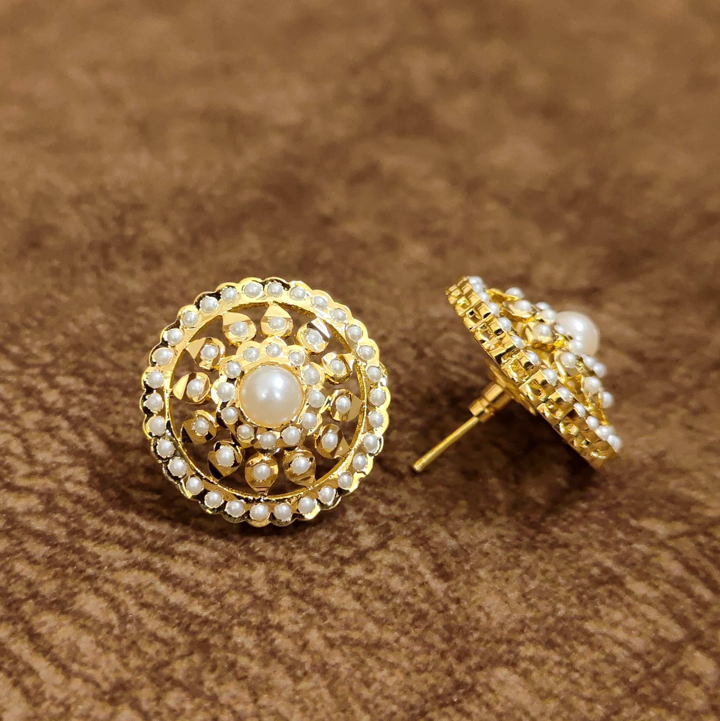 Elegant pearl temple stud earrings featuring a luminous pearl center surrounded by delicate pearl accents in a traditional floral design. These designer imitation jewellery earrings bring timeless Indian elegance, perfect for weddings, festive occasions, and ethnic styling worldwide.