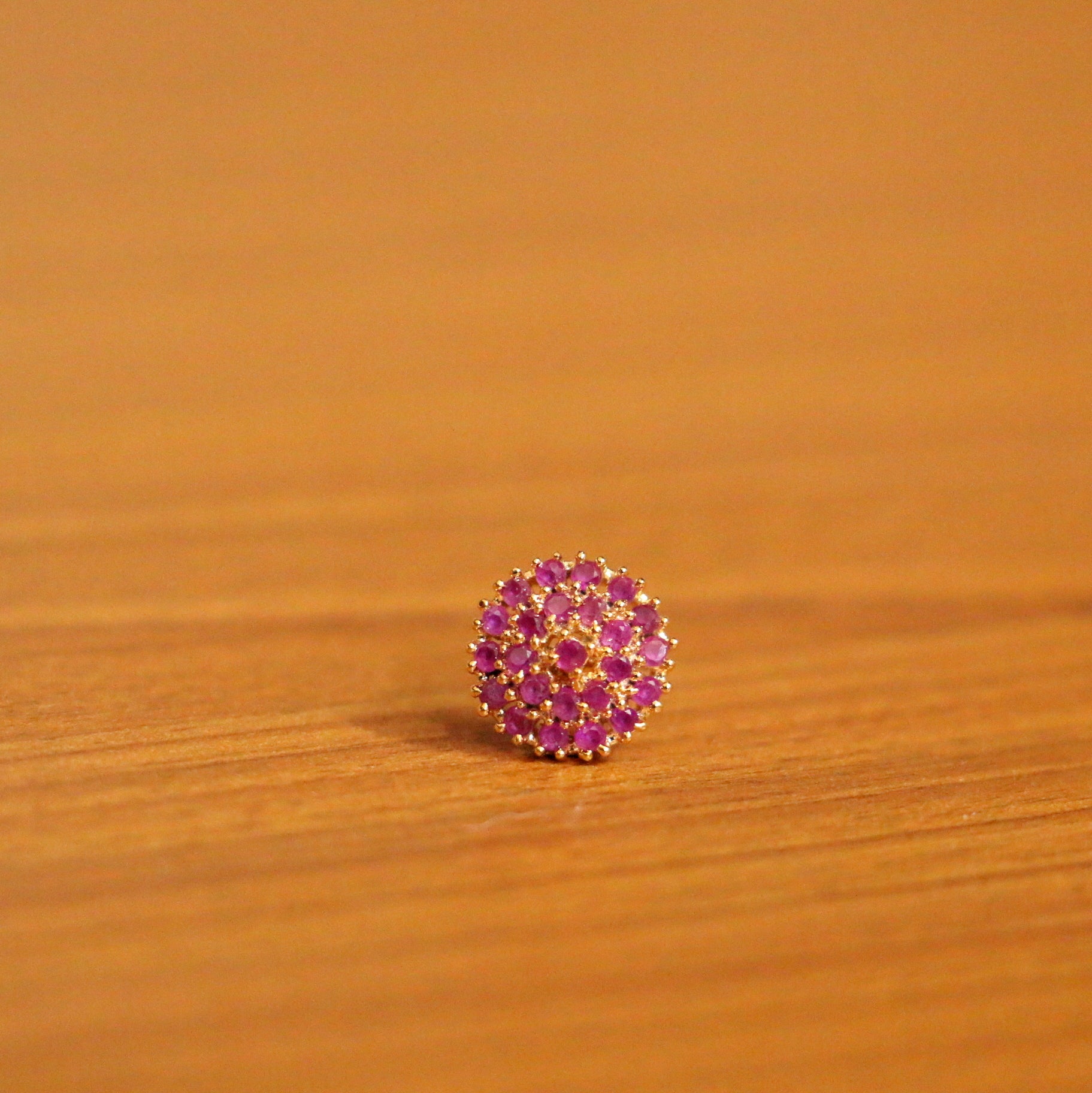 This round shaped piercing nose ring is handcrafted in silver alloy with imitation ruby colour cz stones of very fine quality , the nose ring is very light in weight and plated with 18kt gold rhodium to give it a real gold look.