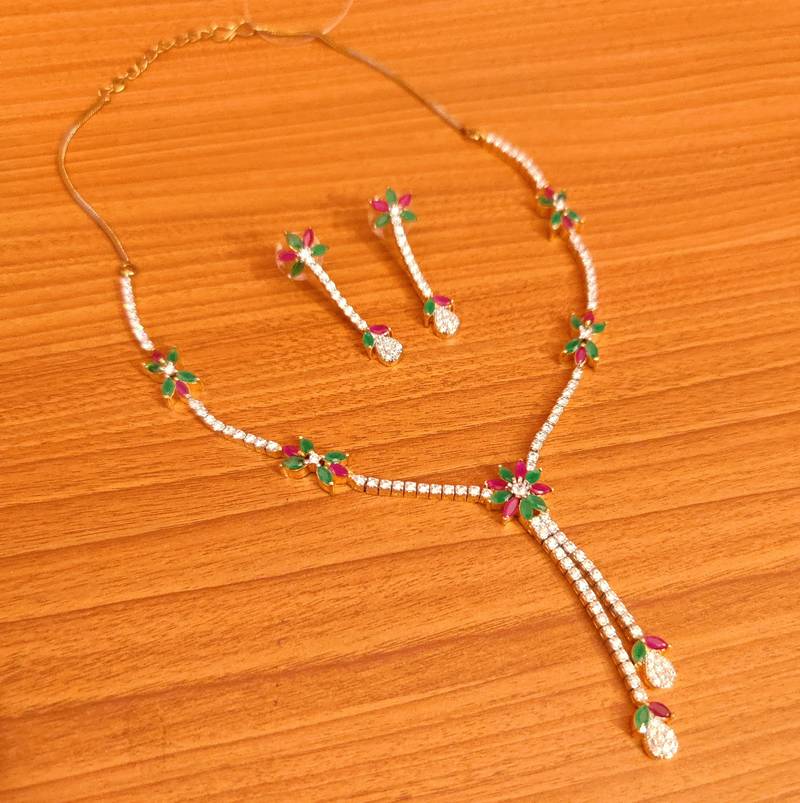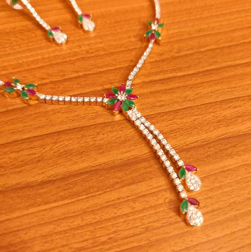 This beautiful necklace set is handcrafted in silver alloy with ruby& onyx fine quality Ameriacn diamonds, . This necklace set is coated with 18 kt gold polish which give them a unique look . An absolutely stunning piece to own and are very light in weight.