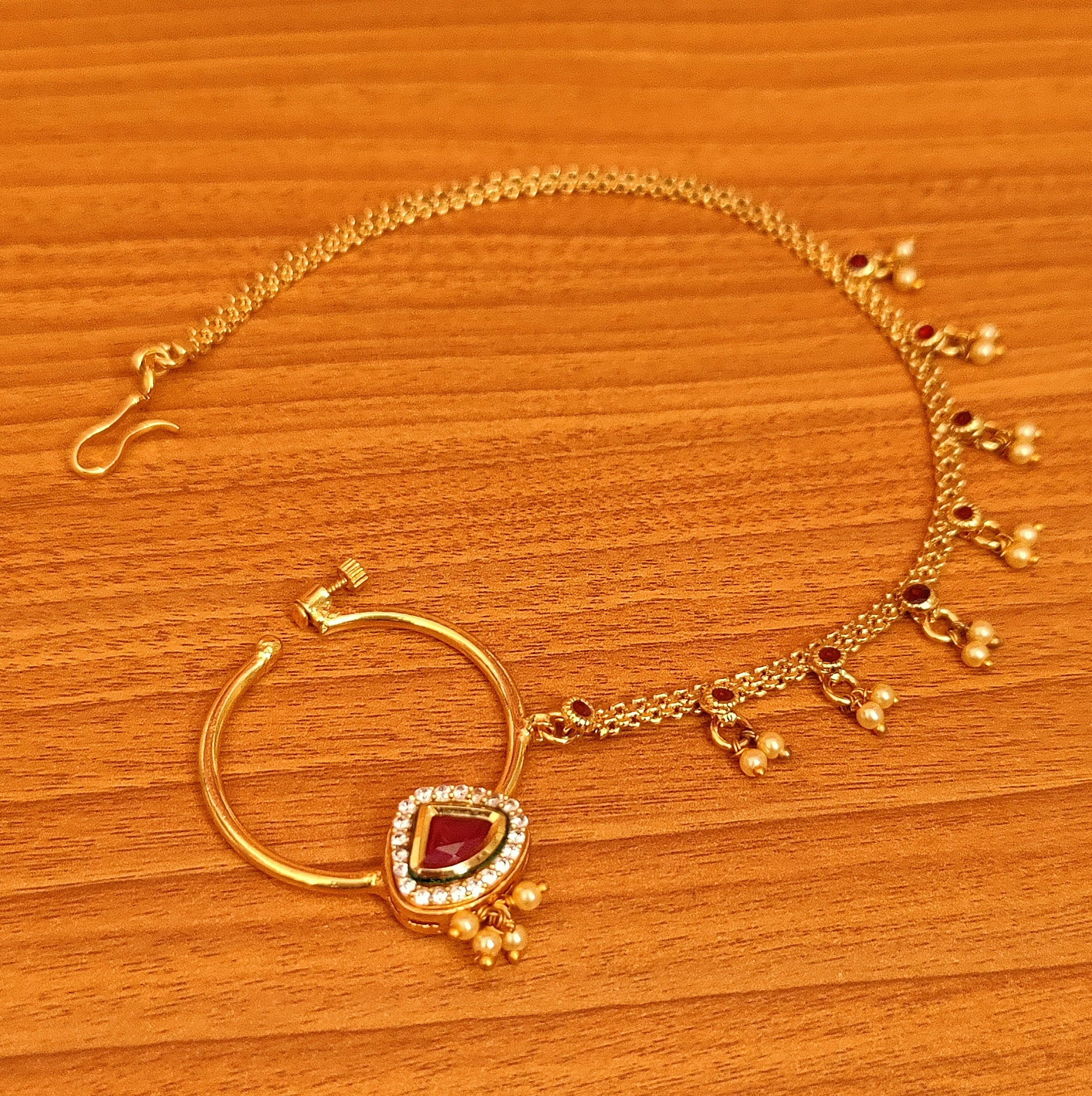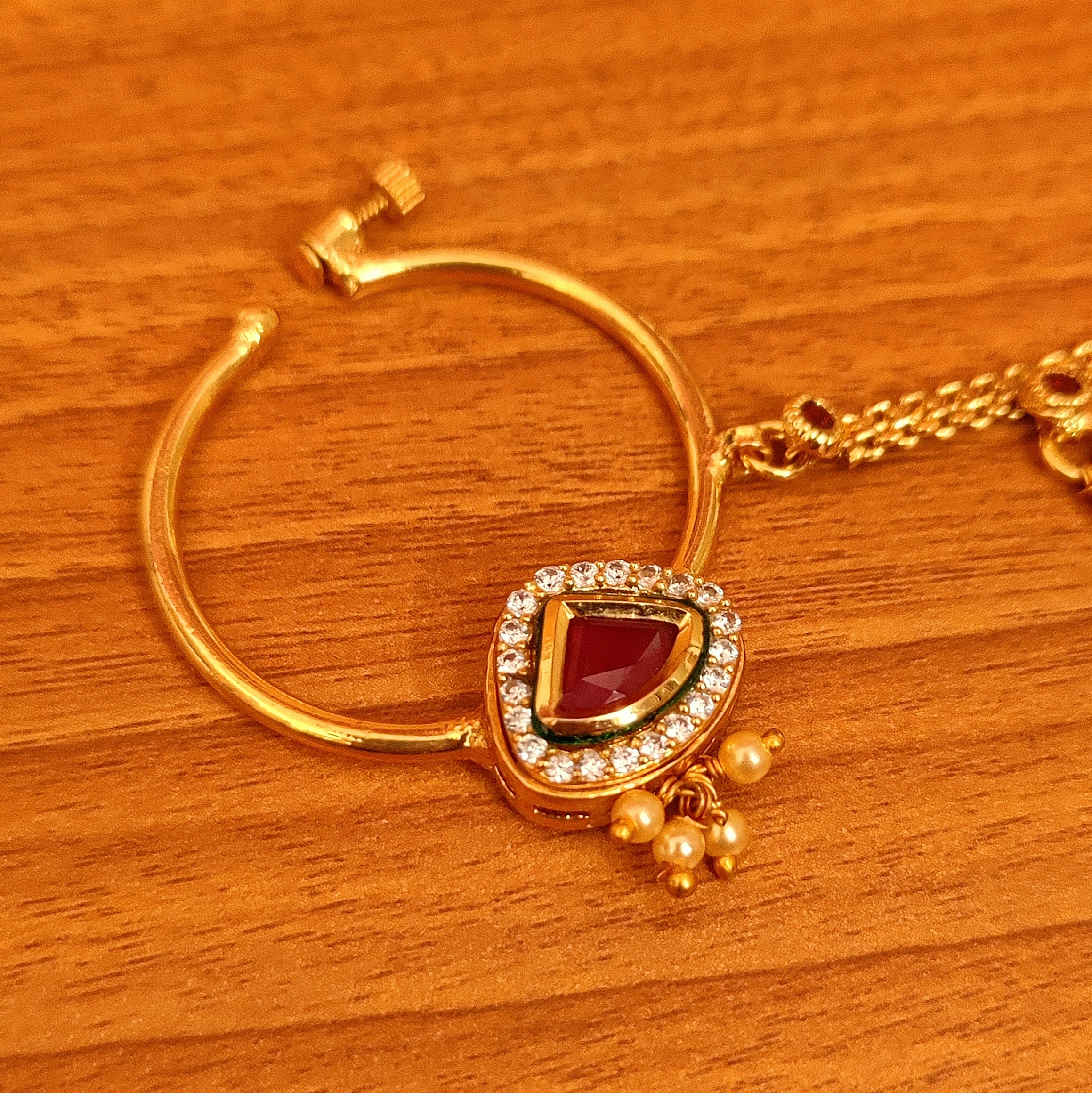 This beautiful nose ring is handcrafted in brass alloy with imitation red colour stone & cz stone and kundan with meenakari work of very fine quality . this nose ring is coated with 18 kt gold polish which give it a real look . an absolutely stunning piece to own and is very light in weight.