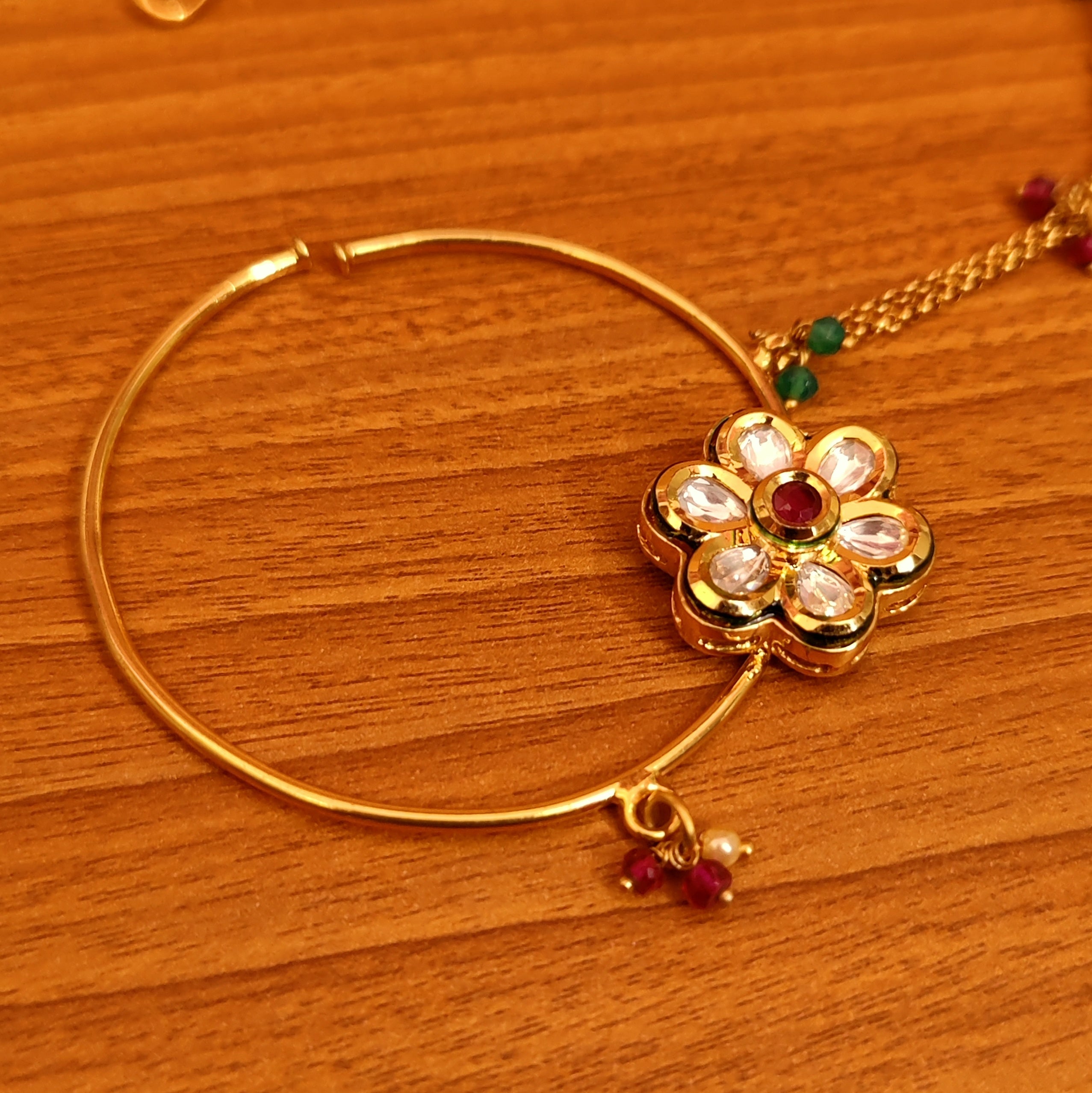 This beautiful nose ring is handcrafted in brass alloy with imitation red colour stone & multi layered and kundan with meenakari work of very fine quality . this nose ring is coated with 18 kt gold polish which give it a real look . an absolutely stunning piece to own and is very light in weight.