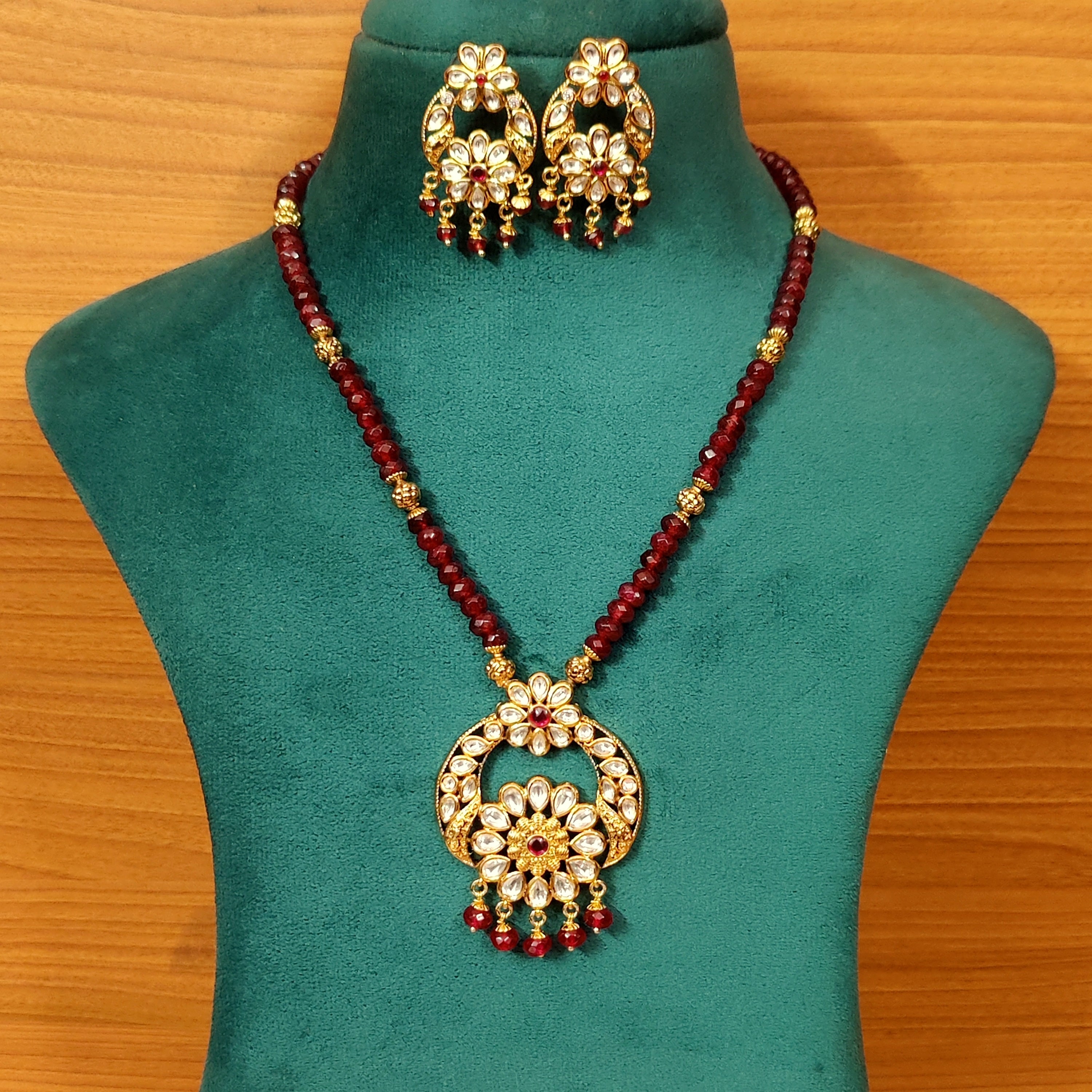 This handcrafted beautiful pendant set Is made in silver alloy with imitation ruby colour red stone & 6 mm beads and kundan polki stones of extremely fine quality. This gorgeous pendant set is handcrafted with fine engravings done with hand and is plated with antique 18kt nickle free gold rhodium that gives the design a real gold look . the pendant comes with a matching pair of earrings which are absolutely gorgeous and are very light in weight.